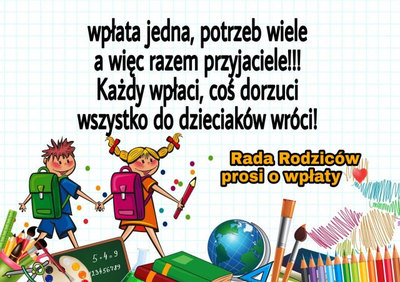 w związku ze zbliżającymi się Andrzejkami i Choinką szkolną prosimy o wpłatę na Radę Rodziców. Każda wpłata wraca do naszych dziedzi w różnej postaci. Dzięki wpłatom możemy wspierać, nagradzać, zachęcać do większej aktywności uczniów oraz uatrakcyjniać wydarzenia szkolne, np.: animator dla dzieci w czasie dyskoteki, itp.