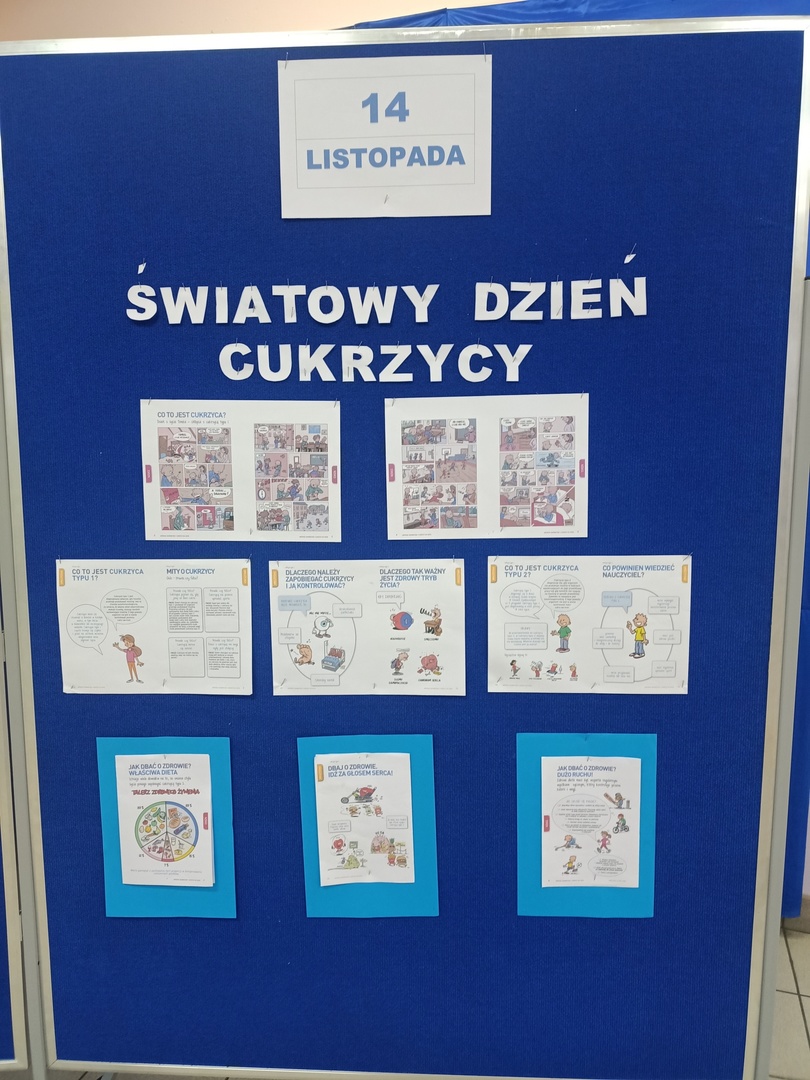 Uczniowie klasy 7 i 8 zostali zapoznani z podstawowymi objawami i zagadnieniami dotyczącymi cukrzycy. Po przeprowadzonej pogadance w starszych klasach została wykonana gazetka dla całej społeczności szkolnej, zawierająca plakaty z podstawowymi informacjami. Samokontrola i konsekwencja w działaniu to podstawy w terapii cukrzycy.