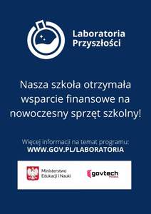 Idziemy z duchem czasów! Przystąpiliśmy do programu „Laboratoria Przyszłości”. Jest to inicjatywa edukacyjna realizowana przez Ministerstwo Edukacji i Nauki we współpracy z Centrum GovTech w Kancelarii Prezesa Rady Ministrów. Celem inicjatywy jest wsparcie wszystkich szkół podstawowych w budowaniu wśród uczniów kompetencji przyszłości z tzw. kierunków STEAM (nauka, technologia, inżynieria, sztuka oraz matematyka). W ramach programu otrzymaliśmy wsparcie finansowe i zakupiliśmy następujące sprzęty: