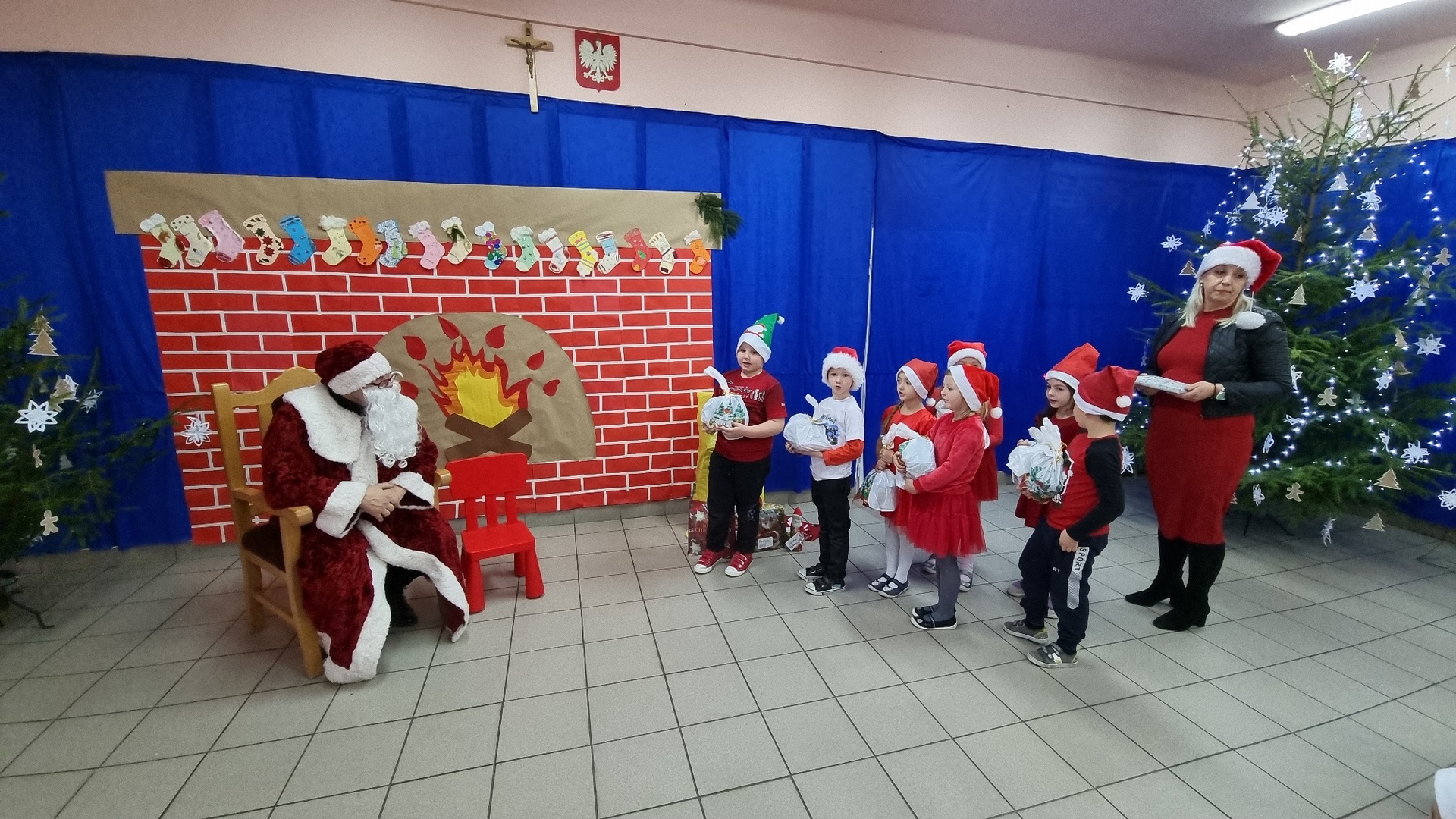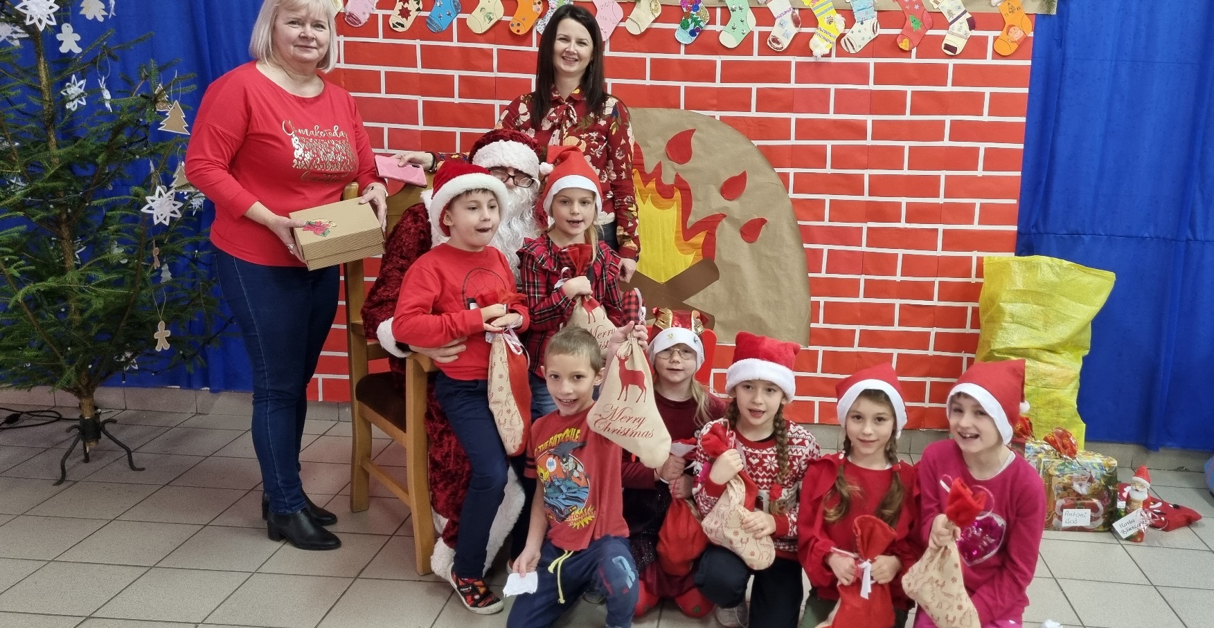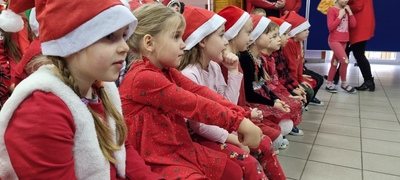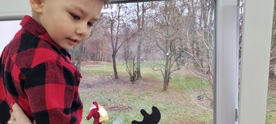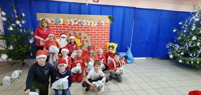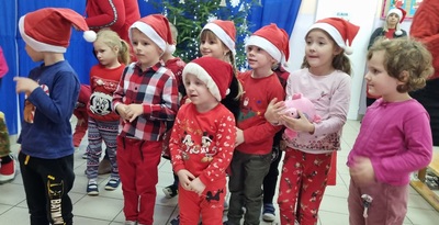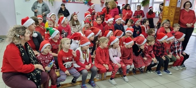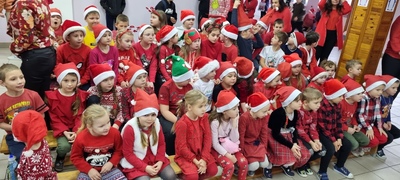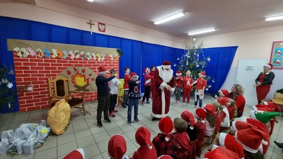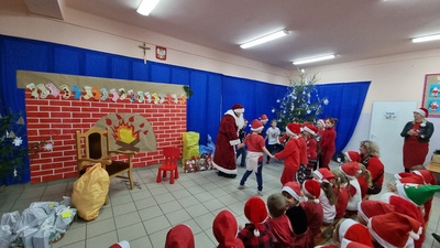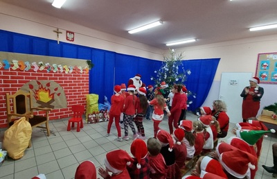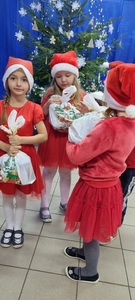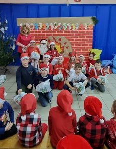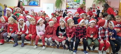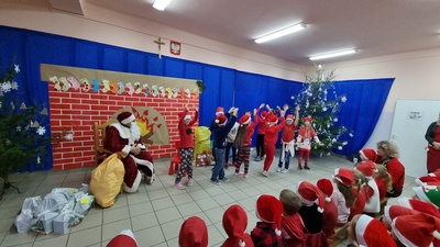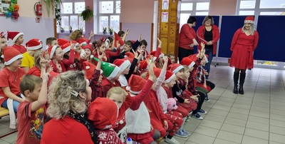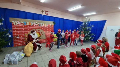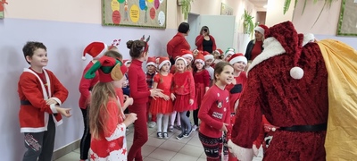 Trochę zaskoczyliśmy rodziców, bo z pobudką i wstawaniem jakoś nie było dzisiaj problemu, a nawet trochę nam się śpieszyło. Szybko więc czerwony strój, mikołajowa czapka i jesteśmy w swoich salach. Od tej chwili każdy szelest, hałas czy pukanie do drzwi powoduje szybsze bicie serca, a nawet wstrzymywanie oddechu. Podekscytowani wyglądamy na korytarz, by po chwili, zupełnie przez przypadek dostrzec Go, tuż za oknem, jak zgarbiony pod ciężarem worka, zmierza wprost do naszej szkoły.