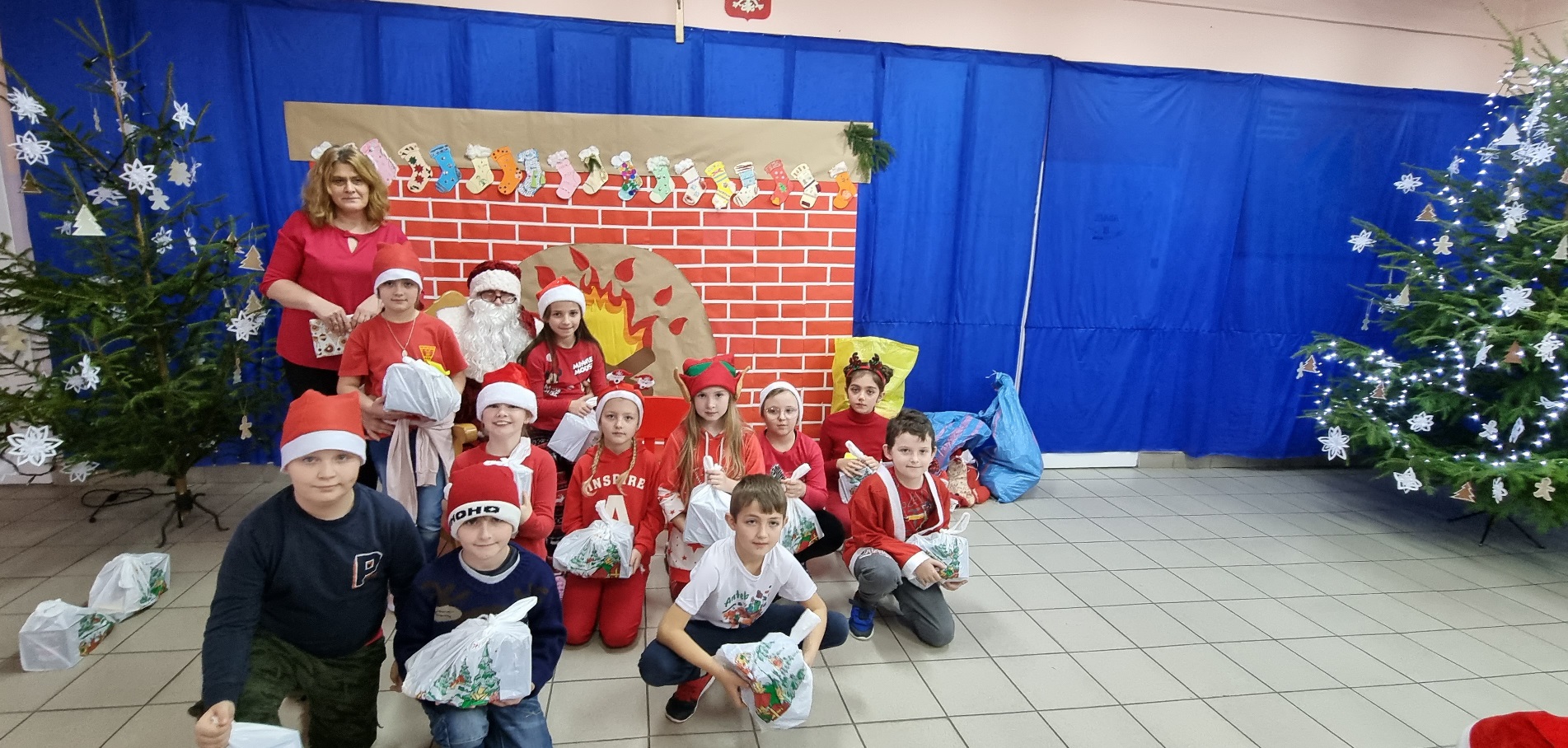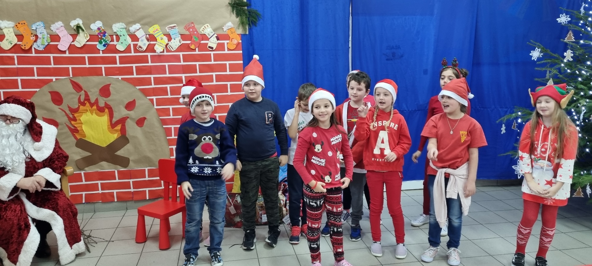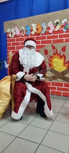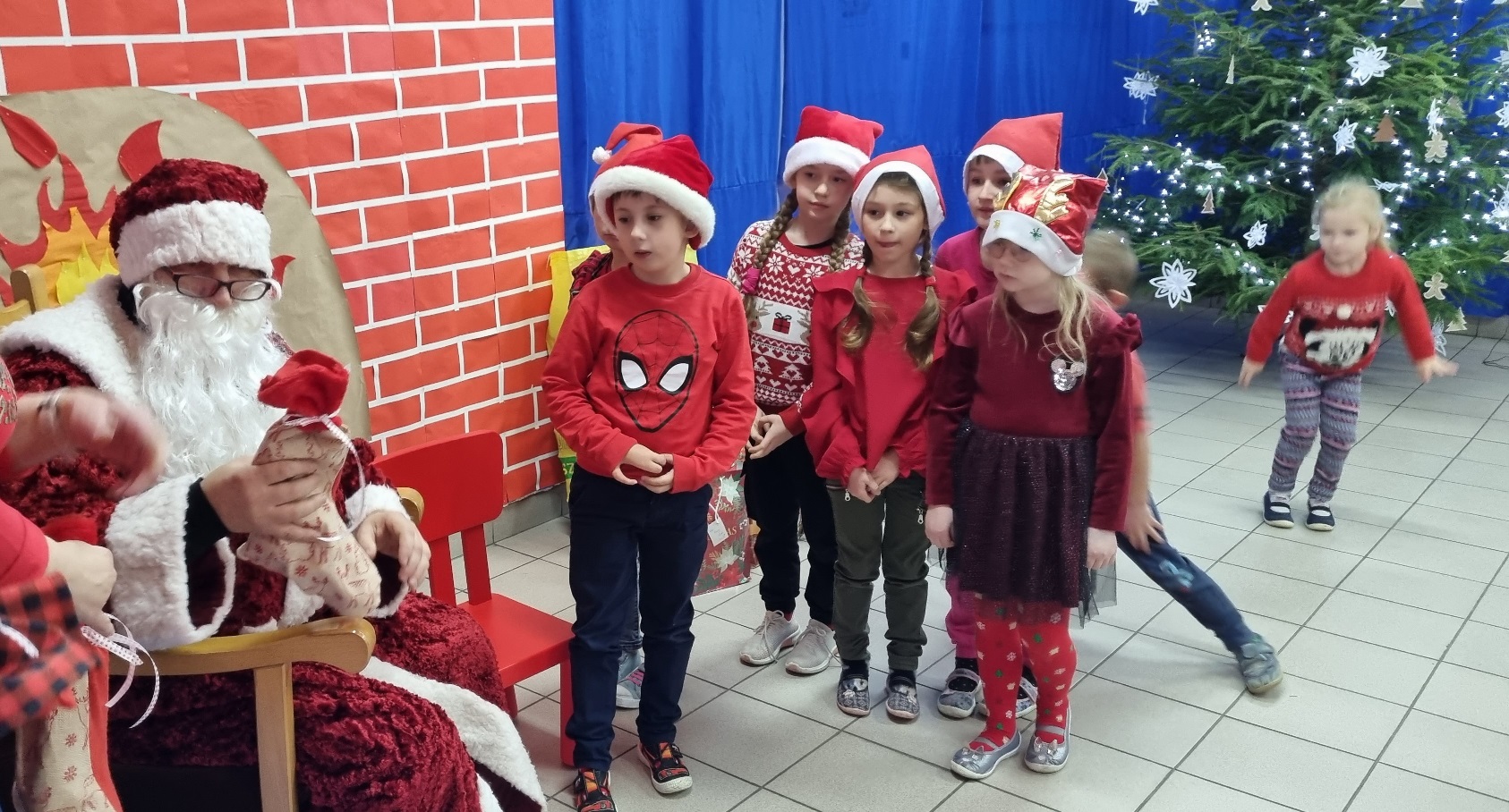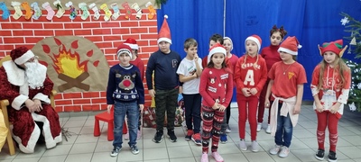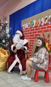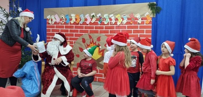 Nie było sensu pozostawać dłużej w sali, wybiegliśmy więc na korytarz, bo właśnie pojawił się w drzwiach wejściowych. Po krótkim, ale serdecznym powitaniu, zaprosiliśmy naszego gościa na górę, aby w wygodnym fotelu, przy kominku trochę odpoczął. Mikołaj jednak nie wydawał się być zmęczonym, szybko przyłączył się do tańca drugoklasistów, by już po chwili obdarować nas prezentami. Niczym prawdziwy gwiazdor pozował do zdjęć z przedszkolakami i uczniami klas początkowych. Pozostało nam tylko krótko podziękować i pożegnać się, bo jeszcze klasy starsze.