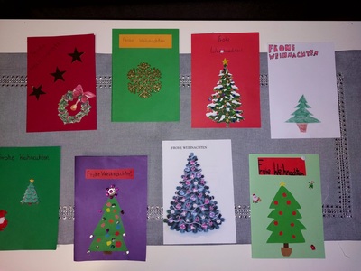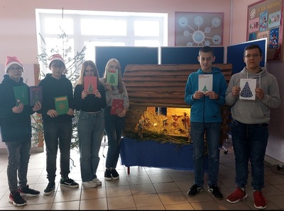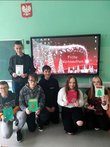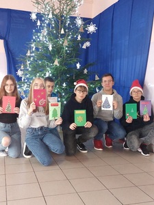 Uczniowie klasy VII własnoręcznie i z dużym zaangażowaniem przygotowywali kartki bożonarodzeniowe. Zabawę połączyli z nauką, ponieważ życzenia, które popłynęły do kolegów i koleżanek, zostały zapisane w języku niemieckim. Czego życzyli sobie wzajemnie uczniowie biorący udział w wymianie kartek? Frohe Weihnachten, Gesundheit, gute Noten, viele Geschenke, einen guten Rutsch ins neue Jahr.
