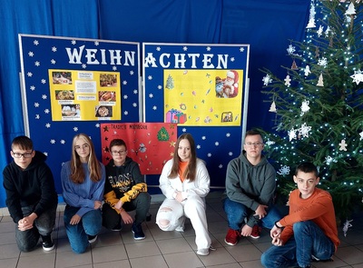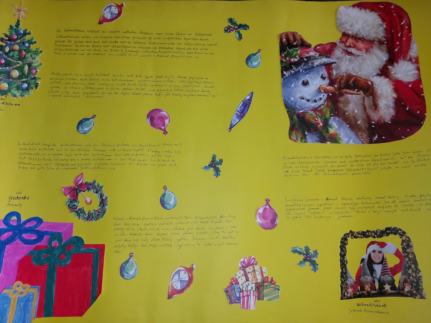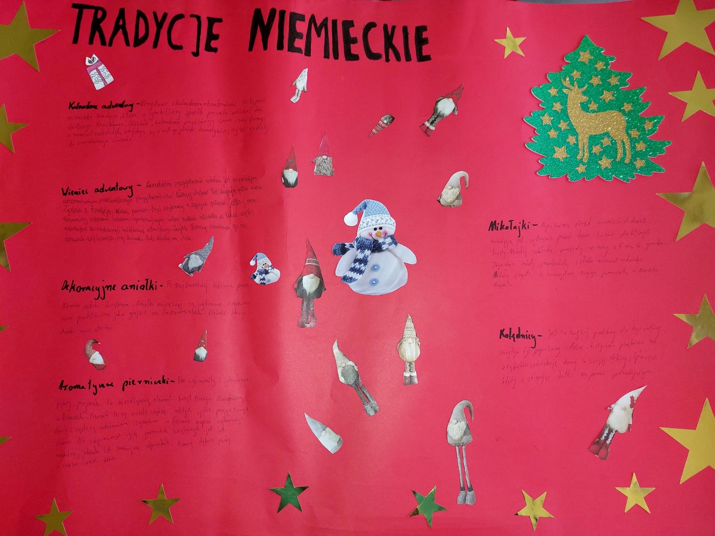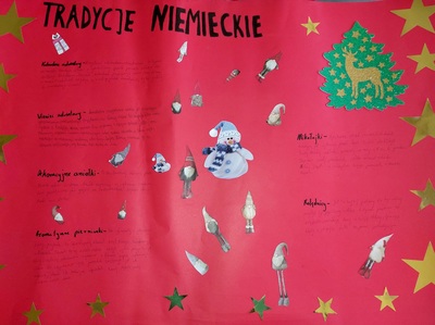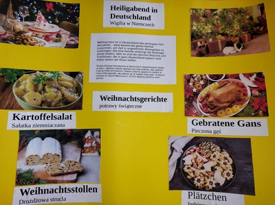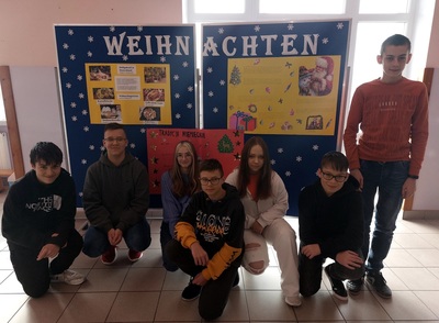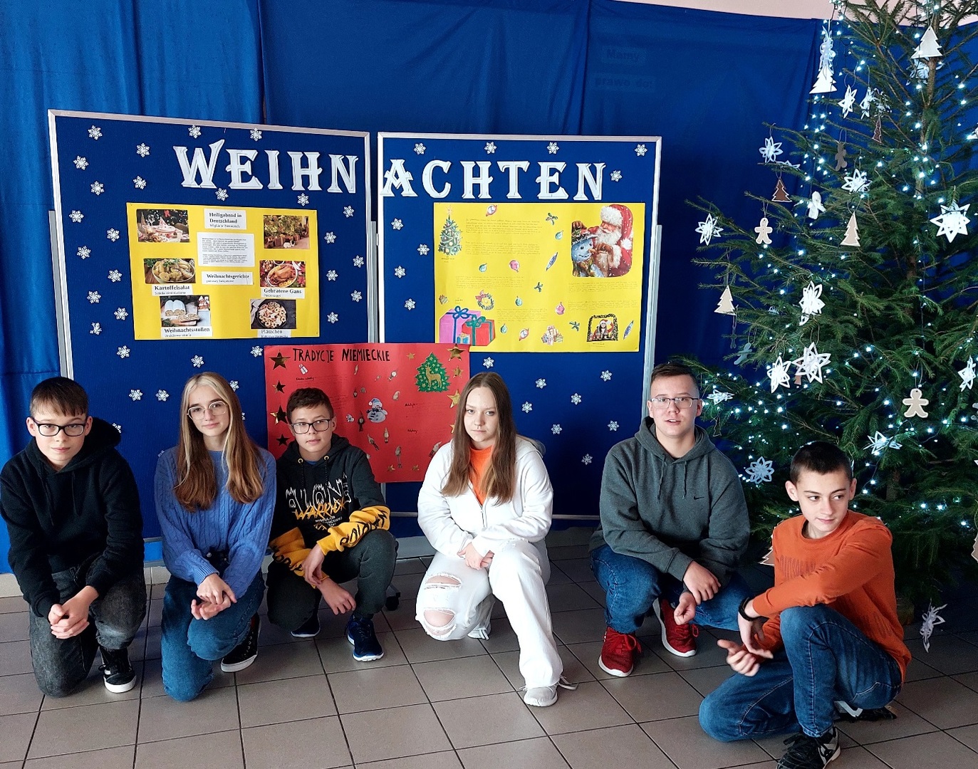 Uczniowie klasy VII przygotowali projekty na temat Świąt Bożego Narodzenia w języku niemieckim, które były efektem pracy indywidualnej i grupowej pracy. Przedstawili po niemiecku słownictwo związane z tradycjami świątecznymi, potrawami wigilijnymi, jakie najczęściej goszczą na stołach w Niemczech. Poza tym przygotowali informacje o Mikołaju, wieńcu adwentowym. Wszystkie prezentacje przygotowane przez uczniów naszej szkoły były na bieżąco przedstawiane i omawiane na forum klasy.