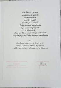 Wysyłanie kartek świątecznych to wspaniała tradycja, która niestety z roku na rok coraz bardziej zanika. Coraz więcej osób składa życzenia świąteczne wysyłając smsa bądź maila. Jednak chyba sami przyznacie, że otrzymanie pięknej kartki świątecznej jest o wiele przyjemniejszą formą. Dlatego też, Samorząd Uczniowski, jak co roku, przygotował własnoręcznie kartki dla emerytowanych nauczycieli i pracowników Naszej Szkoły, władz gminy, osób współpracujących ze szkołą oraz z pomocą Rady Rodziców piękne Stroiki Bożonarodzeniowe.