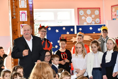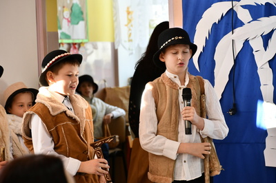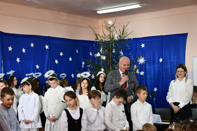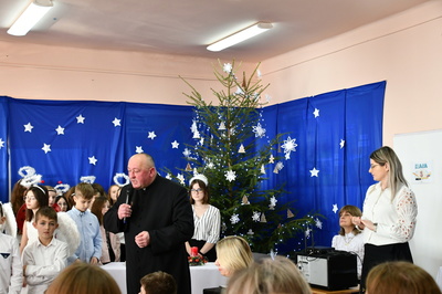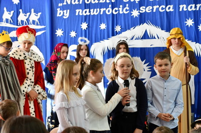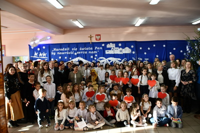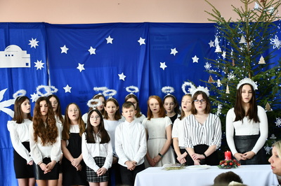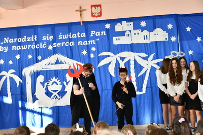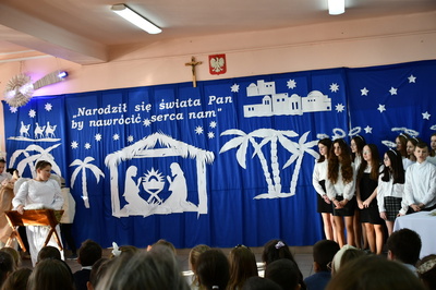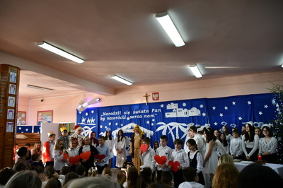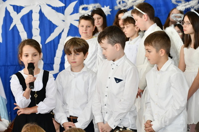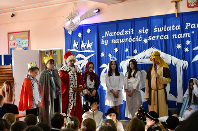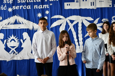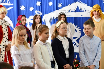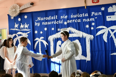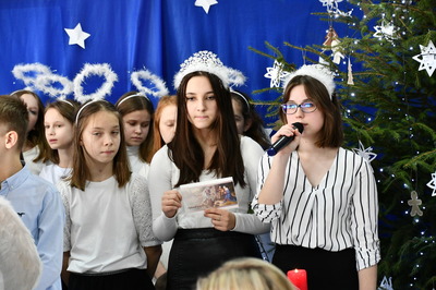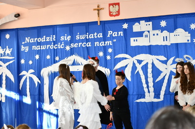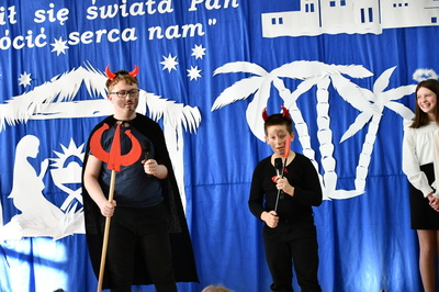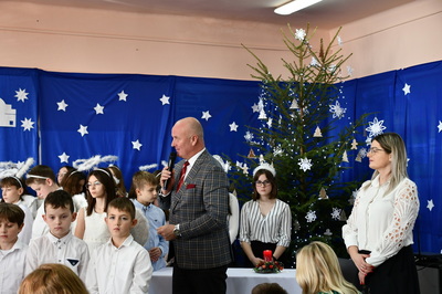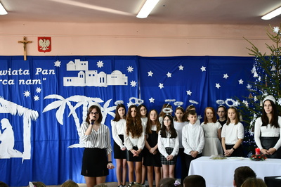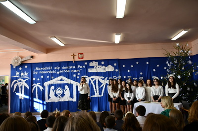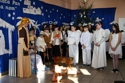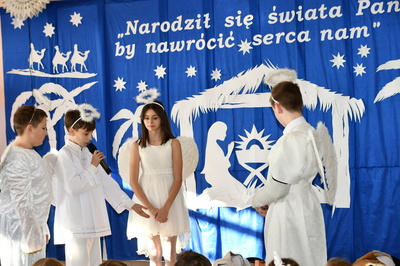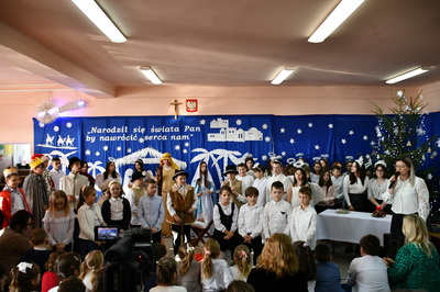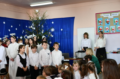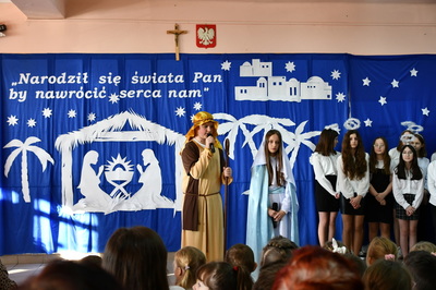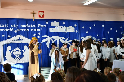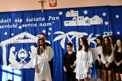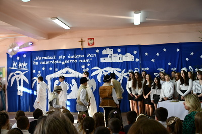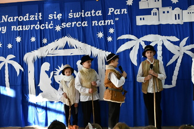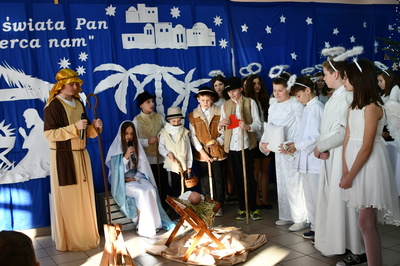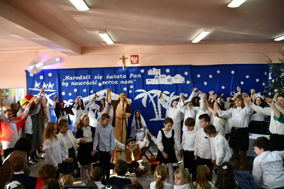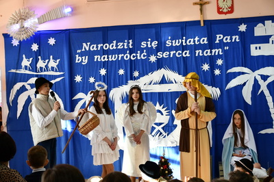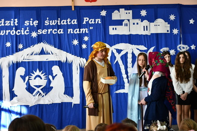 Jest taki dzień, magiczny dzień radości i dobrych życzeń, obchodzony niemalże pod każdą szerokością geograficzną w atmosferze ciepła i miłości. Dzień, który często pozostawia wiele pięknych wspomnień. Czas oczekiwania na Boże Narodzenie należy do najpiękniejszych w roku. Ze Świętami Bożego Narodzenia wiąże się wiele pięknych tradycji i zwyczajów. 22.12.2022 roku od godz. 10.00 w świątecznej, pełnej radości atmosferze uczniowie naszej szkoły spożywali tradycyjne dania wigilijne a o 12.00 powitali przybyłych gości a następnie zaprezentowali Jasełka , które przybliżyły najmłodszym historię narodzin Jezusa Chrystusa a pozostałym widzom pokazały jak młodzi ludzie współcześnie odbierają naukę płynącą z Bożego Narodzenia. Do jasełek zaangażowani zostali uczniowie z klas IV, V, VI, VII ,VIII i II . Oprócz głównych bohaterów – Maryi, Józefa i Jezusa, którzy znaleźli schronienie w stajence - pojawili się pasterze, trzej królowie oraz komiczne diabełki. Z drugiej strony sceny stał anielski chór. Dzięki niemu występy przeplatane były kolędami i pastorałkami. Do tego efektowne stroje. Widzowie poczuli świąteczny klimat. Przed zakończeniem spotkania uczniowie zwrócili się do gości z opłatkiem i życzeniami. Jasełka bardzo się podobały. Młodzi artyści za piękny występ zostali nagrodzeni brawami jak również ciepłymi słowami płynącymi pod ich adresem od pani Dyrektor oraz przemawiających gości.