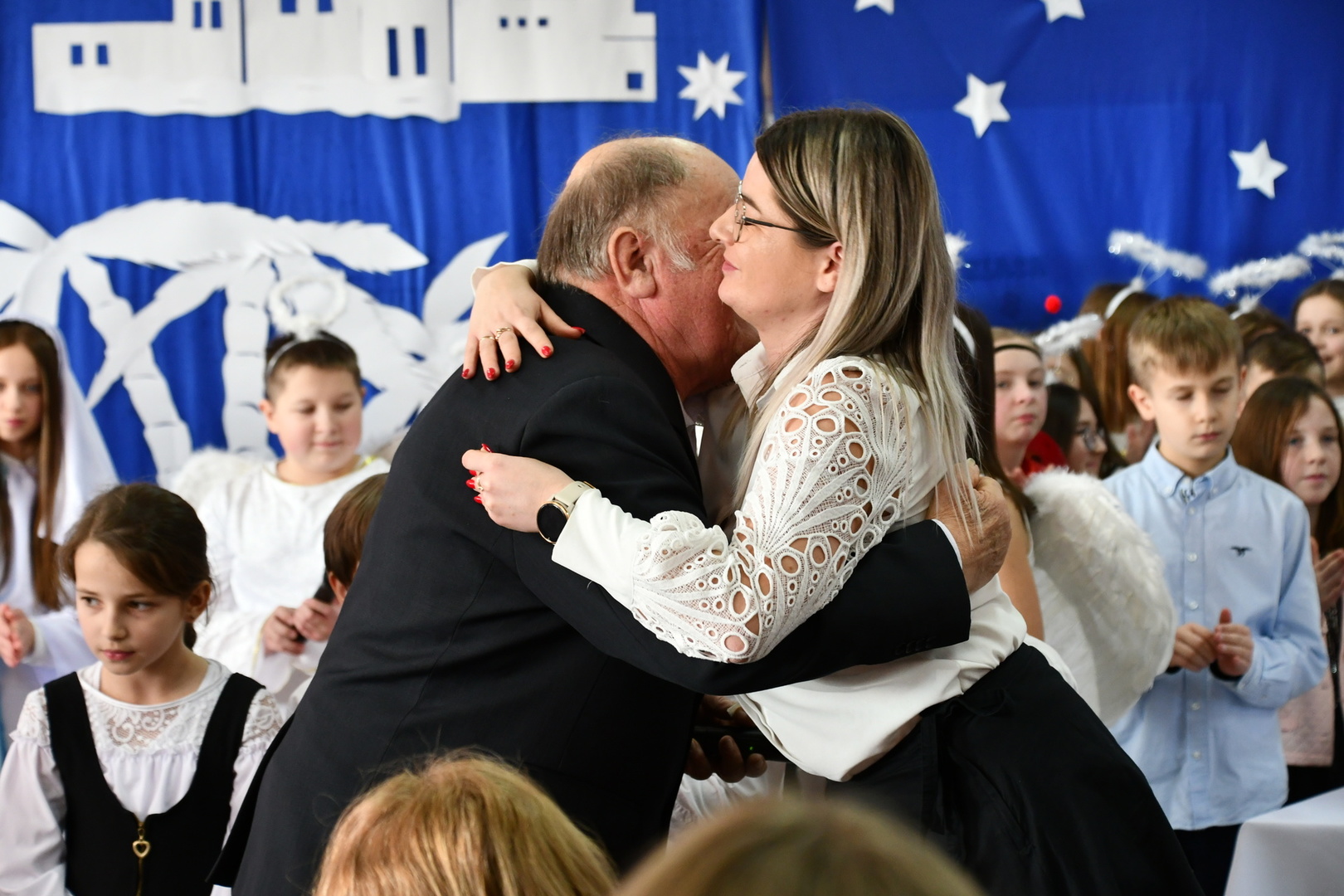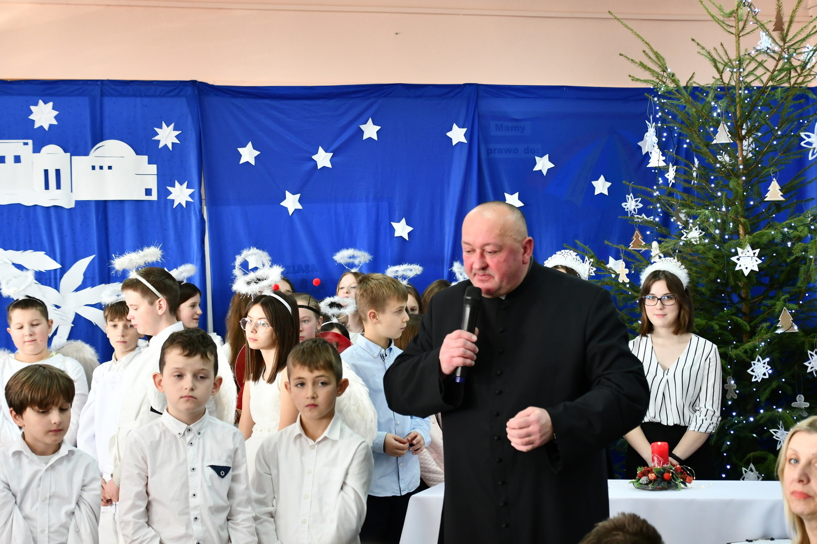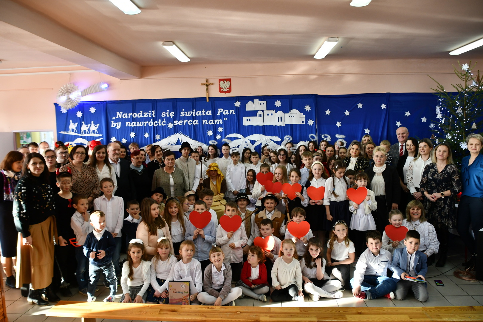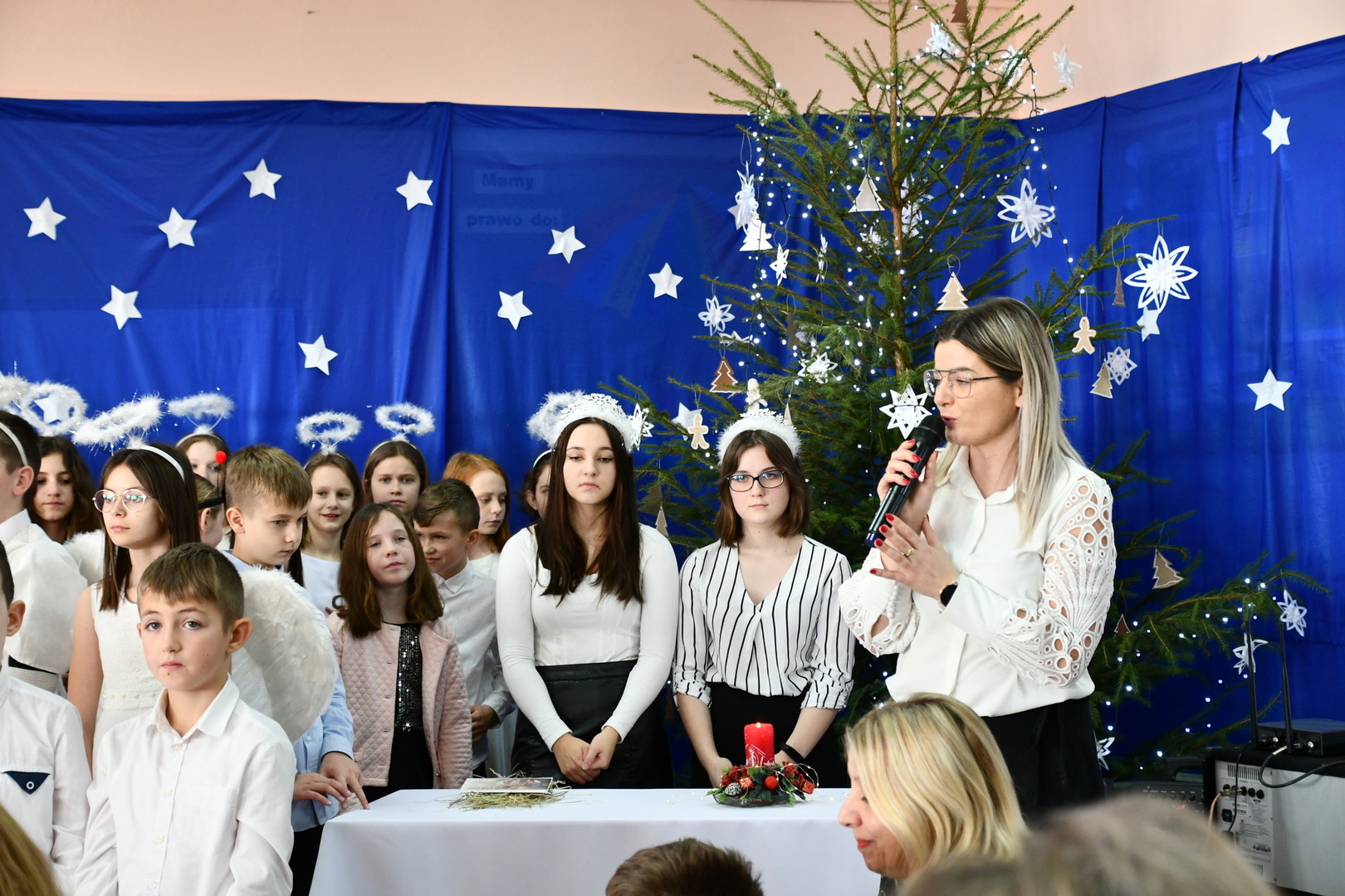 Jest taki dzień, magiczny dzień radości i dobrych życzeń, obchodzony niemalże pod każdą szerokością geograficzną w atmosferze ciepła i miłości. Dzień, który często pozostawia wiele pięknych wspomnień. Czas oczekiwania na Boże Narodzenie należy do najpiękniejszych w roku. Ze Świętami Bożego Narodzenia wiąże się wiele pięknych tradycji i zwyczajów. 22.12.2022 roku od godz. 10.00 w świątecznej, pełnej radości atmosferze uczniowie naszej szkoły spożywali tradycyjne dania wigilijne a o 12.00 powitali przybyłych gości a następnie zaprezentowali Jasełka , które przybliżyły najmłodszym historię narodzin Jezusa Chrystusa a pozostałym widzom pokazały jak młodzi ludzie współcześnie odbierają naukę płynącą z Bożego Narodzenia. Do jasełek zaangażowani zostali uczniowie z klas IV, V, VI, VII ,VIII i II . Oprócz głównych bohaterów – Maryi, Józefa i Jezusa, którzy znaleźli schronienie w stajence - pojawili się pasterze, trzej królowie oraz komiczne diabełki. Z drugiej strony sceny stał anielski chór. Dzięki niemu występy przeplatane były kolędami i pastorałkami. Do tego efektowne stroje. Widzowie poczuli świąteczny klimat. Przed zakończeniem spotkania uczniowie zwrócili się do gości z opłatkiem i życzeniami. Jasełka bardzo się podobały. Młodzi artyści za piękny występ zostali nagrodzeni brawami jak również ciepłymi słowami płynącymi pod ich adresem od pani Dyrektor oraz przemawiających gości.