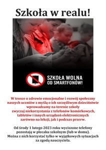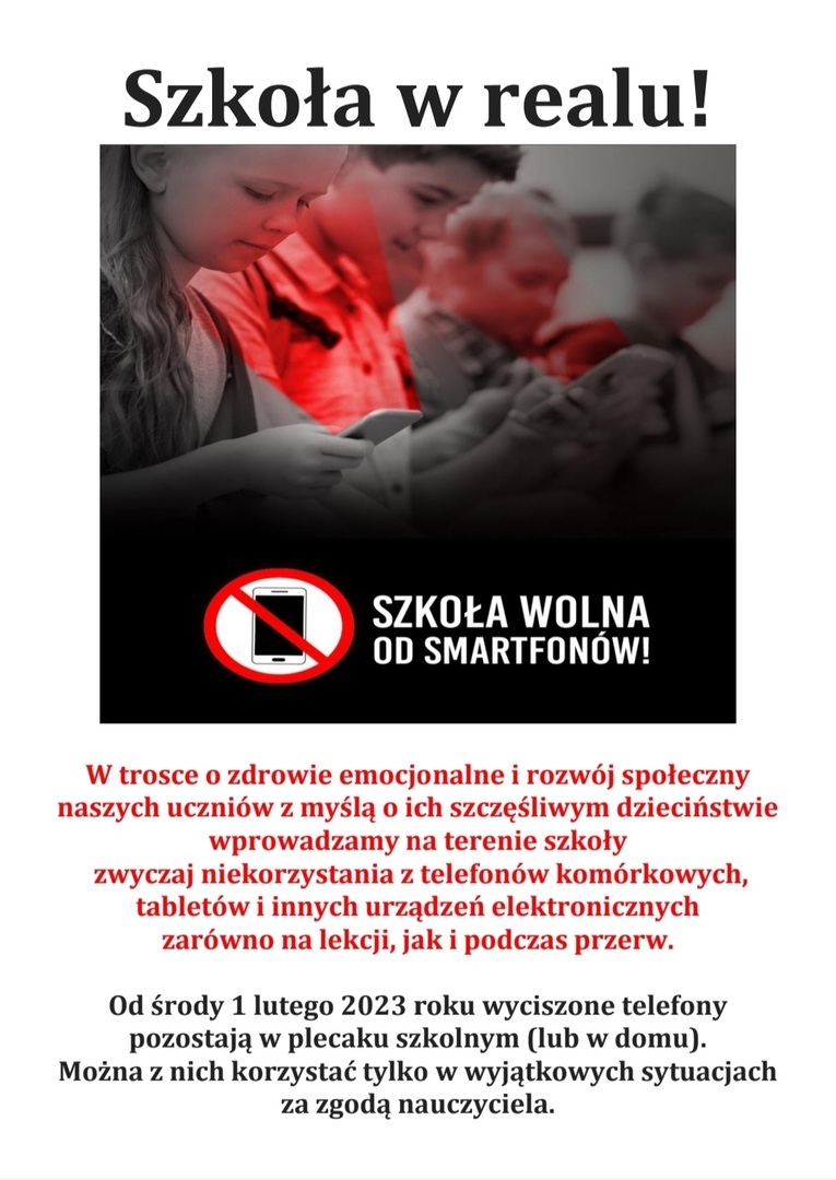 Od środy 1 lutego 2023 roku wyciszone telefony pozostają w plecaku szkolnym (lub w domu). Można z nich korzystać tylko w wyjątkowych sytuacjach za zgodą nauczyciela.