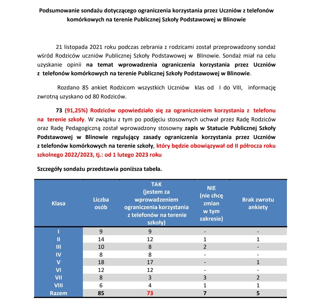 W zwiazku z powyższym przedstawiamy podsumowanie sondażu dotyczącego ograniczenia korzystania z telefonów na terenie szkoły.