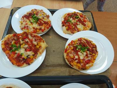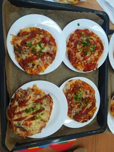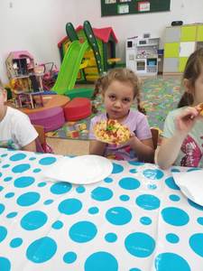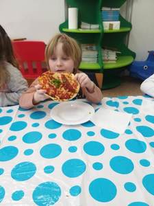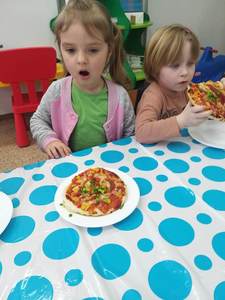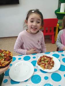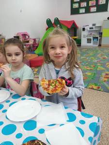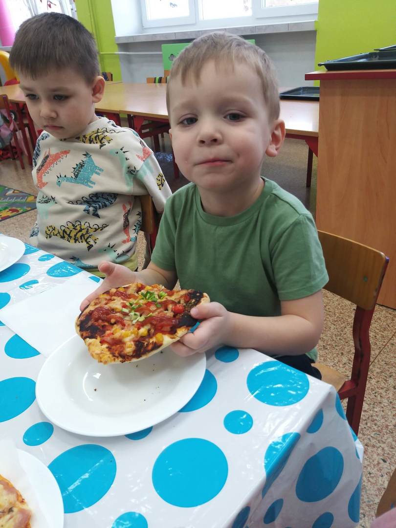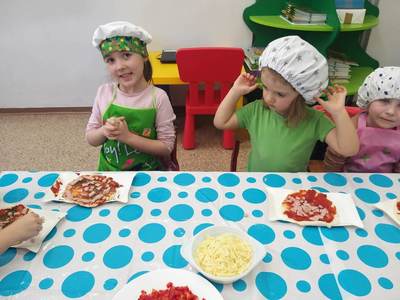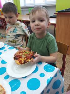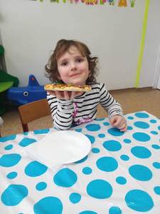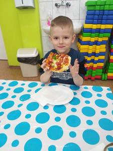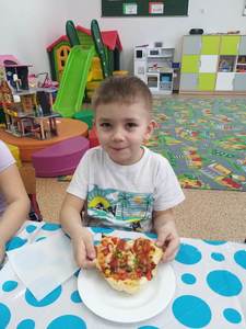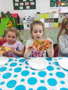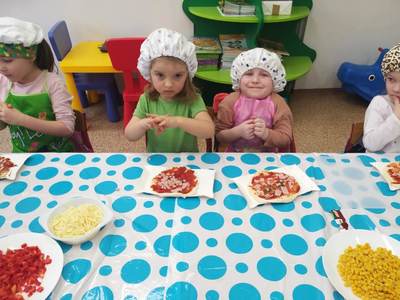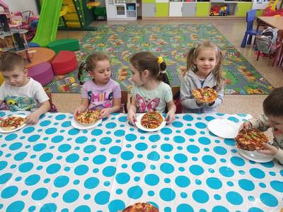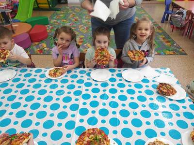 🍕🍕🍕Pizza - któż z nas nie lubi tego włoskiego specjału? Tak się składa, że to właśnie dzisiaj, 9 lutego ma ona swój wielki dzień. Z tej okazji, przedszkolaki wraz ze swoimi paniami, postanowiły wcielić się w prawdziwych włoskich kucharzy🧑🍳 i własnoręcznie przygotować ten niezwykły przysmak. Dzieci wystrojone w fartuszki i czepki kucharskie z wielkim zaangażowaniem zabrały się do pracy. Kroiły szynkę, ser, paprykę i szczypiorek🧀🫑, a następnie rozkładały te produkty na wcześniej przygotowanym cieście. Gdy wszystko było już gotowe, pizze trafiły do piekarnika. Wreszcie nadeszła długo wyczekiwana chwila - poczęstunek. Przepis najwyraźniej okazał się bardzo dobry, bo pizza bardzo wszystkim smakowała. Swoimi kulinarnymi zdolnościami, przedszkolaki pochwaliły się przed Panią Dyrektor, którą poczęstowały tym włoskim specjałem.