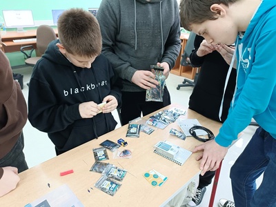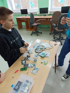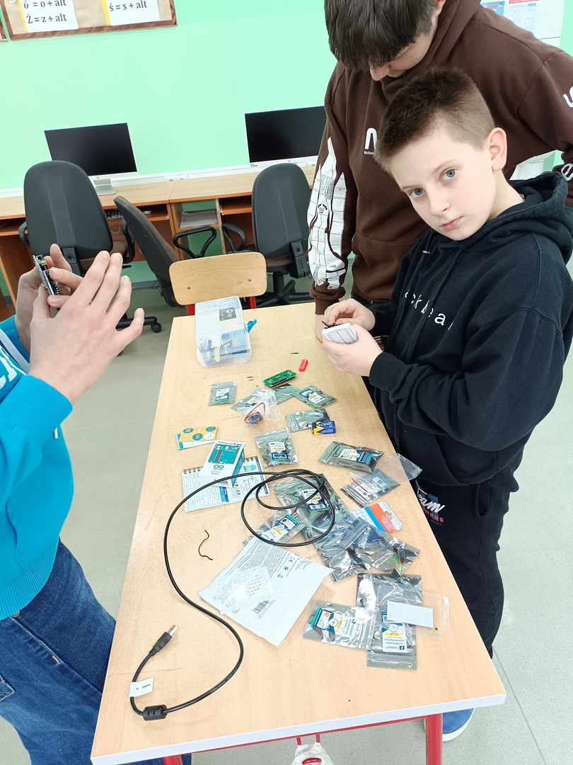 Uczniowie klasy VI i VIII montują obwody elektroniczne z zestawów otrzymanych w ramach programu "Laboratorium Przyszłości" z opiekunem Andrzejem Białkiem.