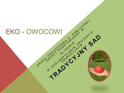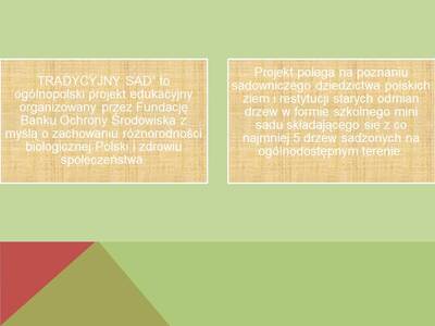 Aby zdobyć wiedzę na temat umiejętnej uprawy i walorów zdrowotnych owoców z drzew tradycyjnych odmian, pod kierunkiem pani, Moniki Lewandowskiej przystąpiliśmy do projektu „Tradycyjny sad”. Jego celem jest poznanie sadowniczego dziedzictwa polskich ziem i restytucji starych odmian drzew w formie szkolnego mini sadu, składającego się, z co najmniej 5 drzew sadzonych na ogólnodostępnym terenie ( w szóstej edycji posadzimy jabłonie i śliwy).