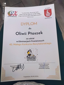 Dnia 06.06.2023 w Gminnym Ośrodku Kultury w Dzierzkowicach odbyły się eliminacje powiatowe do 42. Małego Konkursu Recytatorskiego. Naszą szkołę reprezentowała uczennica klasy drugiej Oliwia Ptaszek. Oliwia pięknie recytowała wiersz Elizy Rozdoby ,,Modna świnka”. Wszyscy uczestnicy otrzymali nagrody książkowe i dyplomy. Konkurencja była ogromna! Praca nad właściwą recytacją wiersza wymaga od dziecka chęci i zaangażowania, dlatego gratulujemy Oliwce i życzymy niegasnącego zapału.