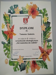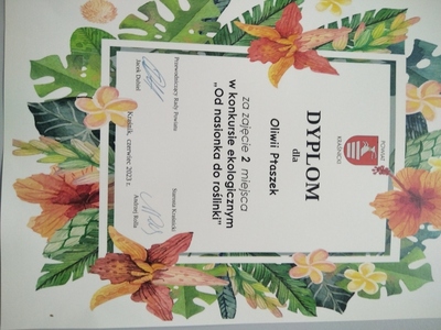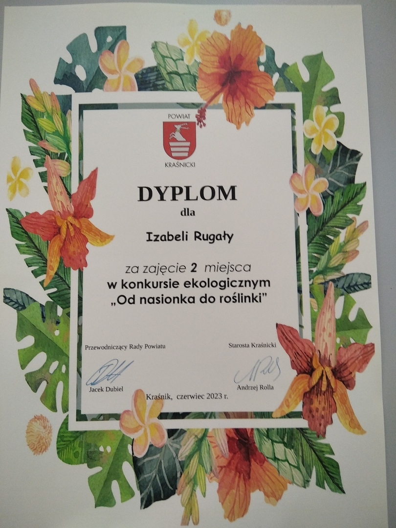 Wydział Rolnictwa i Ochrony Środowiska Starostwa Powiatowego w Kraśniku zorganizował konkurs ekologiczny „Od nasionka do roślinki”. Zadaniem uczestników konkursu była samodzielna uprawa 3 różnych gatunków roślin: rozpoczynająca się od zasiania nasion, poprzez pielęgnację do wyhodowania rośliny, a także fotografowanie i opisywanie poszczególnych etapów uprawy w formie kroniki (do 8 zdjęć jednej roślinki). Dnia 21 czerwca 2023 roku w sali konferencyjnej Zespołu Szkół nr 3 w Kraśniku nastąpiło podsumowanie konkursu i wręczenie nagród. Uczniowie naszej szkoły zajęli II miejsce a tym samym otrzymali dyplomy i nagrody.