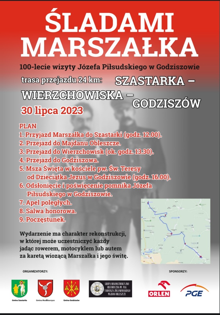 motocyklem lub autem za karetą wiozącą Marszałka i jego świtę.