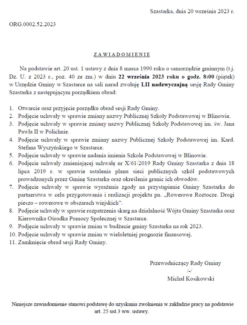 22 września 2023 r. Rada Gminy Szastarka podjęła uchwałę nadania imienia Szkole Podstawowej w Blinowie. Kandydatura Św. Królowej Jadwigi została przyjęta jednogłośnie. Mając świadomość jak ważna w historii naszej szkoły jest to chwila, na LII nadzwyczajnej sesji Rady Gminy Szastarka nie mogło nas zabraknąć. Uczniów naszej szkoły reprezentowali: Sandra Obydź, Klaudia Giżka, Michał Szabat oraz Dawid Kudrelek. Obecna była również Pani Agata Szabat jako przedstawiciel nauczycieli oraz Pani Małgorzata Giżka przedstawiciel Rady Rodziców. Pani Dyrektor Ilona Stolarz uzasadniła zebranym wybór właśnie tej postaci oraz zapewniła o demokratycznych wyborach, w których wyłoniona została św. Królowa Jadwiga na patronkę szkoły w Blinowie. Nasi uczniowie już dziś mogli poczuć rangę wydarzenia które czeka nas w niedługim czasie, tj.: 25 października 2023 roku. Dziękujemy serdecznie wszystkim Radnym Rady Gminy Szastarka z przewodniczącym Michałem Kosikowskim na czele i oczywiście Panu Wójtowi Arturowi Jaskowskiemu za przychylność i zrozumienie jak ważne jest dla społeczności szkolnej, zwłaszcza w dzisiejszych czasach, posiadanie patrona szkoły i budowanie własnej tożsamości w oparciu o wartości, które wyznawała i swoim życiem potwierdzała nasza Patronka. Są to: pokora, umiłowanie pokoju i patriotyzm, empatia, wrażliwość na krzywdę i rozumienie ludzkich potrzeb, odwaga, nauka oraz głęboka religijność.