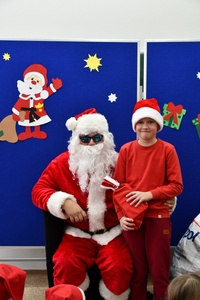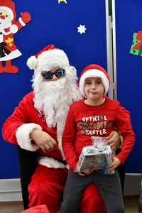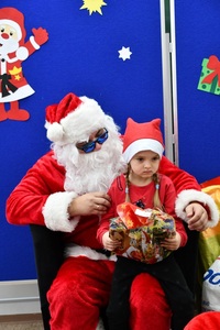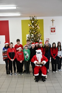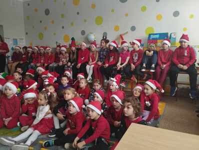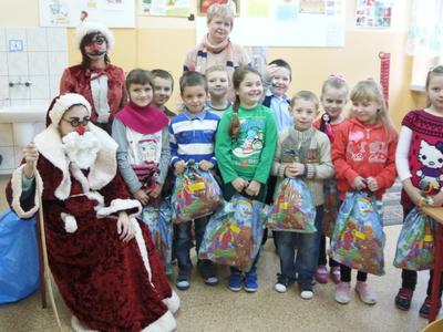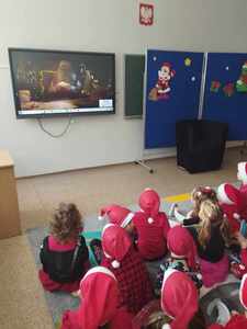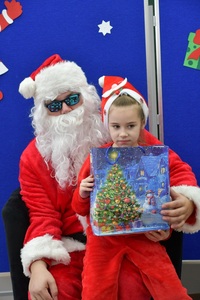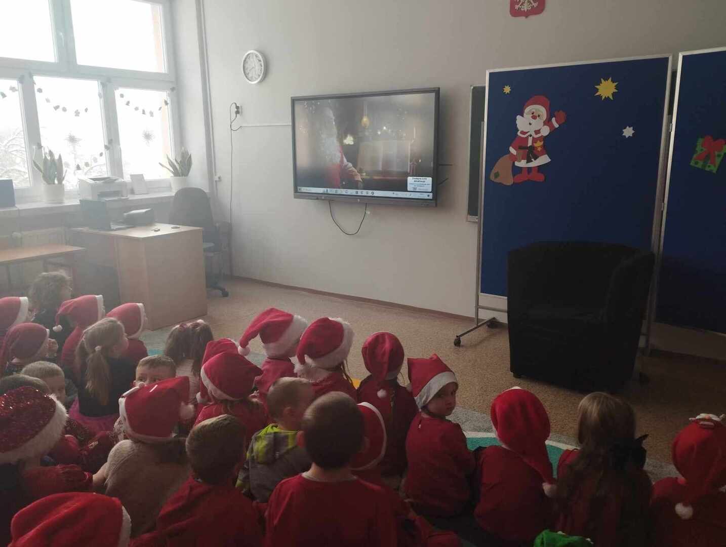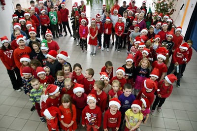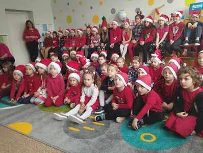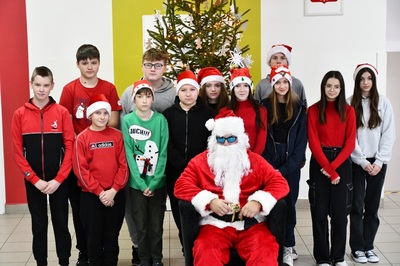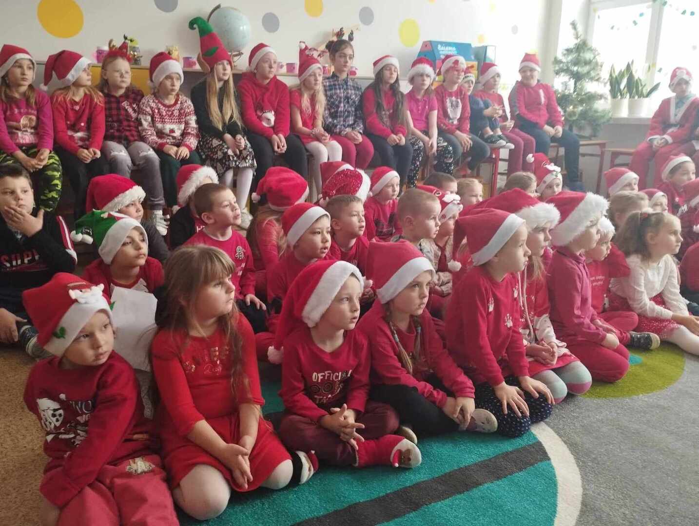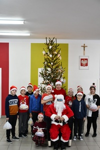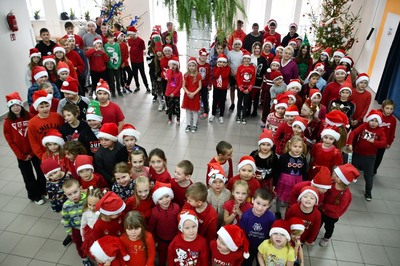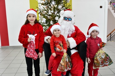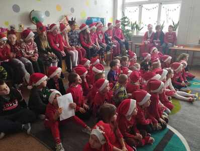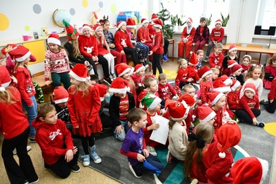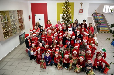 Dzisiejszy dzień od samego rana budził wiele emocji. Radość, optymizm i ciekawość mieszały się z niepewnością, niedowierzaniem, a nawet strachem. To wszystko za sprawą niezwykłego gościa, który właśnie na dzisiaj - 6 grudnia, zapowiedział swoją wizytę w naszej szkole. Mowa oczywiście o św. Mikołaju. Wszyscy wystrojeni na czerwono i w mikołajkowych czapkach z niecierpliwością czekaliśmy na spotkanie z tym, tak długo wyczekiwanym Panem. Zanim mogliśmy Go ujrzeć w całej Jego okazałości, obejrzeliśmy film, który na przysłał. Dowiedzieliśmy się z niego m.in.: gdzie mieszka i czym się zajmuje przez cały rok. Jakże wielka była nasza radość, gdy na ekranie zobaczyliśmy naszą szkołę i nas samych z naszymi paniami. Byliśmy już pewni, że św. Mikołaj pamiętał o nas i na pewno nas odwiedzi. Pozostało już tylko cierpliwie czekać. Nadszedł wreszcie ten moment. Usłyszeliśmy dźwięk dzwonka, po czym w drzwiach sali ukazał się On sam - św. Mikołaj. Ubrany cały na czerwono, z długą siwą brodą oraz z workami pełnymi prezentów, uśmiechał się do nas wszystkich. No i wcale nie był taki stary. Z radością zaprosiliśmy Go do środka i powitali piosenką. Święty Mikołaj obdarował wszystkich pięknymi prezentami. Mieliśmy też okazję, usiąść Mu na kolanach i chwilę z Nim porozmawiać. Na koniec spotkania śpiewem podziękowaliśmy Mikołajowi za prezenty i zaprosili do pamiątkowego zdjęcia przy choince. Gdy wydawało się, że to już koniec atrakcji w dniu dzisiejszym, na dzieci z oddziałów przedszkolnych czekała jeszcze jedna niespodzianka. Nasz Gość odwiedził ich w salach i wręczył mnóstwo zabawek. Radości było co nie miara. Każde dziecko wśród prezentów, znalazło coś dla siebie.