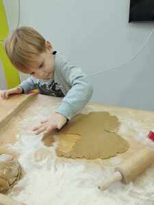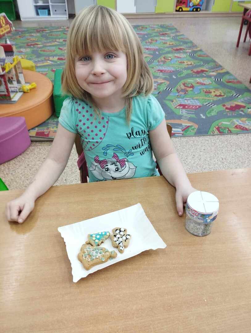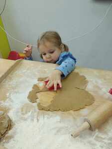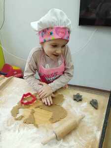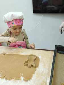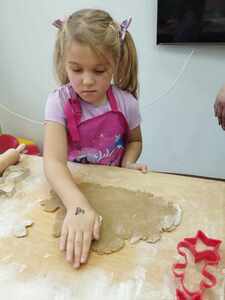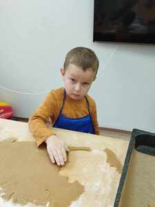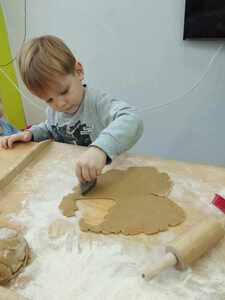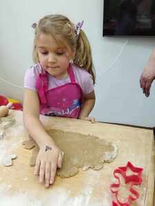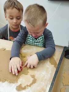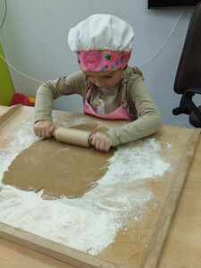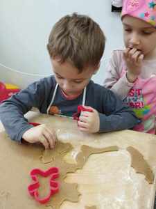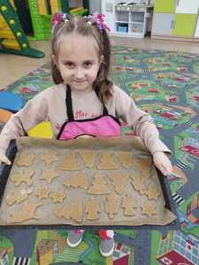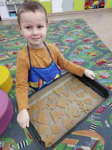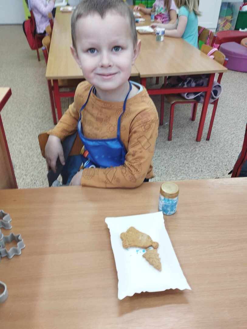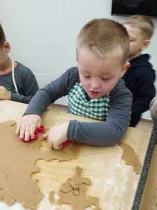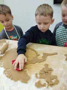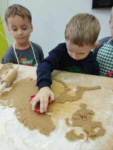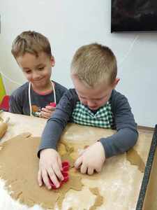 Pieczenie pierniczków, to tradycja, która na stałe wpisała się w nasz przedszkolny kalendarz. Od samego rana w sali panowało wielkie poruszenie. Dzieci stroiły się w kolorowe fartuszki i czepki, aby już za chwilę zabrać się do pracy. Z entuzjazmem i wielkim zaangażowaniem wałkowały ciasto i wykrawały przeróżne kształty ciasteczek. Gdy pierniczki piekły się w szkolnej kuchni, dzieci obejrzały film edukacyjny, opowiadający o tradycjach świątecznych. Przyszła w końcu ta pora, gdy dzieci mogły własnoręcznie zabrać się za dekorowanie pierników. Pomysłów było bez liku. Każde ciastko było inne, a jego wygląd i zapach, nie pozwoliły na długie powstrzymywanie się od degustacji. W natłoku pracy dzieci nie zapomniały o Pani dyrektor Ilonie Stolarz, którą poczęstowały swoimi wypiekami. Swoimi popisami kulinarnymi, przedszkolaki pochwaliły się również w domach, zabierając dla swoich najbliższych pięknie udekorowane ciastka. Mamy nadzieję, że wszystkim będą bardzo smakować