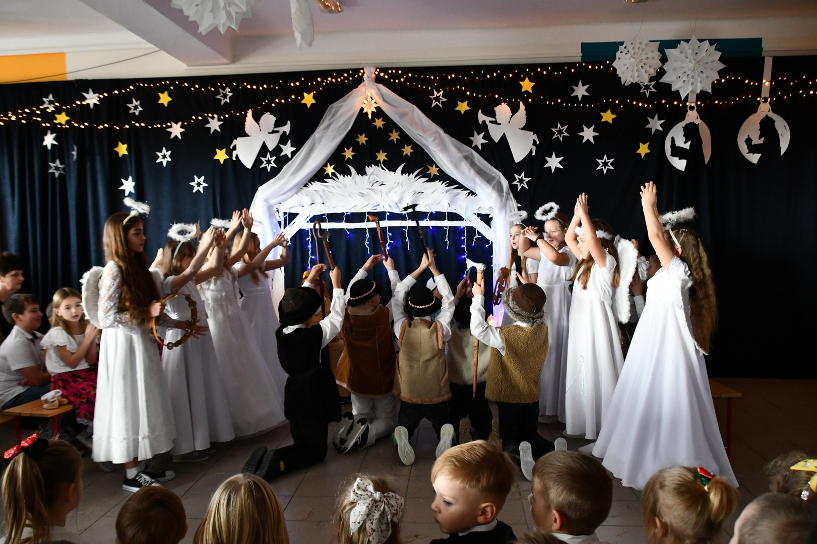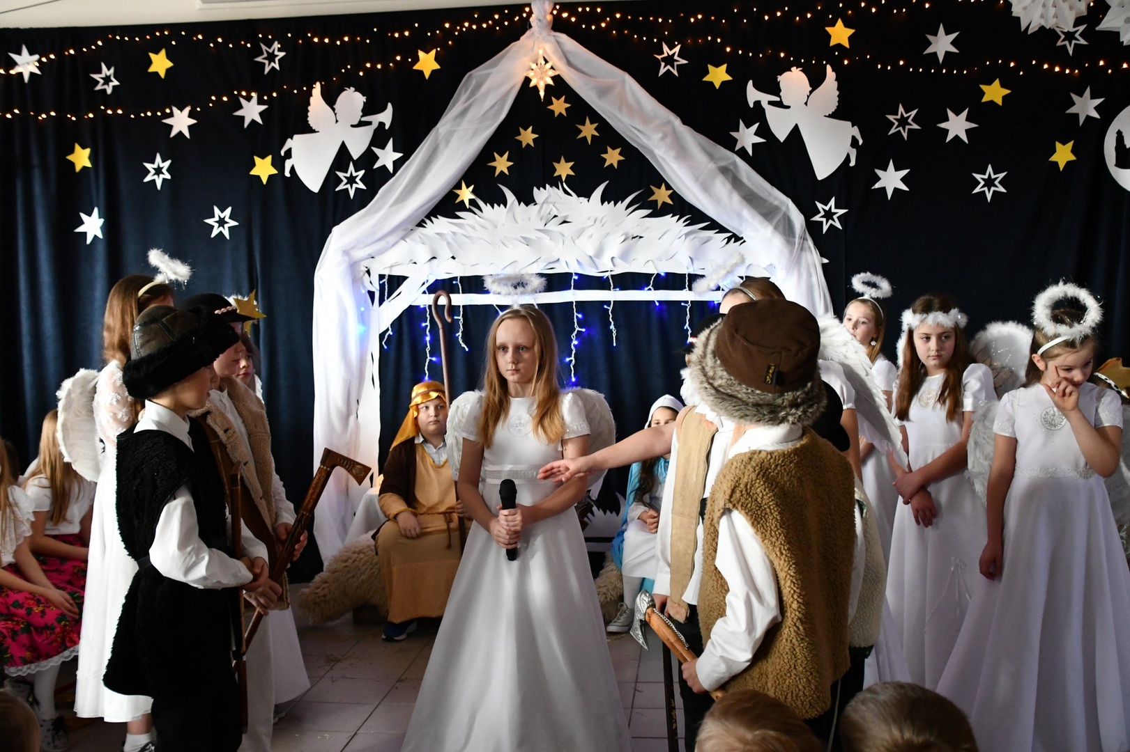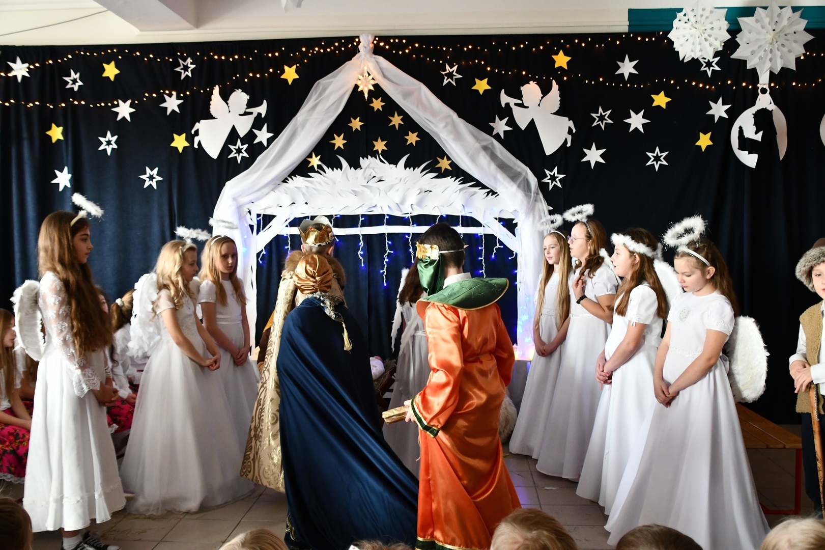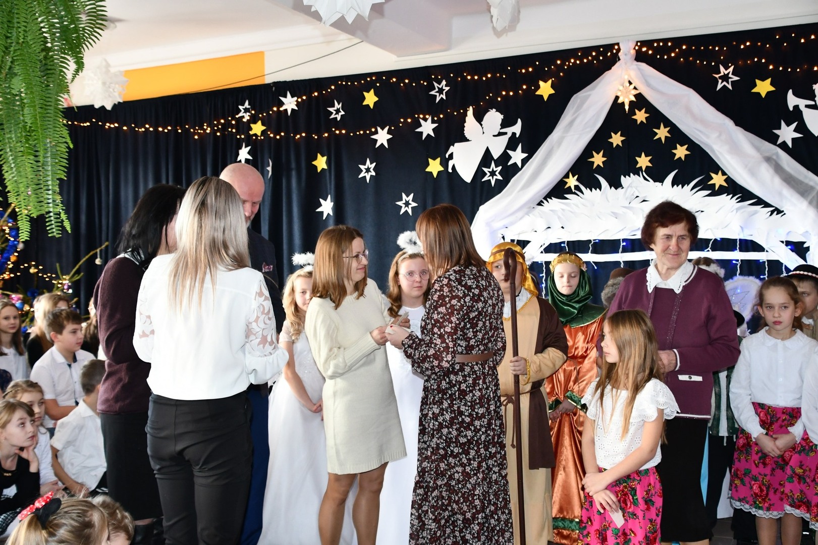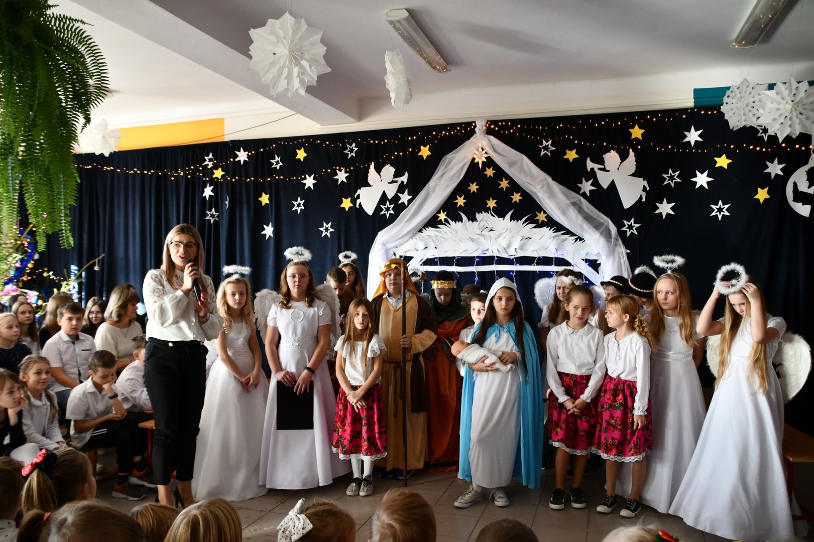 Święta Bożego Narodzenia to wyjątkowy czas, z którym wiąże się wiele zwyczajów i tradycji. Ostatni dzień nauki przed świętami 22 grudnia upłynął w naszej szkole w prawdziwie świątecznej atmosferze. Uczniowie mieli okazję spędzić ze sobą i wychowawcami Wigilię, połamać się opłatkiem i złożyć sobie najserdeczniejsze życzenia. W szkolnej stołówce , odświętnie przystrojonej pojawiły się wigilijne potrawy. W całej szkole roznosił się śpiew kolęd, zapach potraw i siana. Po wigilii uczniowie przenieśli się na górny korytarz gdzie zostały wystawione jasełka. W tym roku organizacją przedstawienia zajęła się pani Agata Szabat, która udowodniła, że wśród uczniów klas młodszych znajdują się bardzo utalentowane dzieci. Podziwialiśmy grę aktorską, pięknie śpiewane kolędy, taniec aniołków, pastuszków, a także piękne stroje przygotowane przez rodziców małych aktorów. Całości dopełniła nastrojowa dekoracja przedstawiająca szopkę betlejemską a w tle rozgwieżdżone niebo. Możliwość oglądania jasełkowych występów, aktywnego uczestniczenia w nich to świetny sposób na obchody narodzenia Chrystusa i podtrzymywanie tradycji. Uroczyste spotkanie uświetnili swoją obecnością zaproszeni goście: Wójt Gminy Szastarka Pan Artur Jaskowski, Sekretarz Gminy Pani Jadwiga Wielgus, dyrektor GZOPO w Szastarce Pani Monika Łukasik, emerytowani nauczyciele. Miło było nam gościć również rodziców naszych uczniów. Po części artystycznej oraz po symbolicznym połamaniu się opłatkiem z zaproszonymi gośćmi, dyrektor szkoły – Pani Ilona Stolarz oraz Pan Wójt pochwalili występ młodych artystów oraz złożyli wszystkim obecnym serdeczne życzenia z okazji nadchodzących Świąt Bożego Narodzenia.