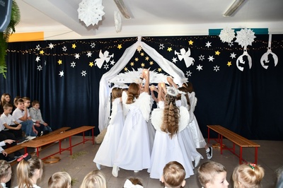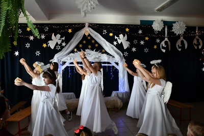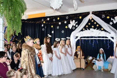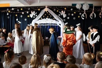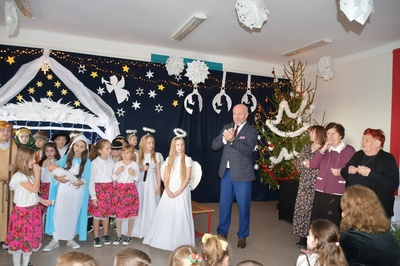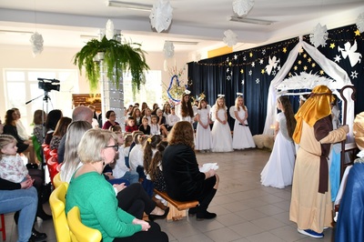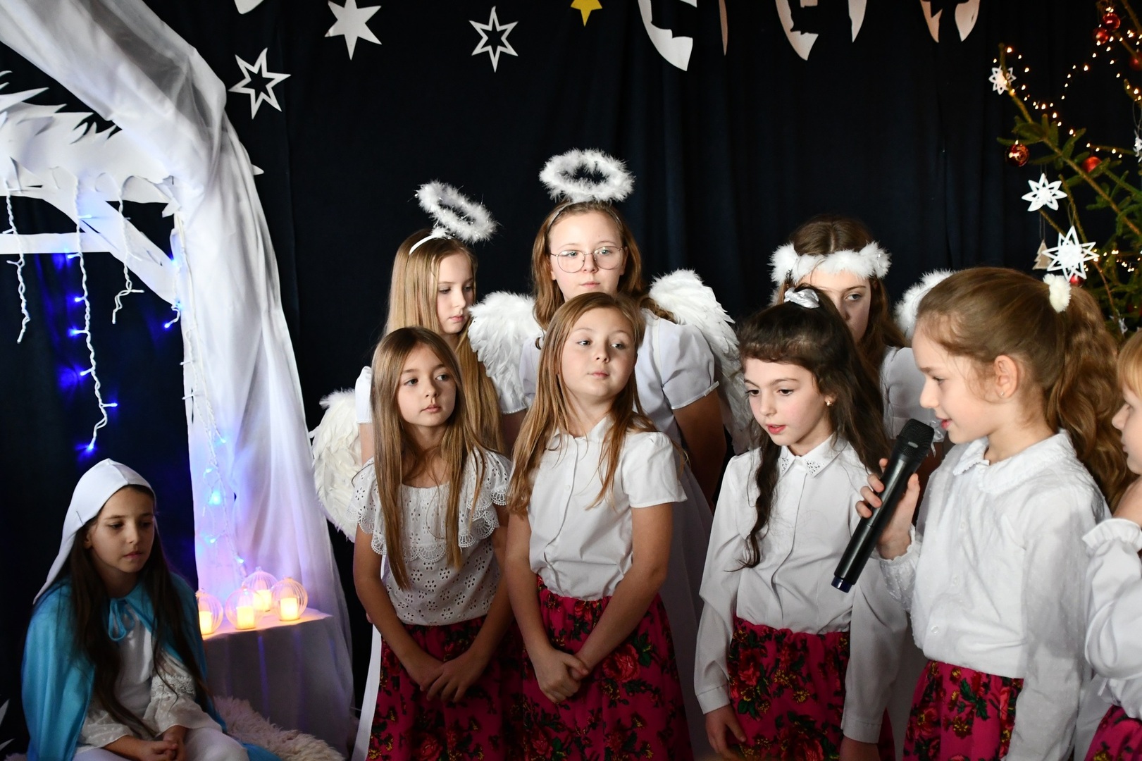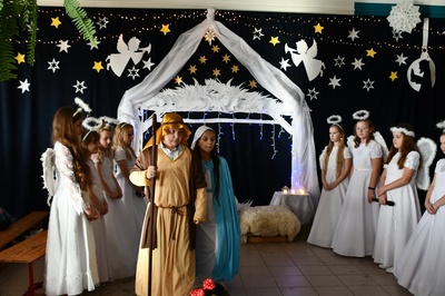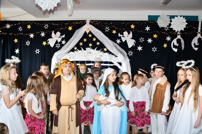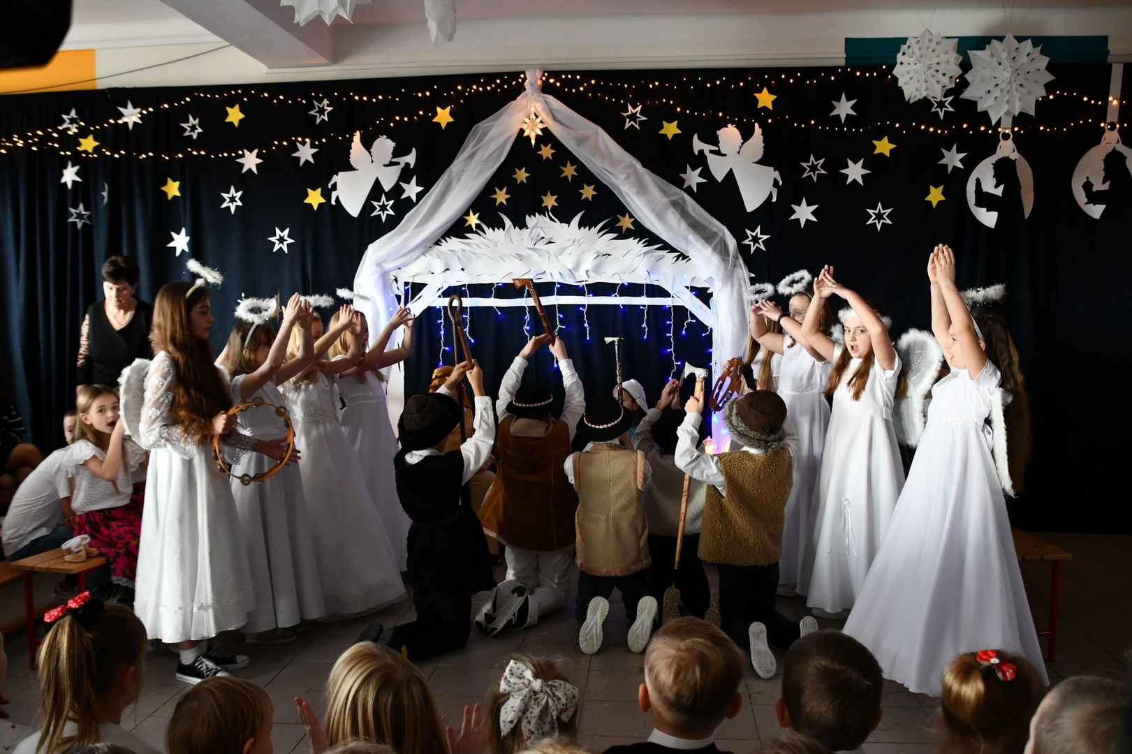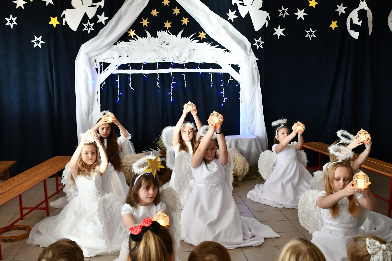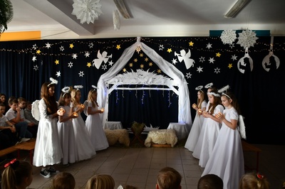 Święta Bożego Narodzenia to wyjątkowy czas, z którym wiąże się wiele zwyczajów i tradycji. Ostatni dzień nauki przed świętami 22 grudnia upłynął w naszej szkole w prawdziwie świątecznej atmosferze. Uczniowie mieli okazję spędzić ze sobą i wychowawcami Wigilię, połamać się opłatkiem i złożyć sobie najserdeczniejsze życzenia. W szkolnej stołówce , odświętnie przystrojonej pojawiły się wigilijne potrawy. W całej szkole roznosił się śpiew kolęd, zapach potraw i siana. Po wigilii uczniowie przenieśli się na górny korytarz gdzie zostały wystawione jasełka. W tym roku organizacją przedstawienia zajęła się pani Agata Szabat, która udowodniła, że wśród uczniów klas młodszych znajdują się bardzo utalentowane dzieci. Podziwialiśmy grę aktorską, pięknie śpiewane kolędy, taniec aniołków, pastuszków, a także piękne stroje przygotowane przez rodziców małych aktorów. Całości dopełniła nastrojowa dekoracja przedstawiająca szopkę betlejemską a w tle rozgwieżdżone niebo. Możliwość oglądania jasełkowych występów, aktywnego uczestniczenia w nich to świetny sposób na obchody narodzenia Chrystusa i podtrzymywanie tradycji. Uroczyste spotkanie uświetnili swoją obecnością zaproszeni goście: Wójt Gminy Szastarka Pan Artur Jaskowski, Sekretarz Gminy Pani Jadwiga Wielgus, dyrektor GZOPO w Szastarce Pani Monika Łukasik, emerytowani nauczyciele. Miło było nam gościć również rodziców naszych uczniów. Po części artystycznej oraz po symbolicznym połamaniu się opłatkiem z zaproszonymi gośćmi, dyrektor szkoły – Pani Ilona Stolarz oraz Pan Wójt pochwalili występ młodych artystów oraz złożyli wszystkim obecnym serdeczne życzenia z okazji nadchodzących Świąt Bożego Narodzenia.