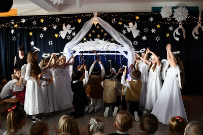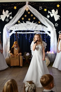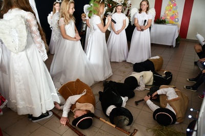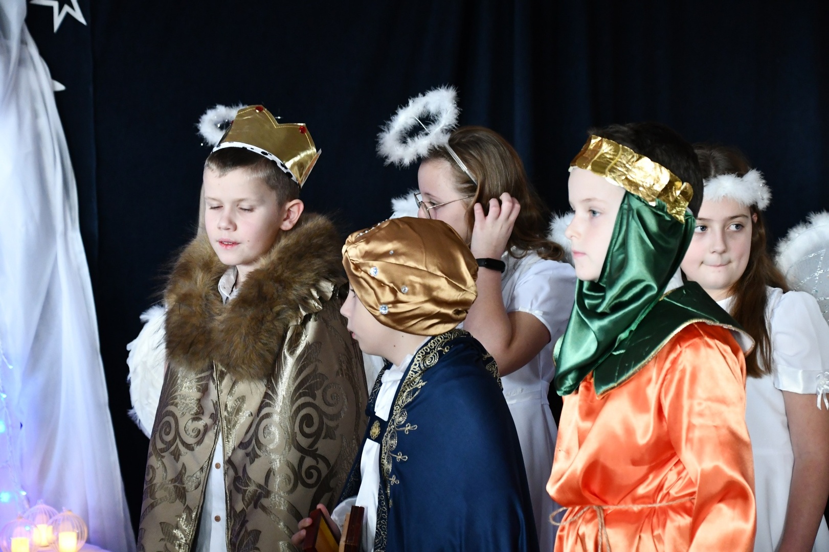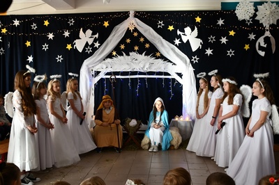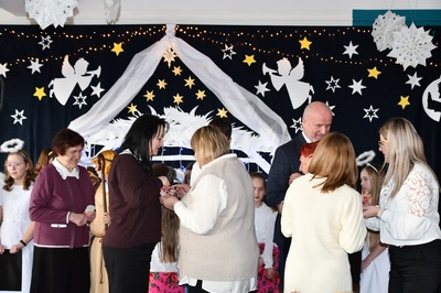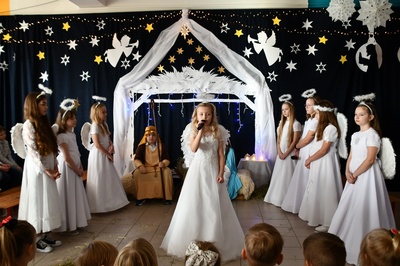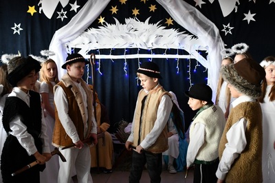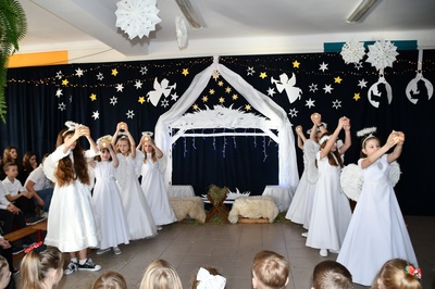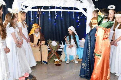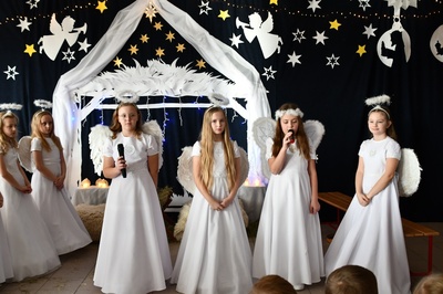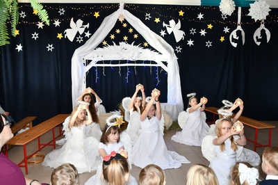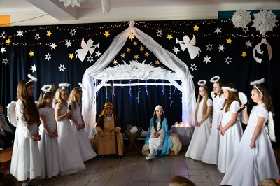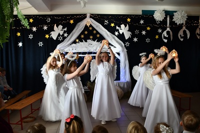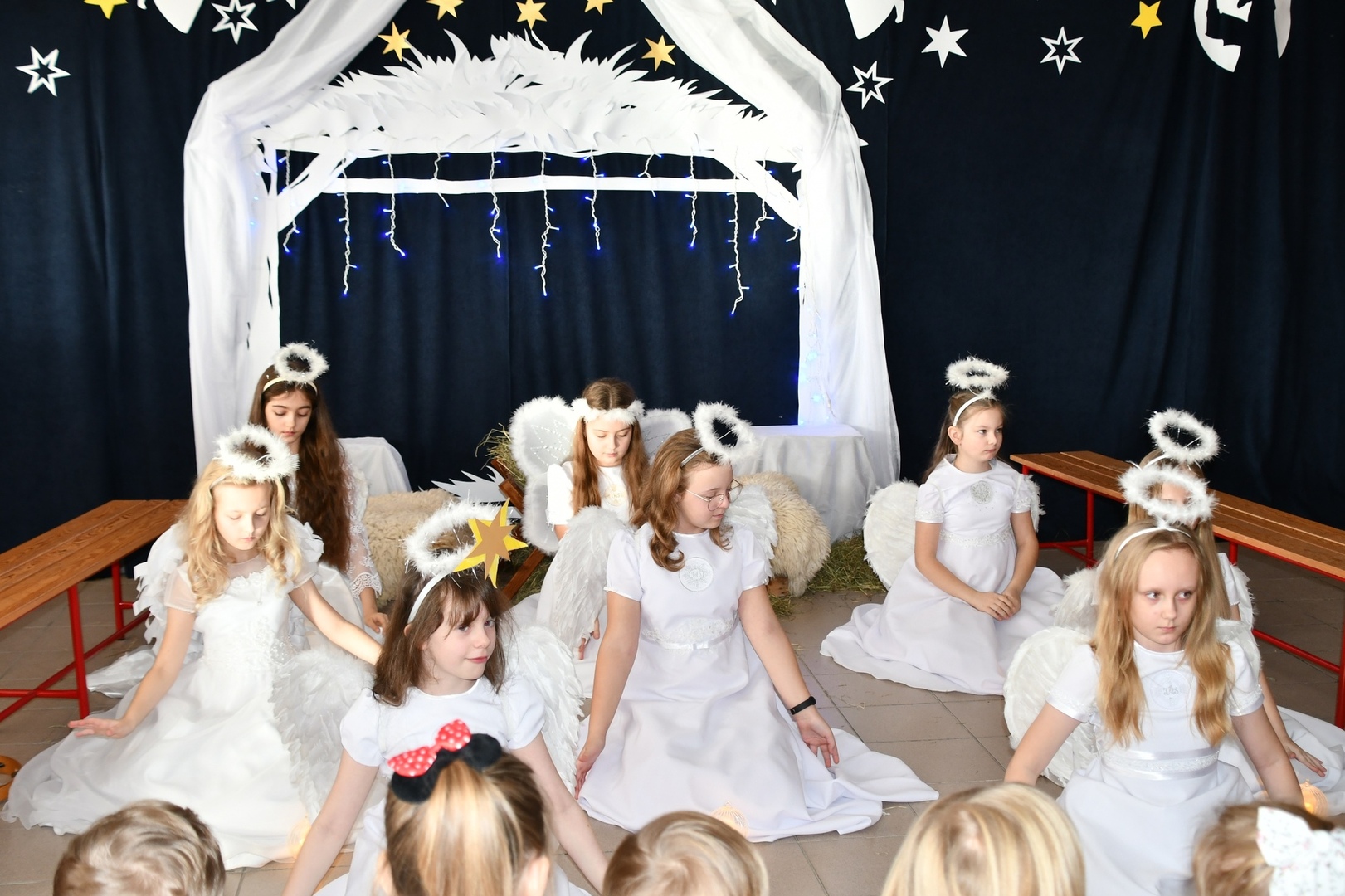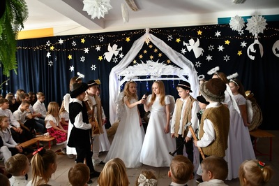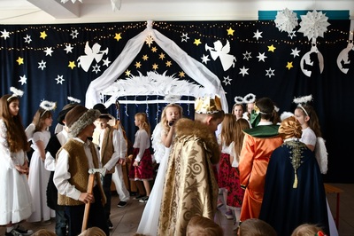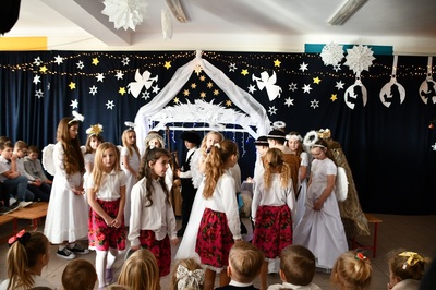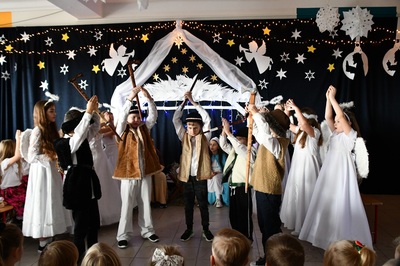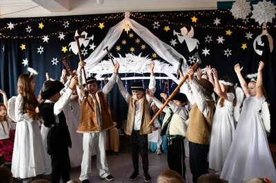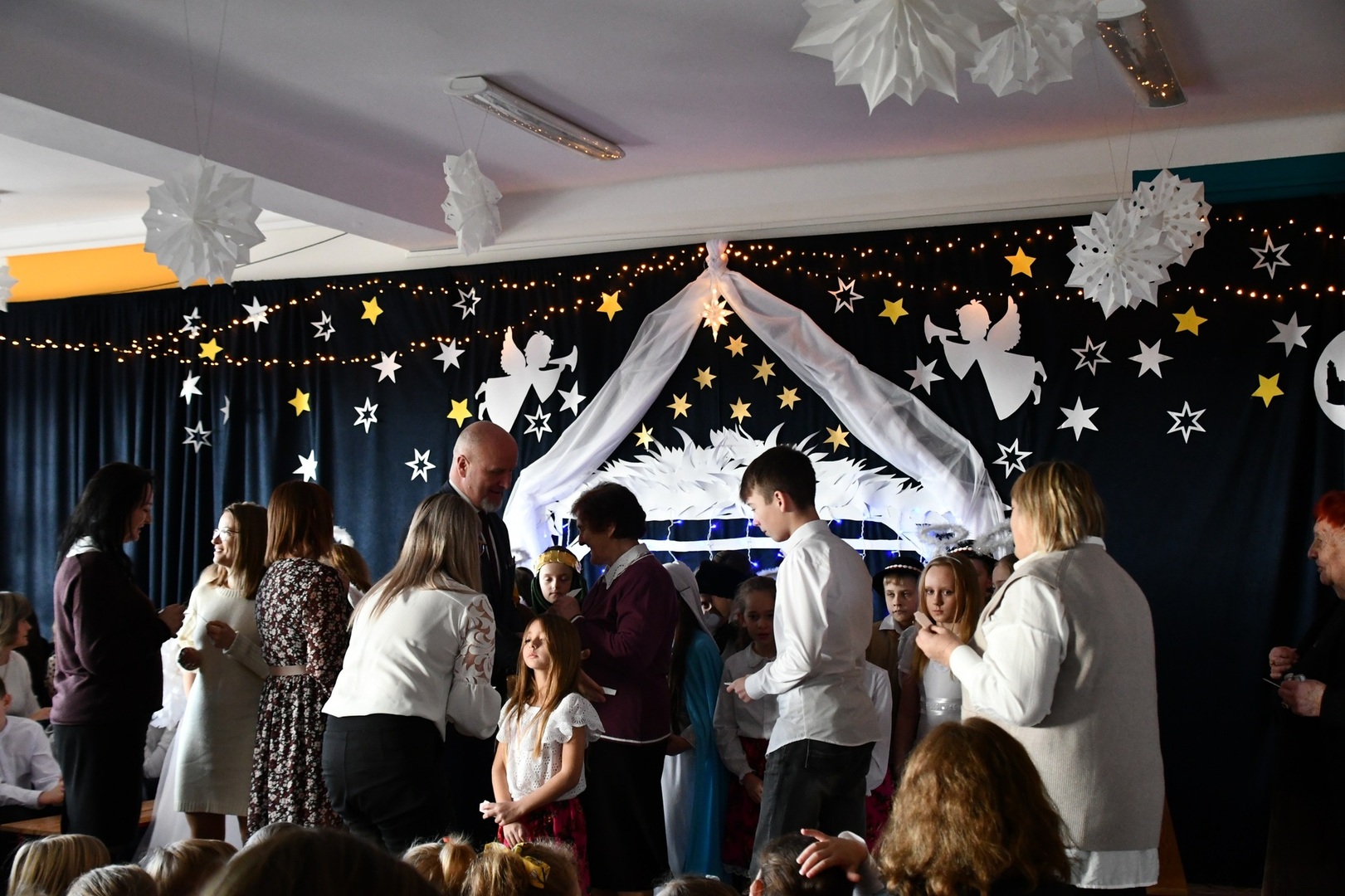 Święta Bożego Narodzenia to wyjątkowy czas, z którym wiąże się wiele zwyczajów i tradycji. Ostatni dzień nauki przed świętami 22 grudnia upłynął w naszej szkole w prawdziwie świątecznej atmosferze. Uczniowie mieli okazję spędzić ze sobą i wychowawcami Wigilię, połamać się opłatkiem i złożyć sobie najserdeczniejsze życzenia. W szkolnej stołówce , odświętnie przystrojonej pojawiły się wigilijne potrawy. W całej szkole roznosił się śpiew kolęd, zapach potraw i siana. Po wigilii uczniowie przenieśli się na górny korytarz gdzie zostały wystawione jasełka. W tym roku organizacją przedstawienia zajęła się pani Agata Szabat, która udowodniła, że wśród uczniów klas młodszych znajdują się bardzo utalentowane dzieci. Podziwialiśmy grę aktorską, pięknie śpiewane kolędy, taniec aniołków, pastuszków, a także piękne stroje przygotowane przez rodziców małych aktorów. Całości dopełniła nastrojowa dekoracja przedstawiająca szopkę betlejemską a w tle rozgwieżdżone niebo. Możliwość oglądania jasełkowych występów, aktywnego uczestniczenia w nich to świetny sposób na obchody narodzenia Chrystusa i podtrzymywanie tradycji. Uroczyste spotkanie uświetnili swoją obecnością zaproszeni goście: Wójt Gminy Szastarka Pan Artur Jaskowski, Sekretarz Gminy Pani Jadwiga Wielgus, dyrektor GZOPO w Szastarce Pani Monika Łukasik, emerytowani nauczyciele. Miło było nam gościć również rodziców naszych uczniów. Po części artystycznej oraz po symbolicznym połamaniu się opłatkiem z zaproszonymi gośćmi, dyrektor szkoły – Pani Ilona Stolarz oraz Pan Wójt pochwalili występ młodych artystów oraz złożyli wszystkim obecnym serdeczne życzenia z okazji nadchodzących Świąt Bożego Narodzenia.