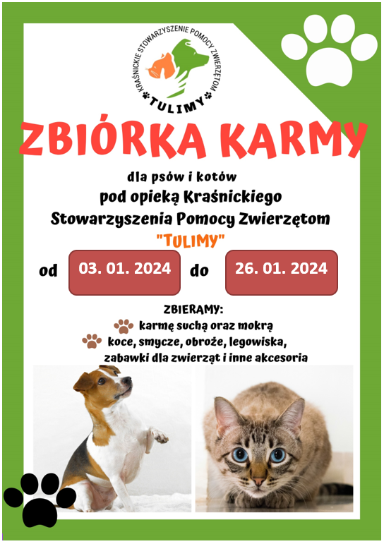 Dołącz do akcji Samorządu Uczniowskiego zbierania karmy dla podopiecznych Kraśnickie Stowarzyszenie Pomocy Zwierzętom "Tulimy"! Każdy wkład liczy się i może przynieść uśmiech na futrzaną mordkę.