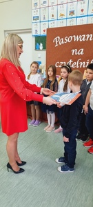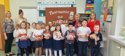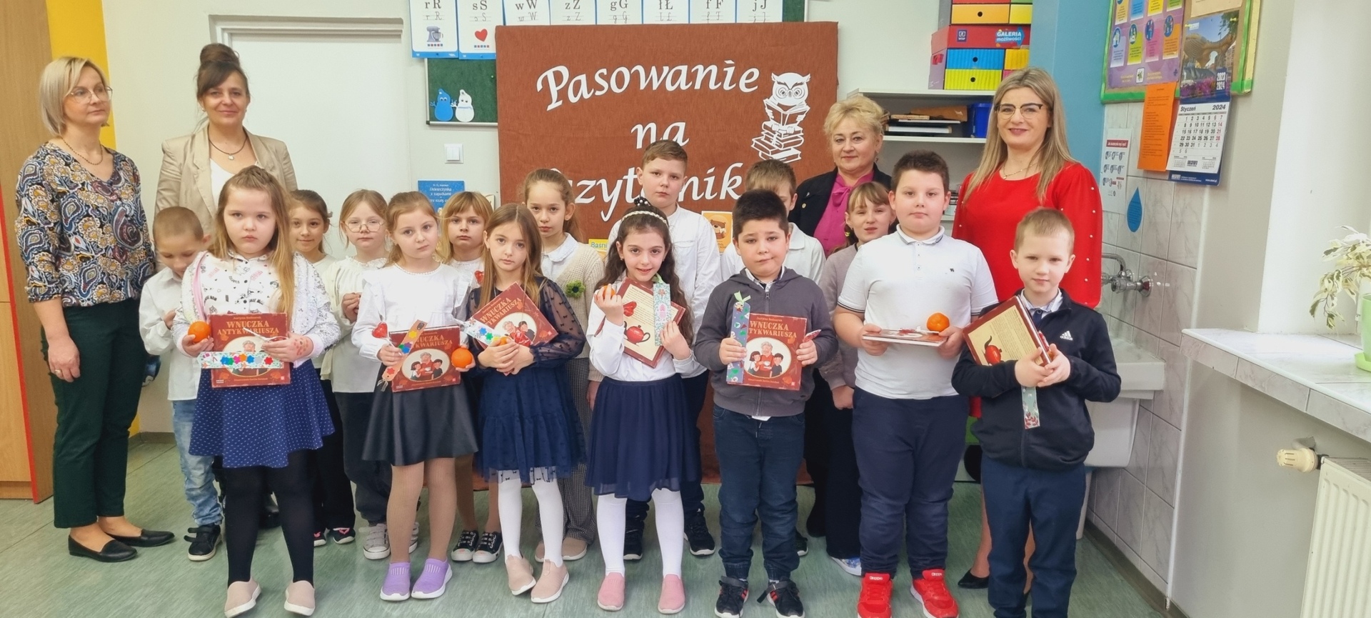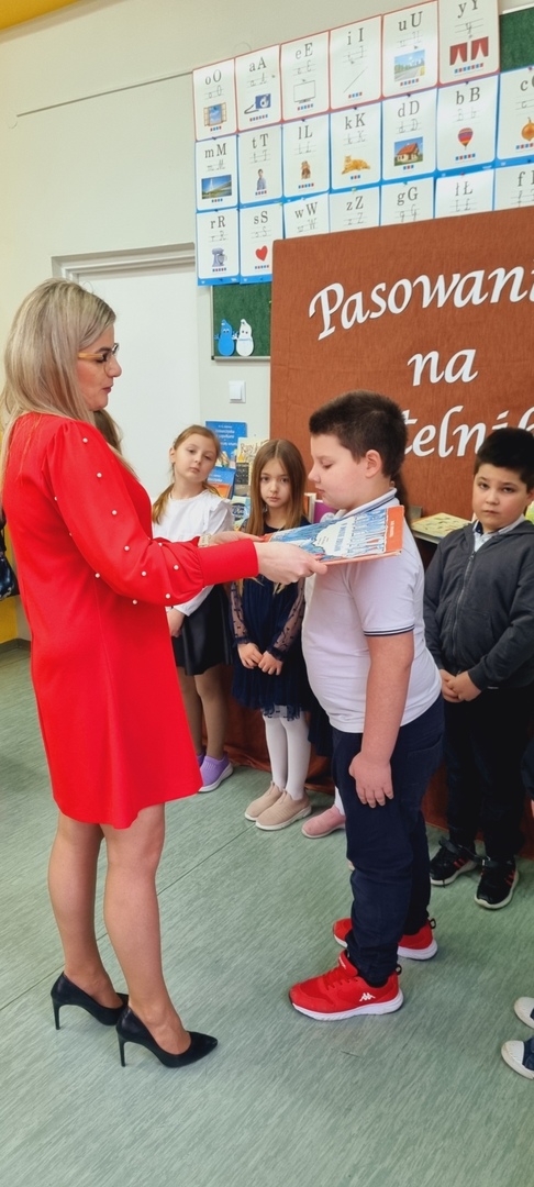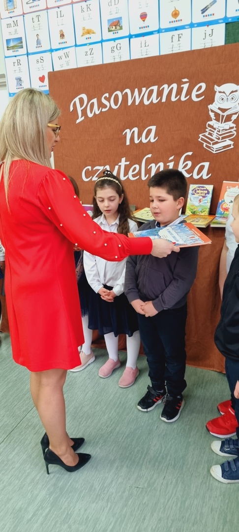 Głównym celem uroczystości było zachęcenie najmłodszych uczniów do korzystania z biblioteki szkolnej, wypożyczania książek aby rozwijać i doskonalić umiejętność czytania. Pasowanie na czytelnika to oficjalne przyjęcie uczniów do grona czytelników biblioteki. Pasowanie na czytelnika poprzedziła lekcja biblioteczna przeprowadzona przez bibliotekarkę Panią Henrykę Wielgus, która przekazała wiadomości na temat biblioteki i zasad jakie obowiązują czytelnika. Uczniowie klasy I złożyli uroczyste przyrzeczenie, że będą szanować książki, a Pani Dyrektor Ilona Stolarz dokonała pasowania , wręczając każdemu uczniowi pamiątkową książkę. Pamiątkowe zakładki do książki przekazali starsi uczniowie klasy II wykonane wspólnie z Panią Beatą Blajerską a przekazane przez Panią Monikę Reszka. Pani bibliotekarka podziękowała również wychowawczyni klasy I Pani Dorocie Wiśniewskiej za dekorację sali i przygotowanie uczniów do tego wydarzenia. Na pożegnanie nowi czytelnicy otrzymali słodką niespodziankę. Z pewnością kolorowe książki i upominki będą im przypominać o tym uroczystym wydarzeniu. Dla pierwszoklasistów, ten dzień był pełen wrażeń.