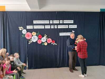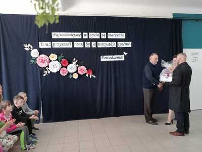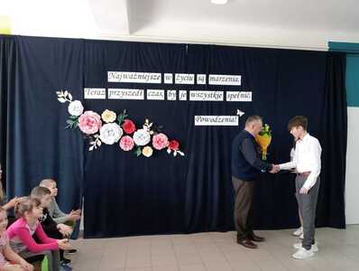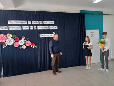 Następnie wyrazy wdzięczności i życzenia popłynęły od uczniów i przedstawicieli rodziców. Dziękowali Panu A.Białkowi za pracę i troskę, życzliwość, a także pomocną dłoń podczas trudnych chwil.
