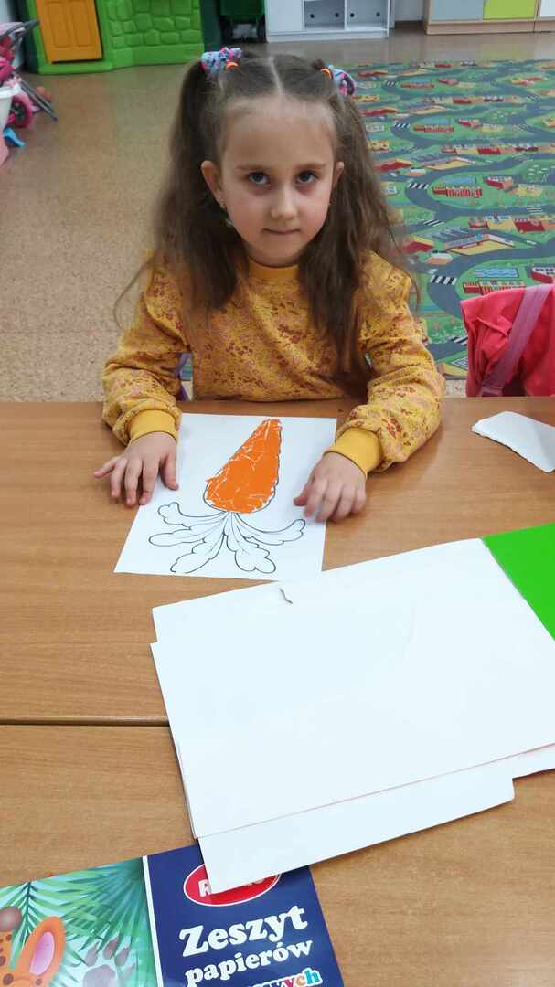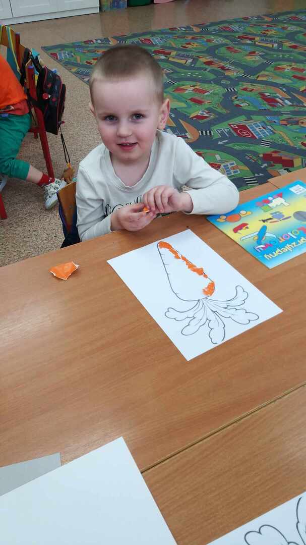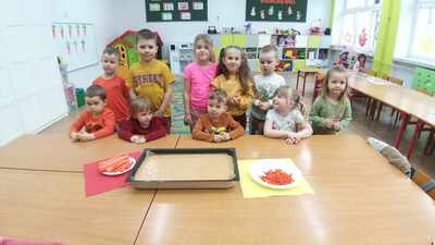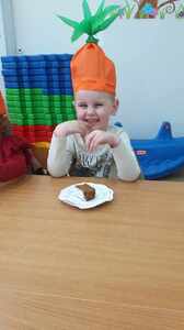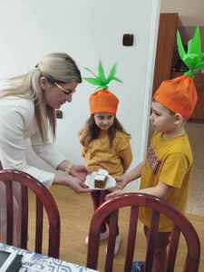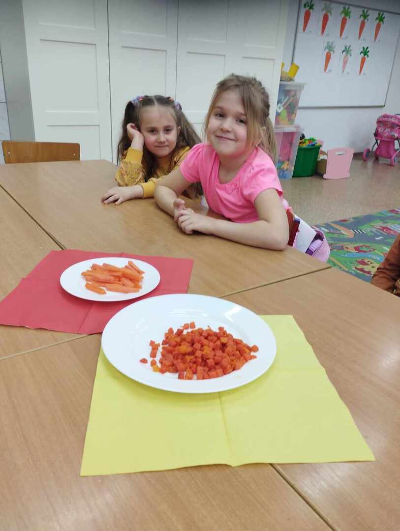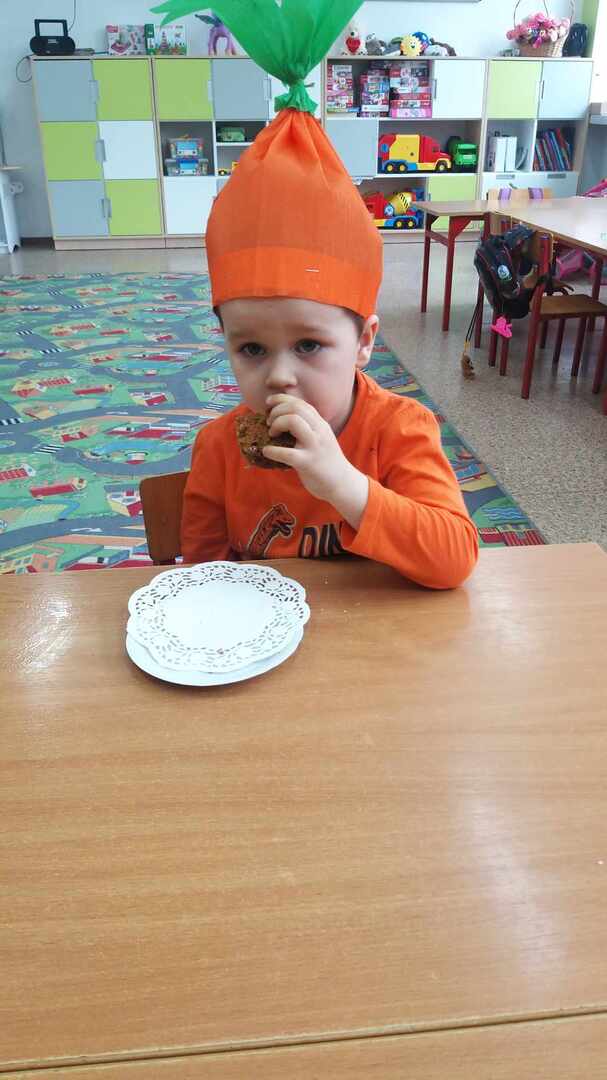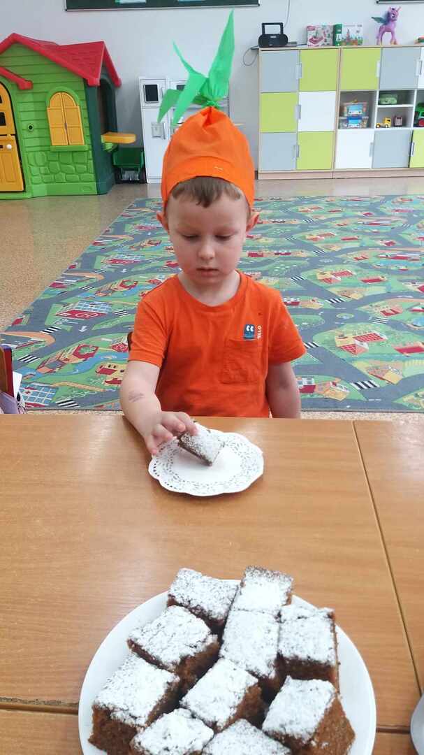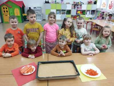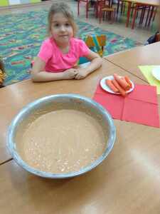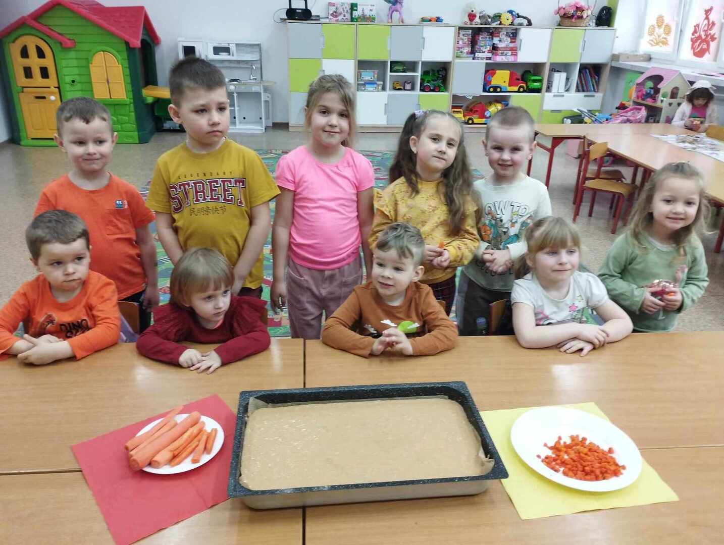 Głównym celem zajęć było poznanie walorów odżywczych marchewki. Dzieci wiedzą już, że warzywo to zawiera dużo cennych witamin i minerałów, tak bardzo potrzebnych do ich prawidłowego rozwoju. Zdobyta wiedza nie poszła na marne, co dało się zauważyć już podczas obiadu, podczas którego dzieci z apetytem i bez grymasów zajadały się marchewką. Cały dzień wypełniony był zabawami, pracami plastycznymi, zadaniami matematycznymi, a także wielkim chrupaniem marchewek. Najwięcej jednak emocji, towarzyszyło przedszkolakom podczas przygotowywania ciasta marchewkowego. Wszystkie dzieci bardzo angażowały się w jego wykonanie. Gdy trafiło w końcu do piekarnika, pozostało już tylko czekać na jego degustację. Wyszło przeeepyszne, o czym zaświadczyła sama Pani dyrektor Ilona Stolarz.