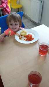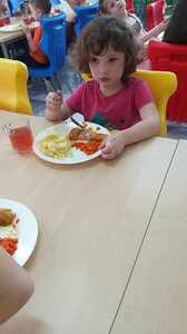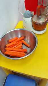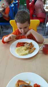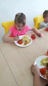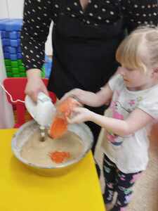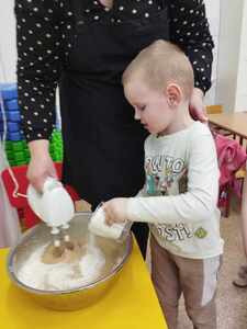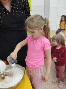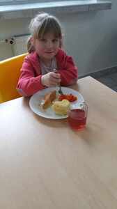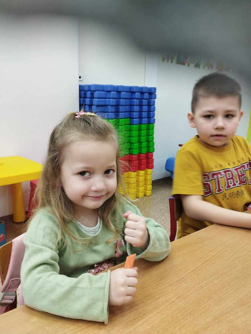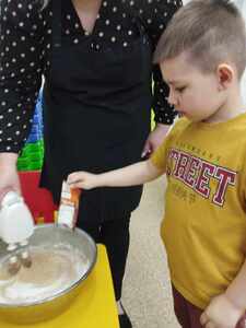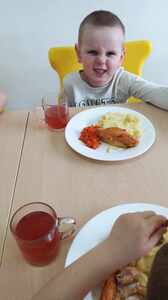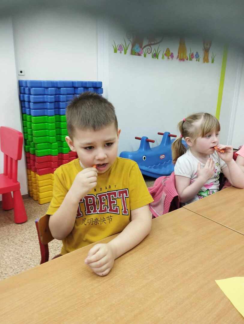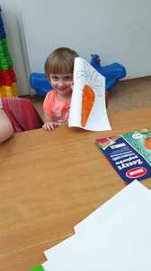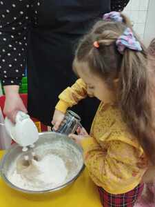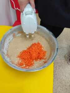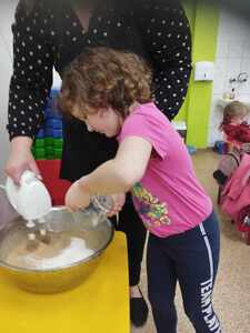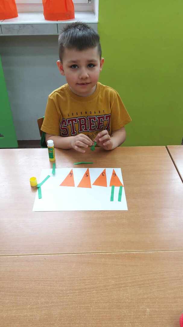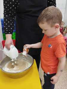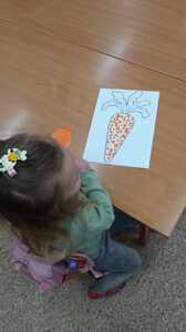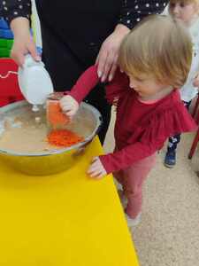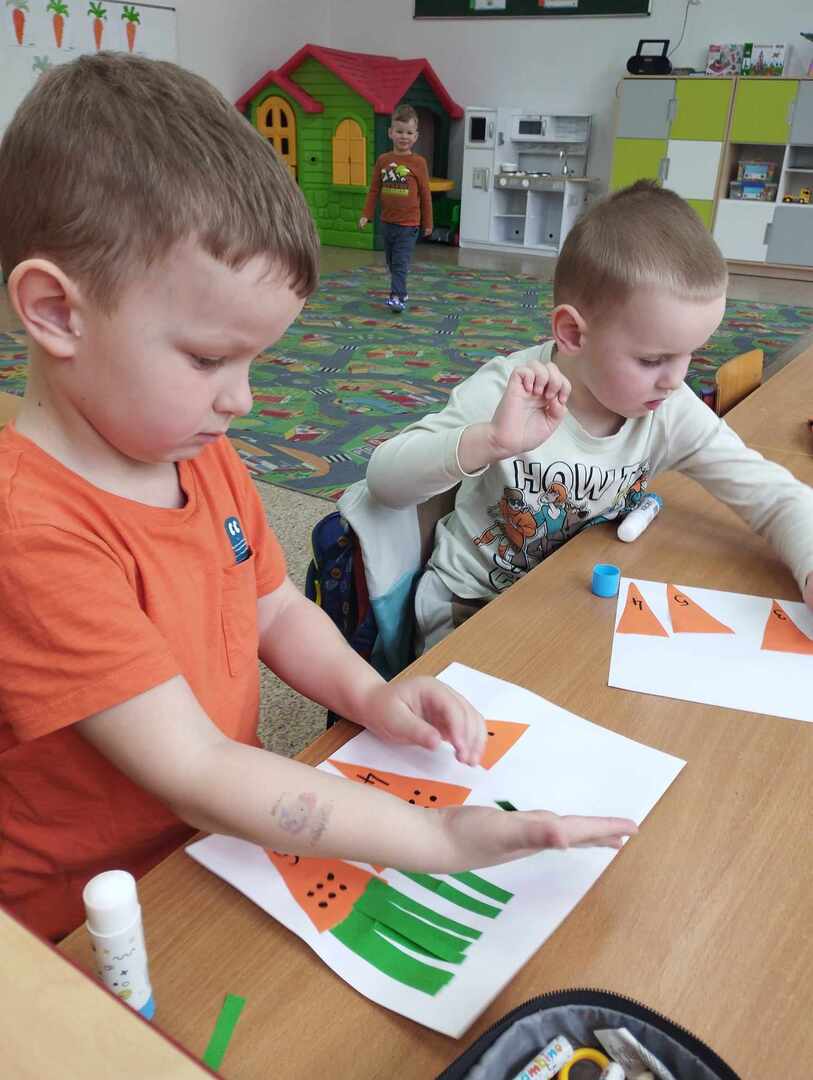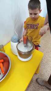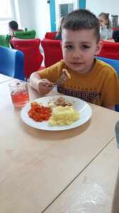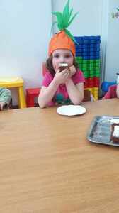 Głównym celem zajęć było poznanie walorów odżywczych marchewki. Dzieci wiedzą już, że warzywo to zawiera dużo cennych witamin i minerałów, tak bardzo potrzebnych do ich prawidłowego rozwoju. Zdobyta wiedza nie poszła na marne, co dało się zauważyć już podczas obiadu, podczas którego dzieci z apetytem i bez grymasów zajadały się marchewką. Cały dzień wypełniony był zabawami, pracami plastycznymi, zadaniami matematycznymi, a także wielkim chrupaniem marchewek. Najwięcej jednak emocji, towarzyszyło przedszkolakom podczas przygotowywania ciasta marchewkowego. Wszystkie dzieci bardzo angażowały się w jego wykonanie. Gdy trafiło w końcu do piekarnika, pozostało już tylko czekać na jego degustację. Wyszło przeeepyszne, o czym zaświadczyła sama Pani dyrektor Ilona Stolarz.