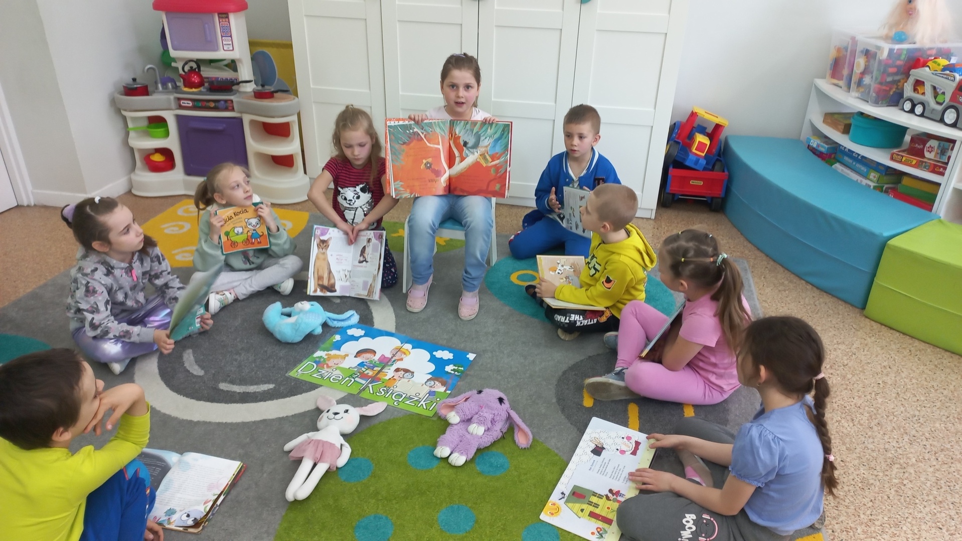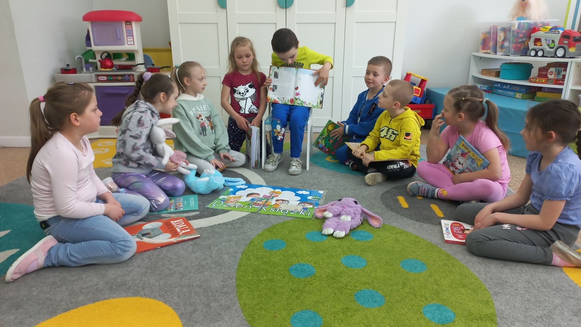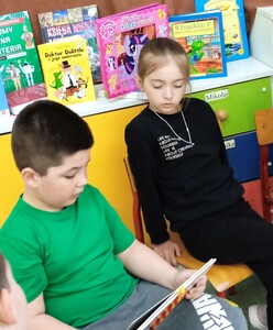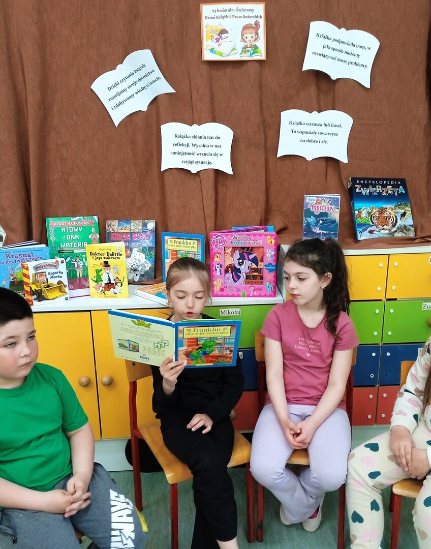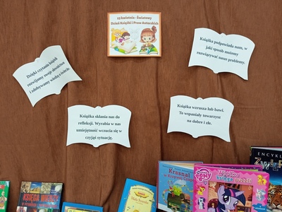 Światowy Dzień Książki i Praw Autorskich, obchodzony 23 kwietnia, ustanowiony został przez UNESCO. W 2024 roku święto odbywa się pod hasłem "Czytaj po swojemu”. Dzień 23 kwietnia jest symboliczny dla literatury światowej, zgodnie z długą tradycją w Katalonii, kobiety obdarowywano w ten dzień czerwonymi różami, mającymi symbolizować krew pokonanego przez św. Jerzego smoka. Z czasem kobiety zaczęły odwzajemniać się mężczyznom podarunkami w postaci książek. Uczniowie naszej szkoły na ten dzień przynieśli do szkoły swoje ulubione książki. Każdy miał okazję opowiedzieć o tym, jakie książki najbardziej lubi czytać . Potem z przyniesionych książek przygotować wystawkę, aby w dowolnym momencie obejrzeć ulubioną książkę kolegi. Każdy wychowawca ten dzień świętował ze swoimi uczniami ,, po swojemu”. Dzieci z przedszkola w tym dniu odwiedziły bibliotekę. Każdy uczeń czytał na przerwach i w klasie,, po swojemu”.