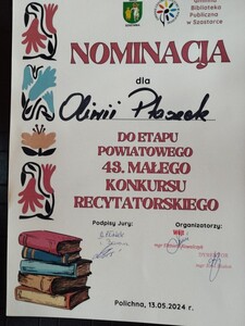 W dniu 13. 05.2024r. w GCK w Polichnie odbyły się gminne eliminacje 43 Małego Konkursu Recytatorskiego. Naszą szkołę reprezentowały: Zuzanna Samojedna- kl. I, Ptaszek Oliwia- kl. III, oraz Alicja Mysłowska- kl. VI. Wszyscy uczestnicy eliminacji otrzymali nagrody książkowe oraz pamiątkowe dyplomy. Nominację do etapu powiatowego, który odbędzie się 21 maja w Dzierzkowicach zdobyła uczennica klasy trzeciej- Oliwia Ptaszek. Wszystkim dziękujemy za wysiłek włożony w przygotowanie się do konkursu a naszej laureatce gratulujemy i życzymy powodzenia na etapie powiatowym.