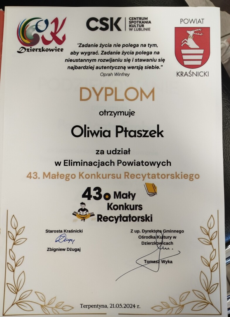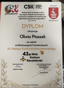Dnia 21.05.2024 r. w Gminnym Ośrodku Kultury w Dzierzkowicach odbyły się eliminacje powiatowe 43 Małego Konkursu Recytatorskiego. Naszą szkołę reprezentowała uczennica klasy trzeciej Oliwia Ptaszek. Oliwia pięknie recytowała wiersz Jana Brzechwy ,,Stonoga”. Wszyscy uczestnicy otrzymali nagrody książkowe i dyplomy. Konkurencja była ogromna ! Poziom jaki zaprezentowały dzieci był bardzo wysoki. Konkurs był okazją do rozwijania zdolności recytatorskich, okazją do przeżycia doznań artystycznych a także umożliwił rywalizację w przyjaznej atmosferze. Gratulujemy Oliwce występu i życzymy dalszych sukcesów!