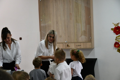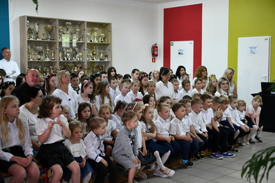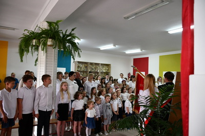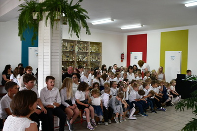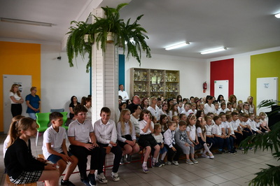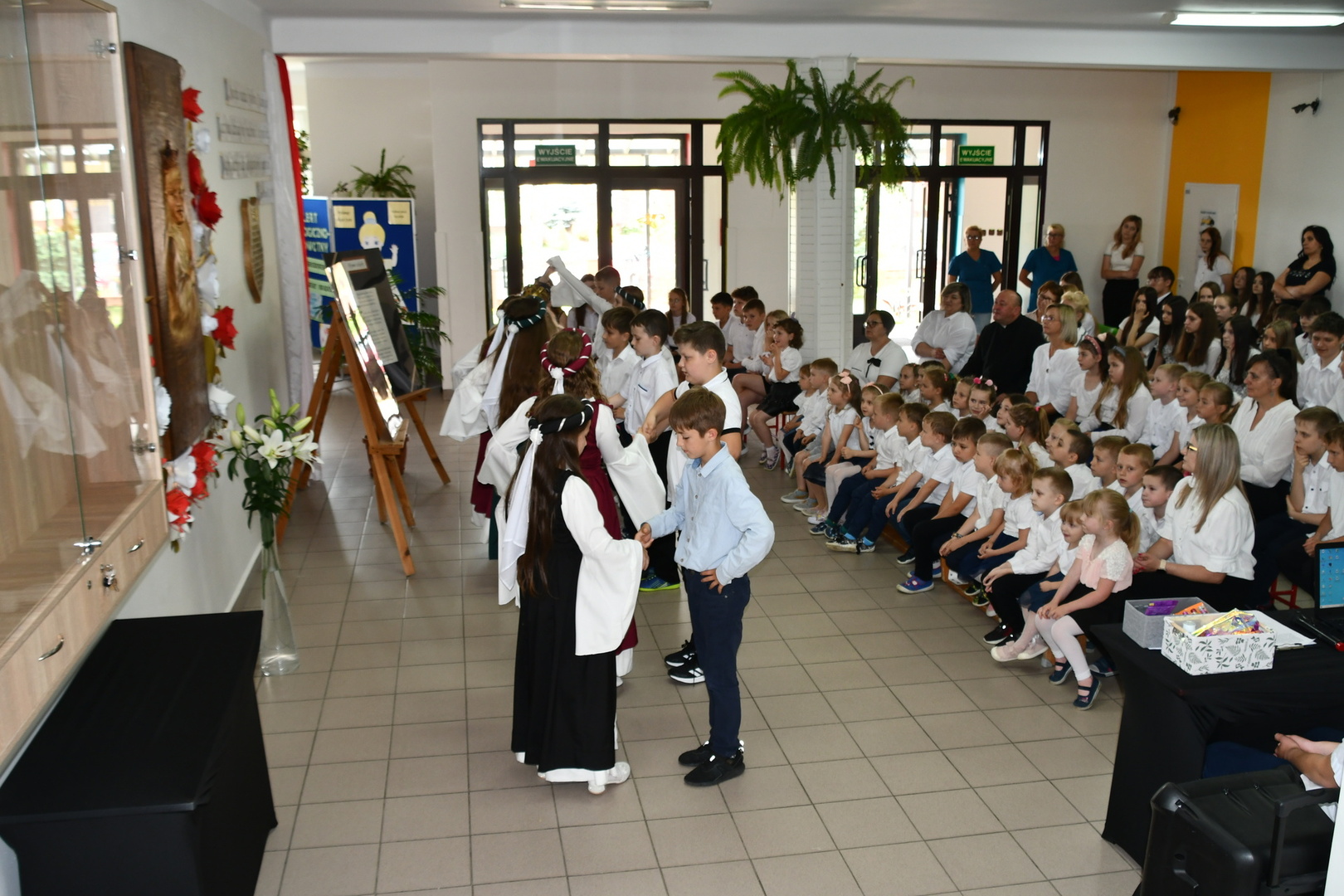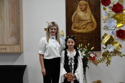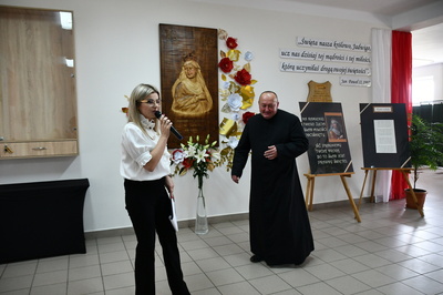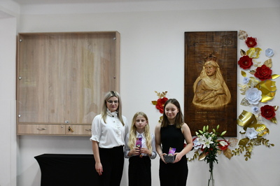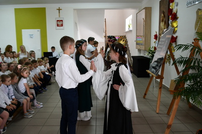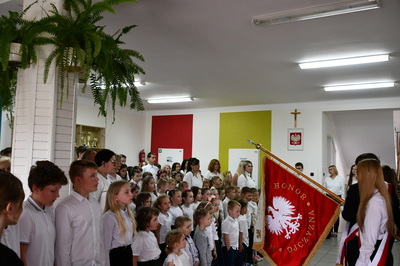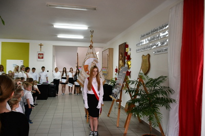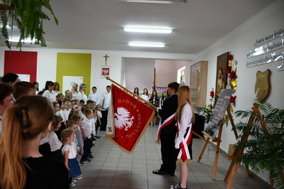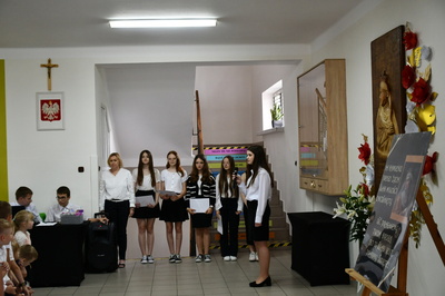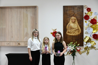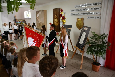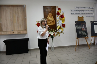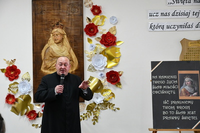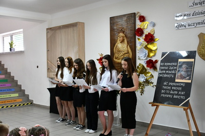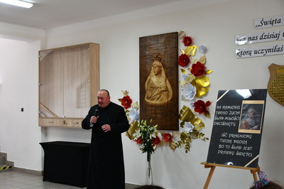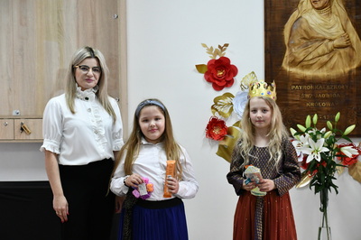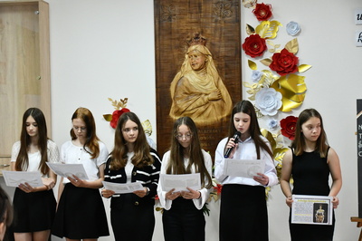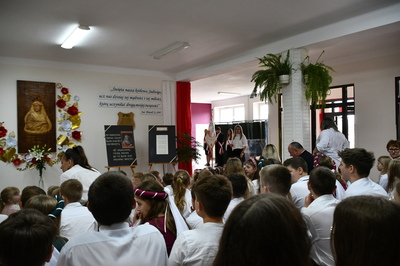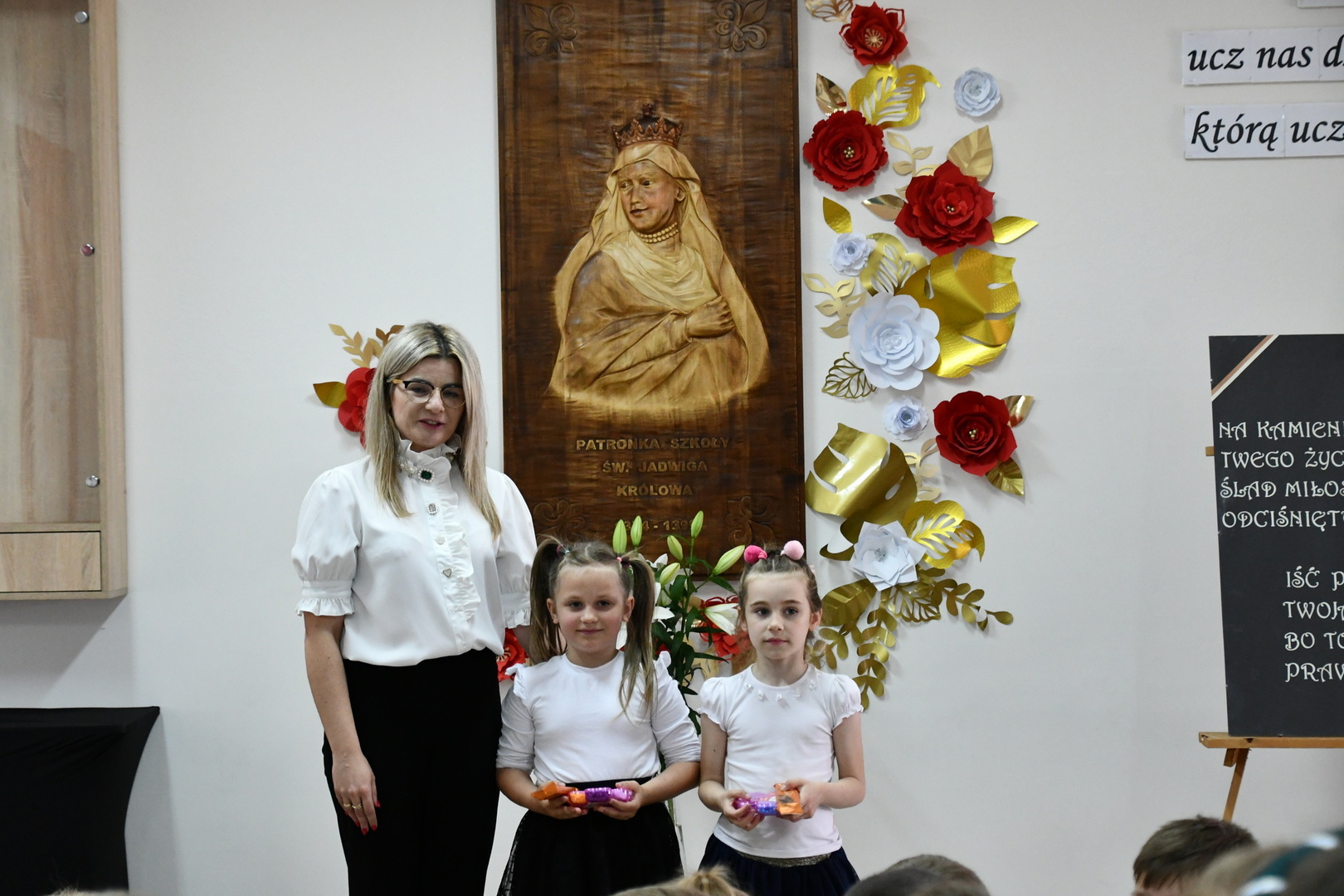 Następnie ksiądz proboszcz Piotr Wąsek przybliżył nam historię naszej patronki, podsumował jej pełne oddania i poświęcenia życie. Podkreślił, że nasza patronka, św. Jadwiga Królowa, jest opiekunką każdego z nas i zawsze możemy się do niej zwrócić o pomoc. Na koniec pani dyrektor wręczyła nagrody za udział w konkursie na odśpiewanie hymnu szkoły.
