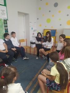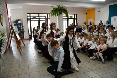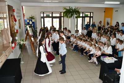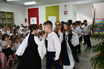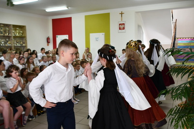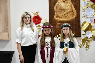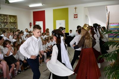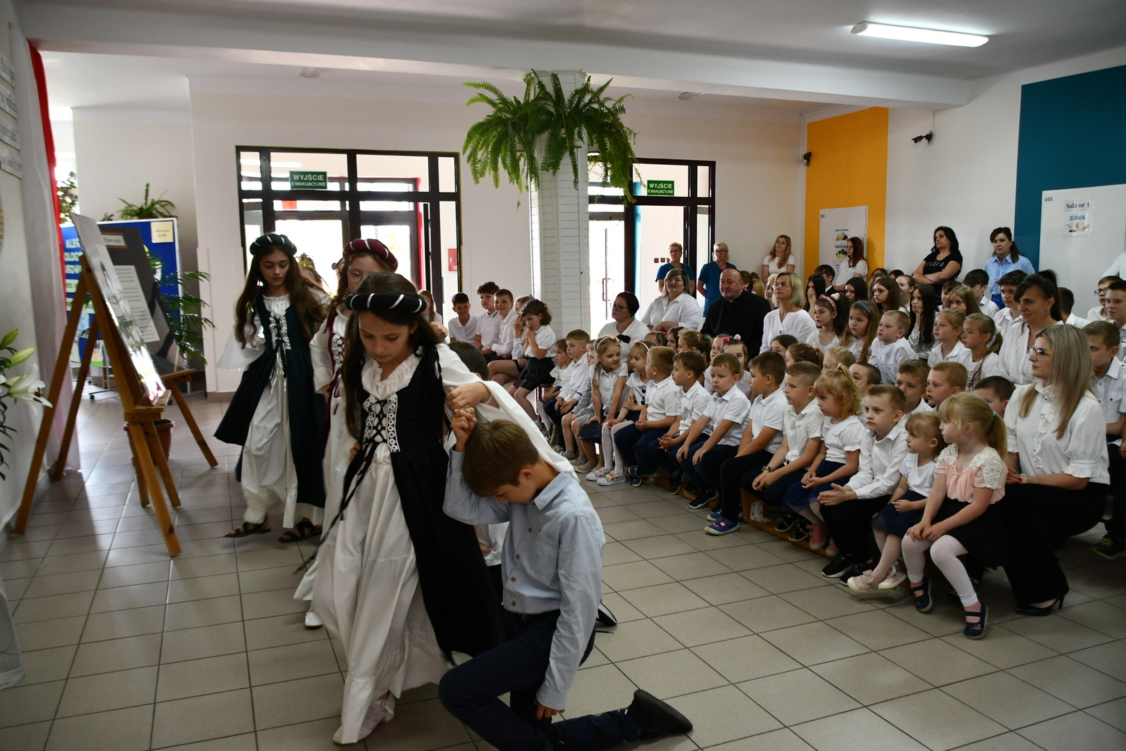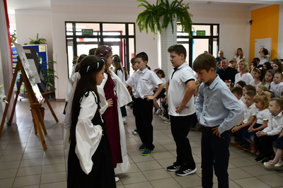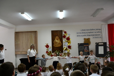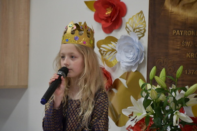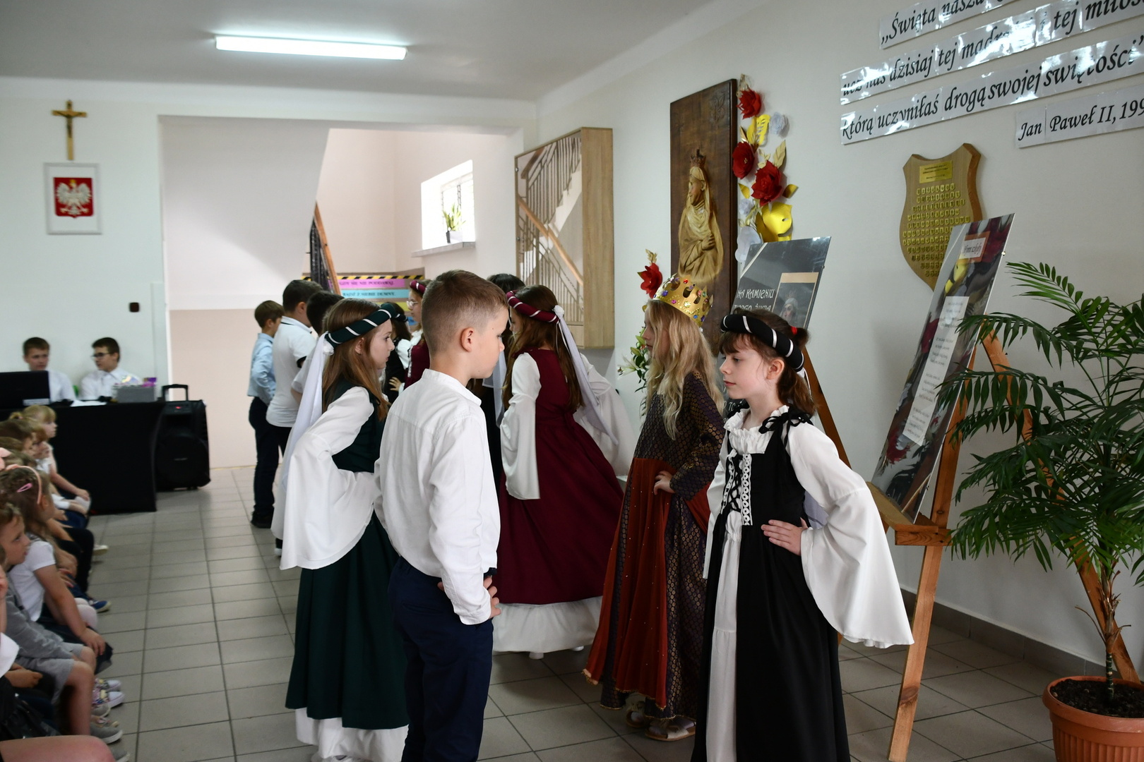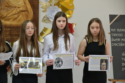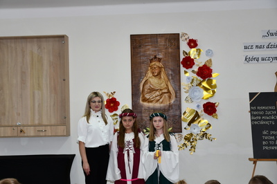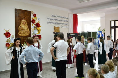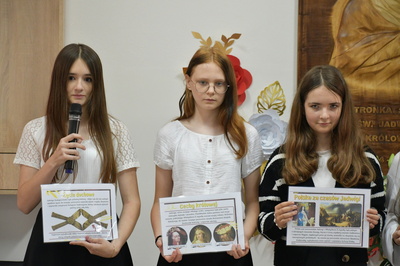 Na początku odśpiewaliśmy hymn naszej szkoły. Potem przypomnieliśmy sobie życiorys św. Jadwigi, która była nie tylko królową, ale przede wszystkim osobą o wielkim sercu, zawsze gotową pomagać innym. Aby przenieść się do czasów, kiedy żyła św. Jadwiga, zaśpiewaliśmy piosenkę "Dziesięć lat miałam..." i podziwialiśmy średniowieczny taniec w wykonaniu uczniów klasy 3.