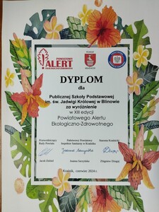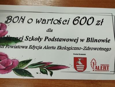 Nasza szkoła za udział w Alercie ekologiczno-zdrowotnym tym razem otrzymała wyróżnienie co przełożyło się na bon podarunkowy w wysokości 600 zł . Dziękujemy za ufundowanie nagrody a koordynatorom i uczniom za aktywny udział w realizacji zadań.
