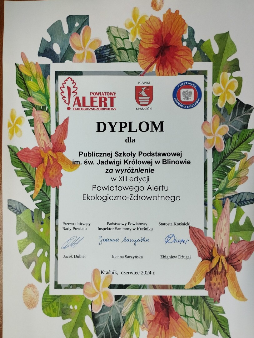 W dniu 13.06.2024 r. odbyło się podsumowanie XIII edycji Alertu zdrowotno - ekologicznego organizowanego przez Wydział Rolnictwa i Ochrony Środowiska Starostwa Powiatowego w Kraśniku wraz z Powiatową Stacją Sanitarno-Epidemiologiczną w Kraśniku. Alert skierowany był do szkół z terenu Powiatu Kraśnickiego, wymagał dużego zaangażowania i wkładu pracy ze strony nauczycieli i uczniów.