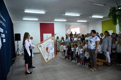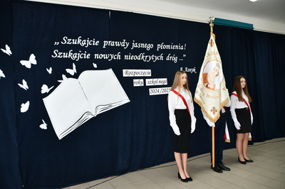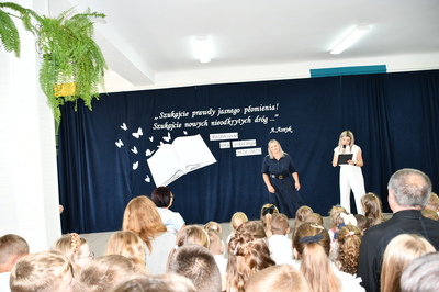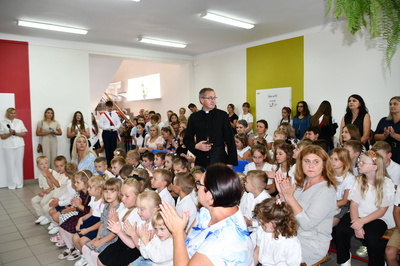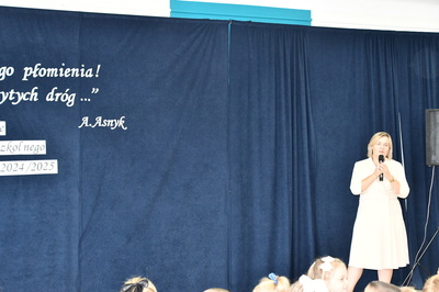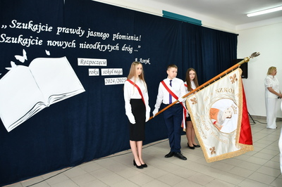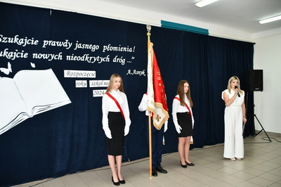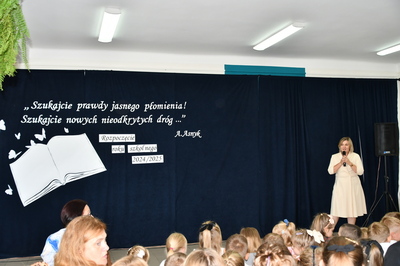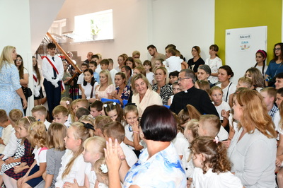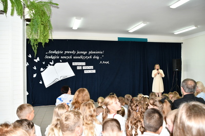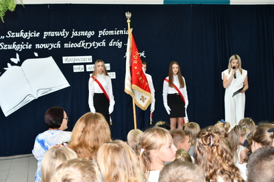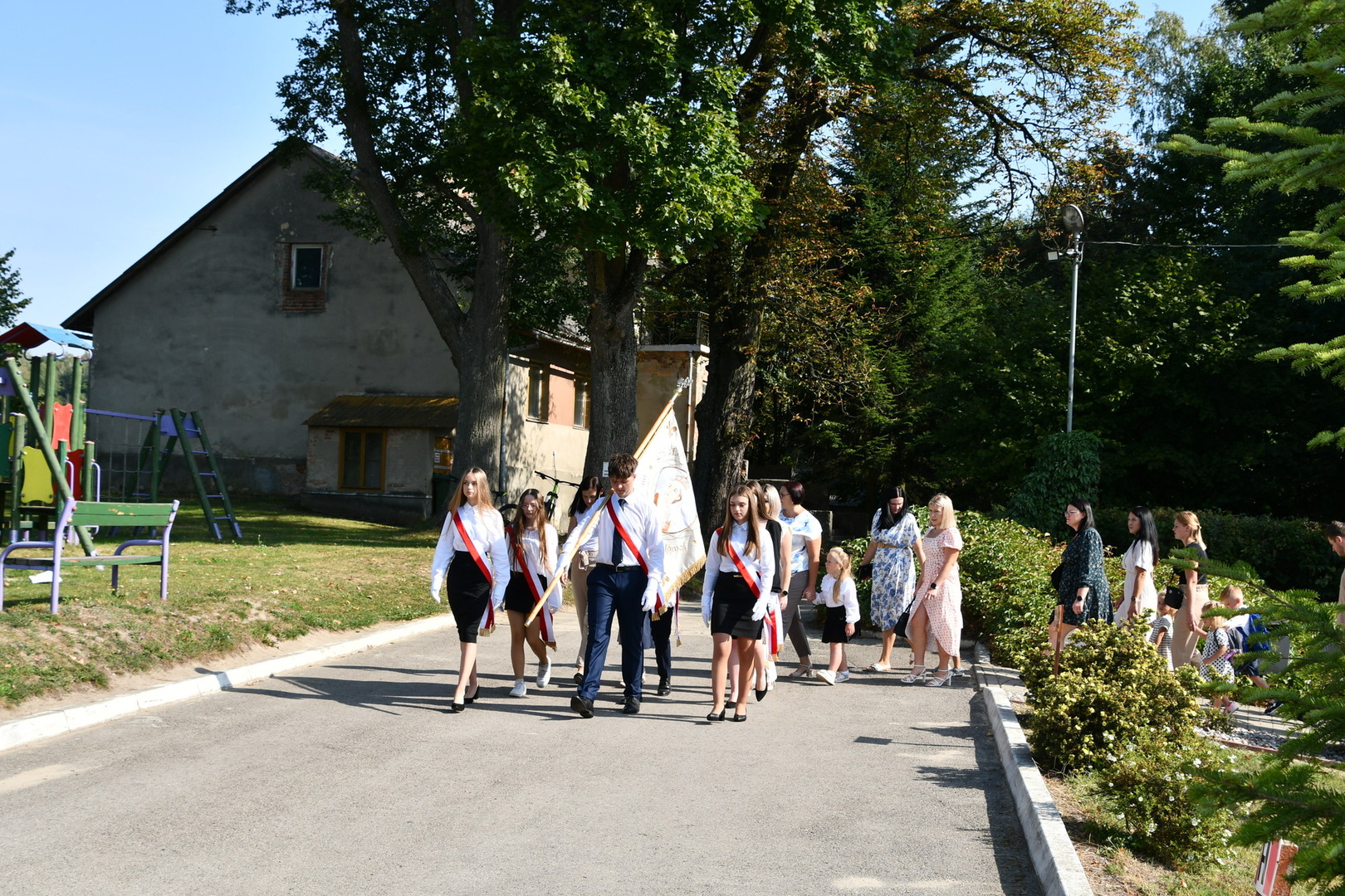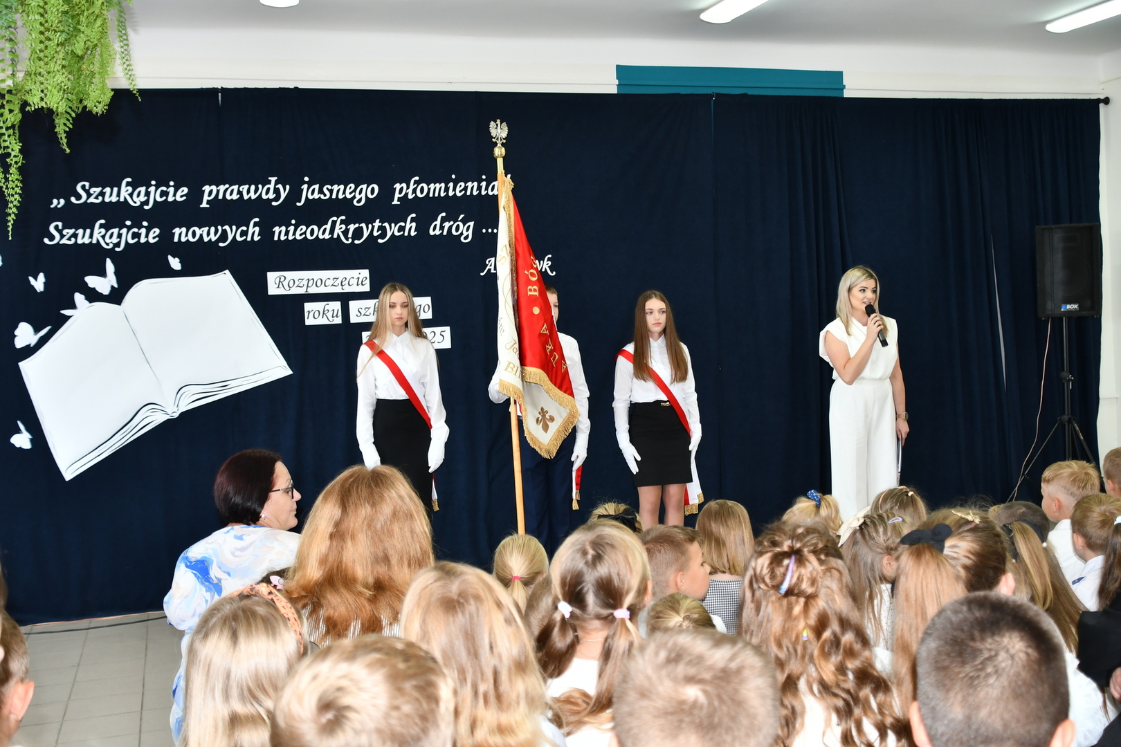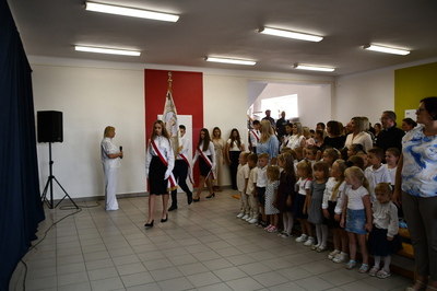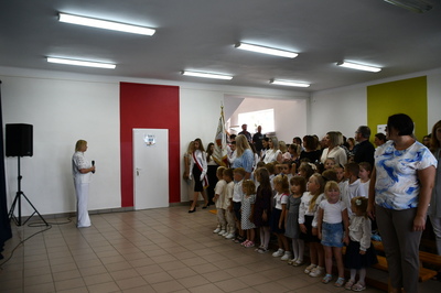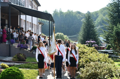 Po zakończeniu nabożeństwa udaliśmy się do szkoły, gdzie odbyło się oficjalne powitanie uczniów i nauczycieli przez Panią Dyrektor Ilonę Stolarz oraz Panią Wójt Elżbietę Kowalczyk. W ich słowach padły ciepłe życzenia sukcesów, wytrwałości i wielu nowych odkryć na ścieżce edukacyjnej. Odśpiewaliśmy hymn państwoy oraz hymn Naszej Szkoły.