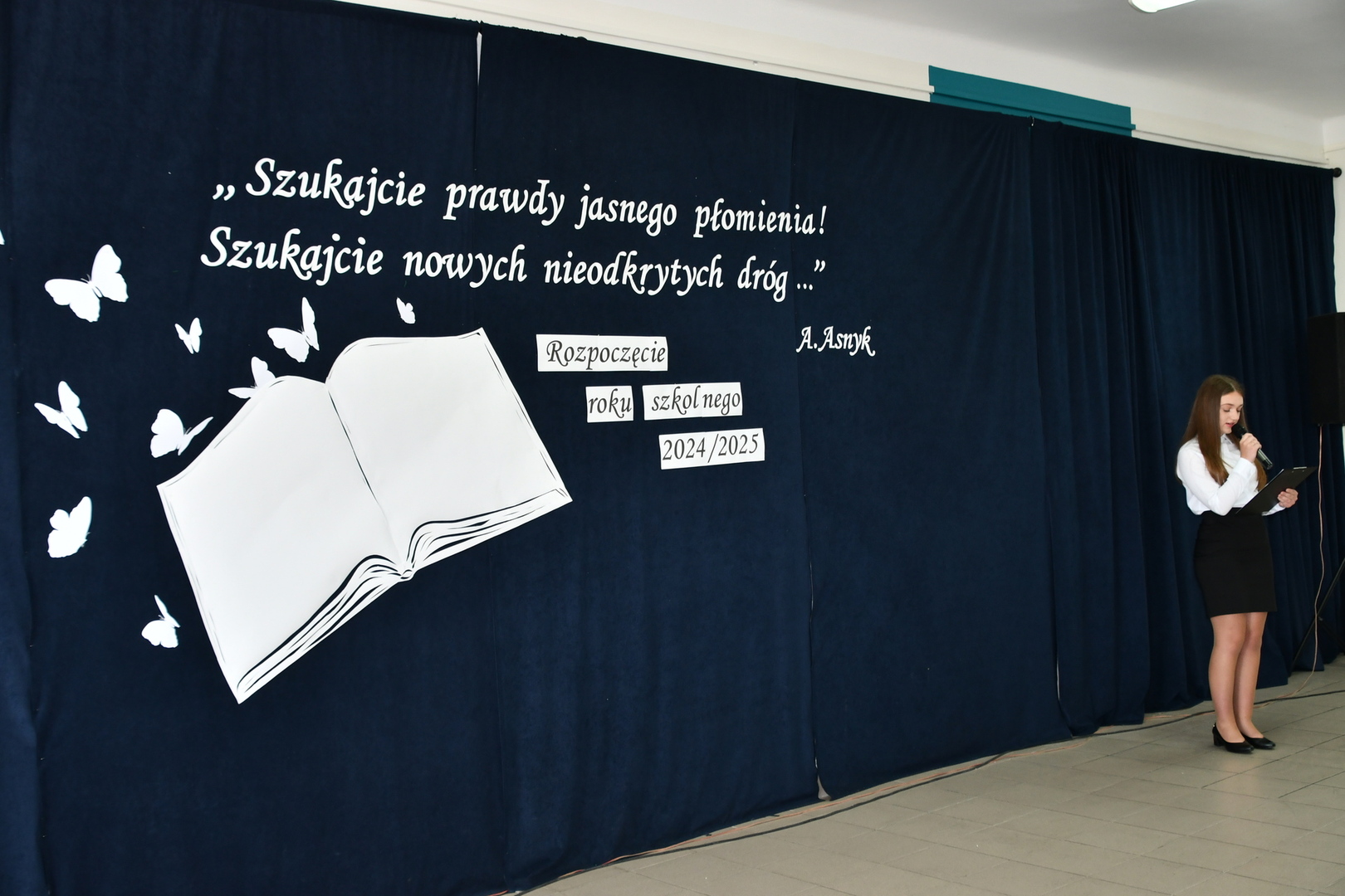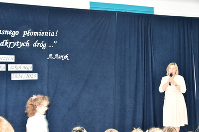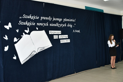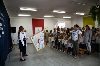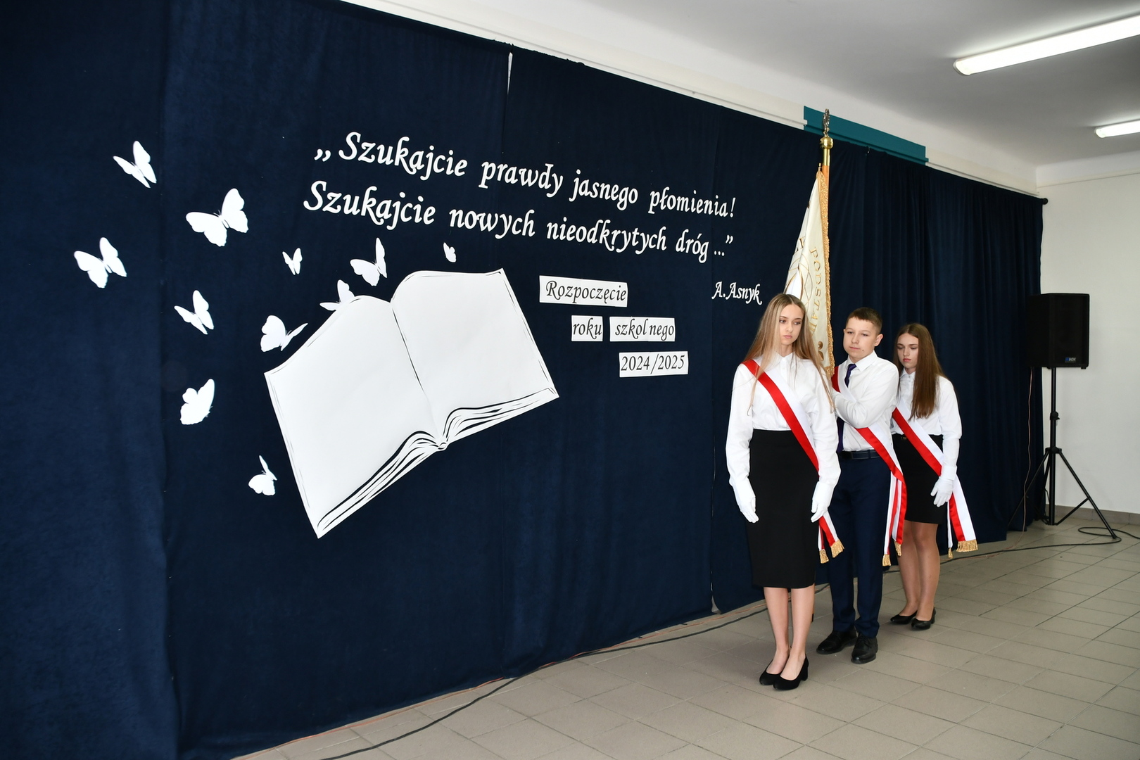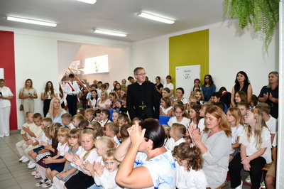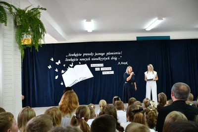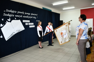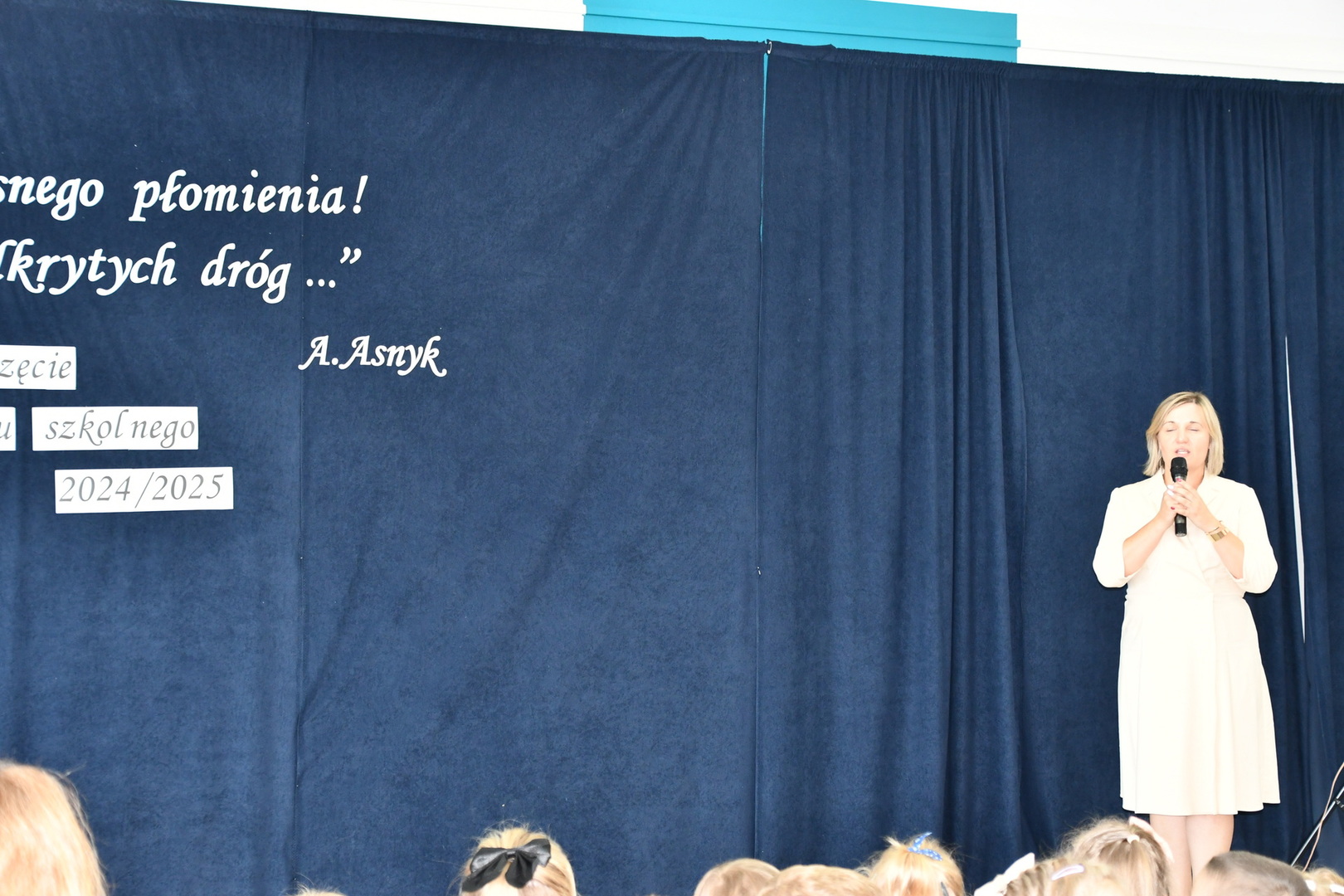 Po zakończeniu nabożeństwa udaliśmy się do szkoły, gdzie odbyło się oficjalne powitanie uczniów i nauczycieli przez Panią Dyrektor Ilonę Stolarz oraz Panią Wójt Elżbietę Kowalczyk. W ich słowach padły ciepłe życzenia sukcesów, wytrwałości i wielu nowych odkryć na ścieżce edukacyjnej. Odśpiewaliśmy hymn państwoy oraz hymn Naszej Szkoły.