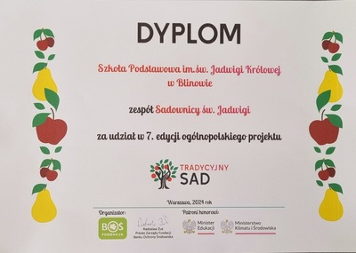 Z radością ogłaszamy wyniki drugiego etapu 7 edycji projektu „Zakładamy sad”. Nasza Szkoła reprezentowana przez grupę projektową „Sadownicy św. Jadwigi” pod opieką Pani Moniki Lewandowskiej zajęła 6 miejsce w Polsce! Każda z osób biorących udział w projekcie otrzymała pamiątkowy dyplom i drobny upominek.