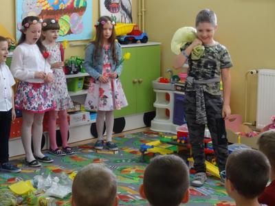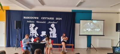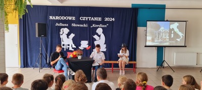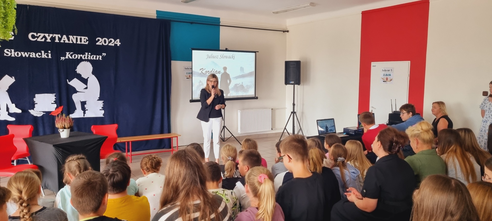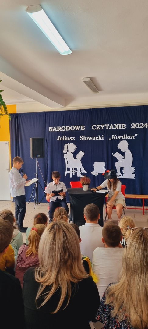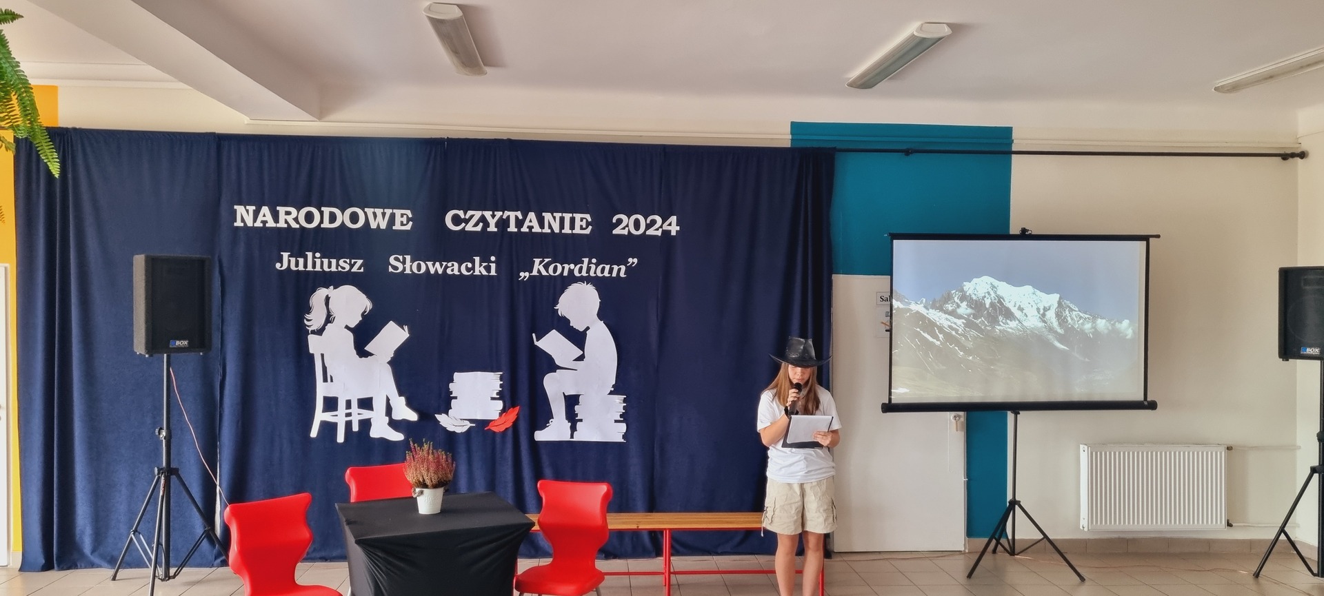 Narodowe Czytanie utrzymane było w konwencji programu telewizyjnego. Prowadząca wcieliła się w postać podróżnika i zaprosiła zebranych do udziału w niesamowitej podróży śladami Kordiana. Wszyscy odwiedzili wiejską chatę i wysłuchali opowieści „O Janku, co psom szył buty”. Następnie oglądając program artystyczny pt. „Podróże duże i nieduże” wędrowali wraz z głównym bohaterem po Europie. Zwiedzili Londyn, Dover, Rzym, Watykan, a także wysłuchali monologu Kordiana na szczycie Mont Blanc. W rolę bohaterów dramatu – z ogromnym zaangażowaniem, wcielili się uczniowie z klas VI-VIII. Dodatkowym elementem wzbogacającym wydarzenie była piękna dekoracja, pobudzająca wyobraźnię muzyka oraz prezentacja multimedialna.