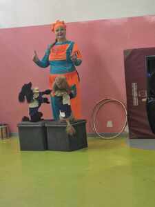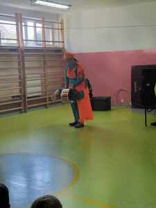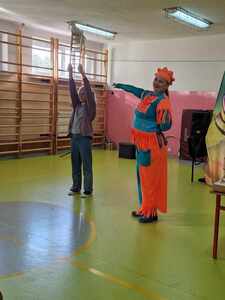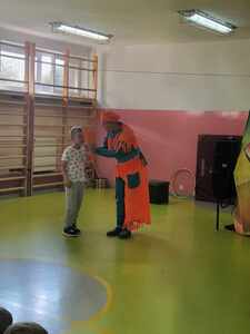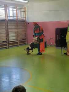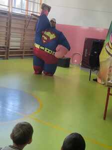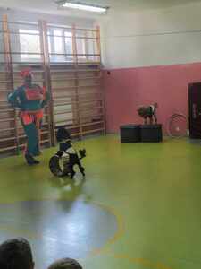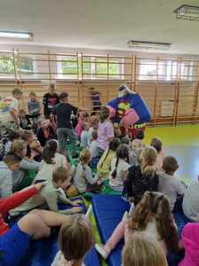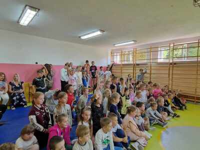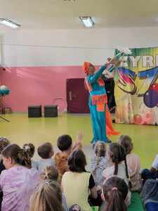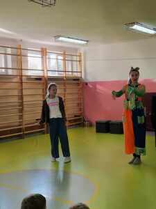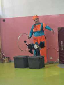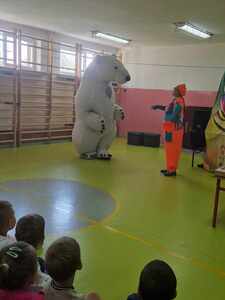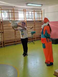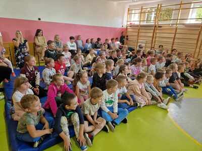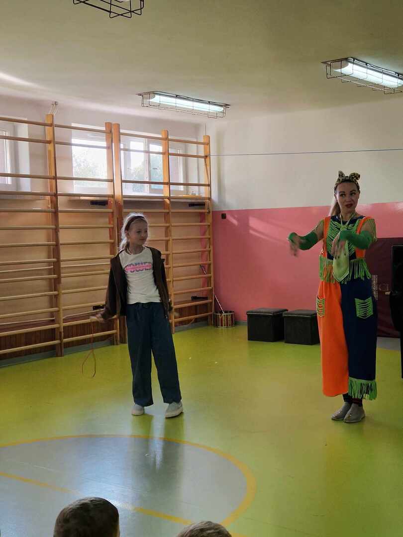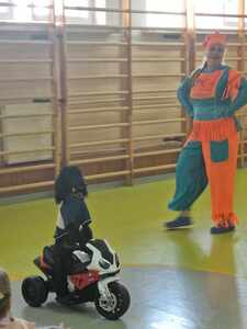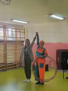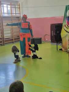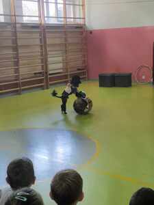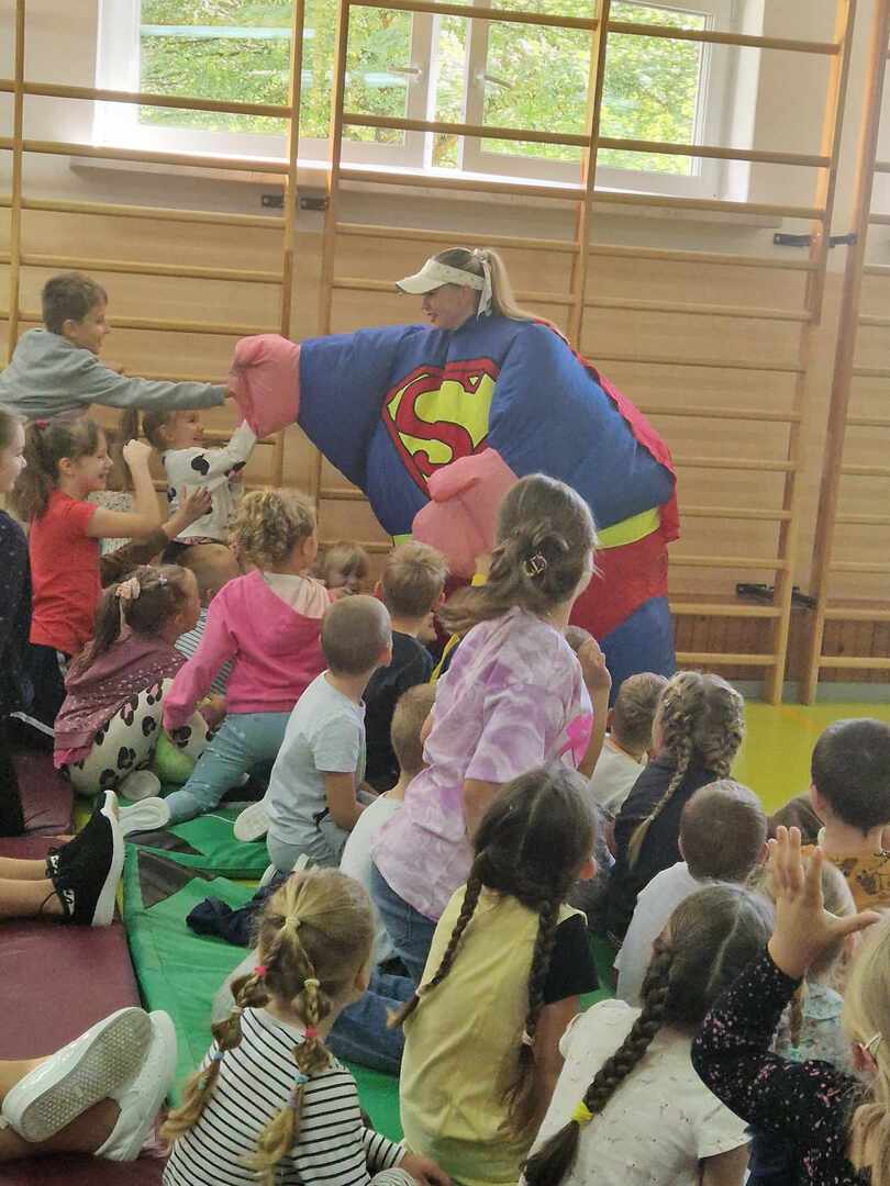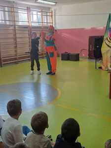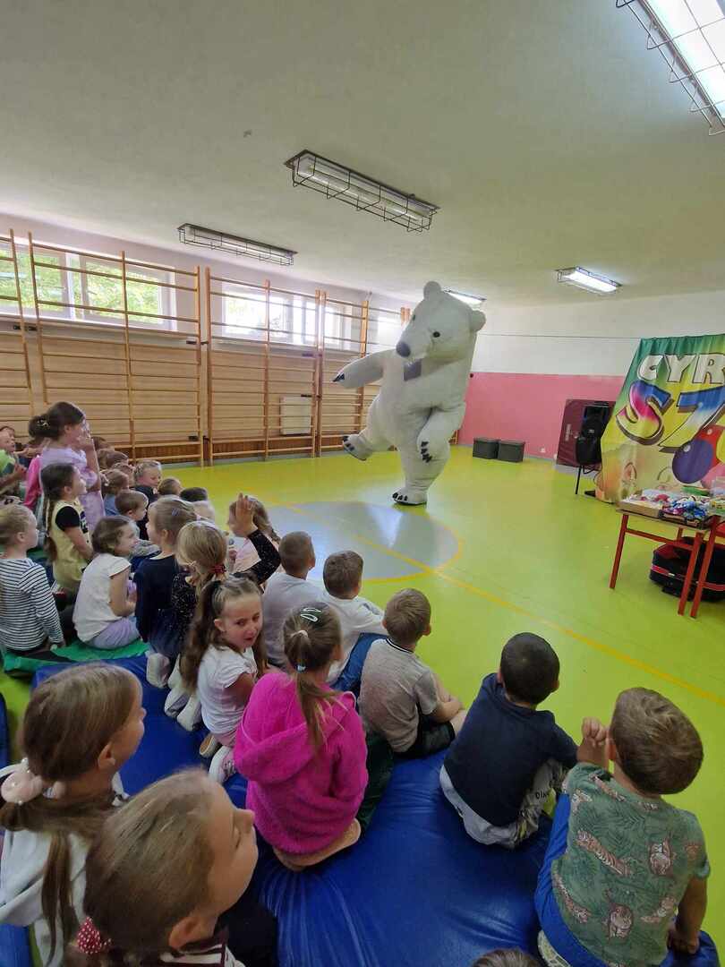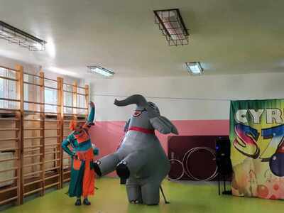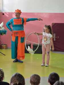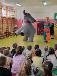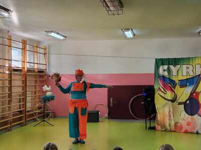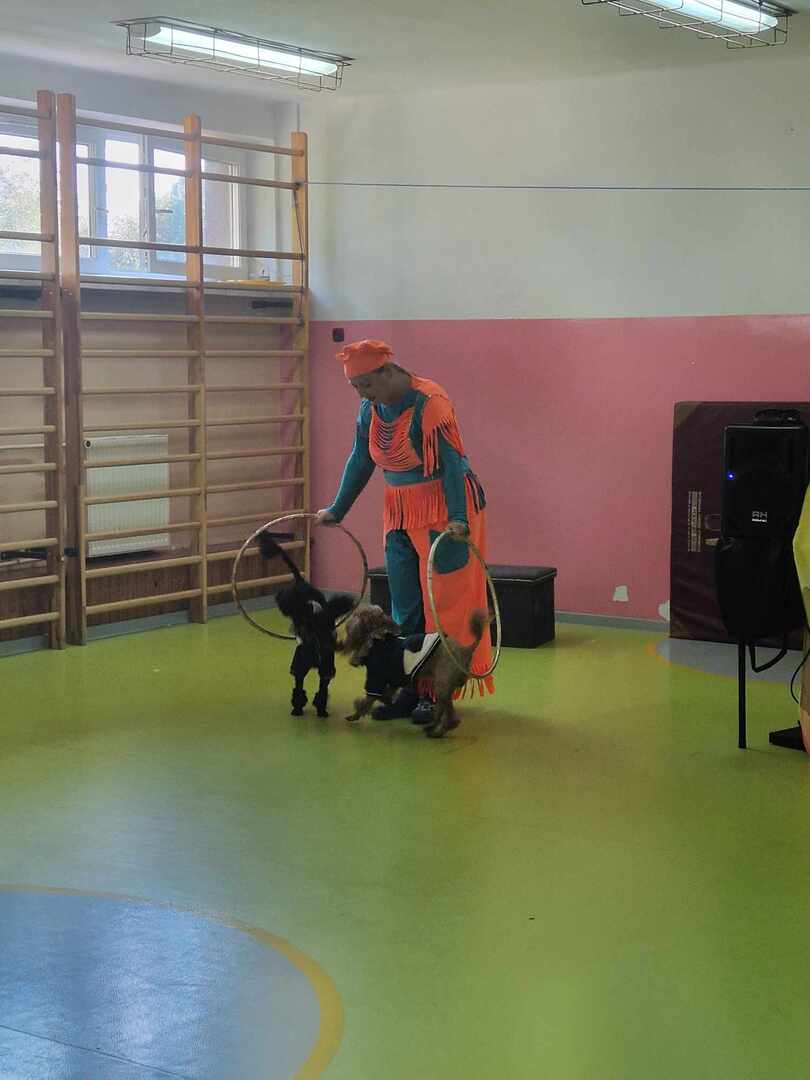 W dniu 23 września 2024 r. naszą szkołę odwiedzili artyści cyrkowi ukraińskiego CYRKU „SZOK”. Wszystkie dzieci, te najmłodsze, jaki i te starsze mogły podziwiać popisy i pokazy sztuczek cyrkowych. Największe emocje wzbudziły pokaz umiejętności wytresowanych piesków, które wykonywały na przyrządach różnorodne zadania trenerki, np. skakały przez obręcze, walec przypominający otwarty bębenek i spacerowały w rytm muzyki oraz pokaz gołąbków zgrabnie poruszających się na cyrkowych przyrządach. Dużo śmiechu wywołały także występy dmuchanego Supermena i ogromnych rozmiarów maskotki misia polarnego oraz słonia.