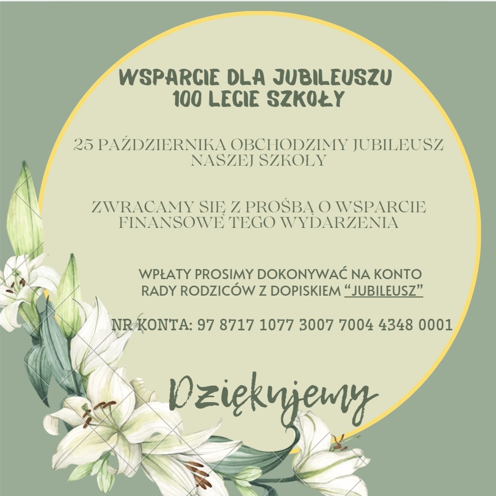 Wpłat prosimy dokonywać na konto Rady Rodziców, z dopiskiem "Jubileusz".