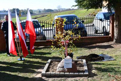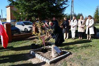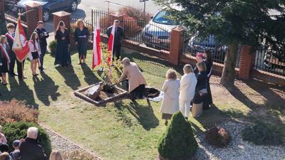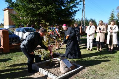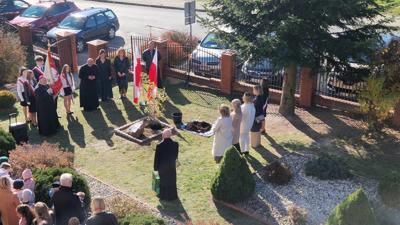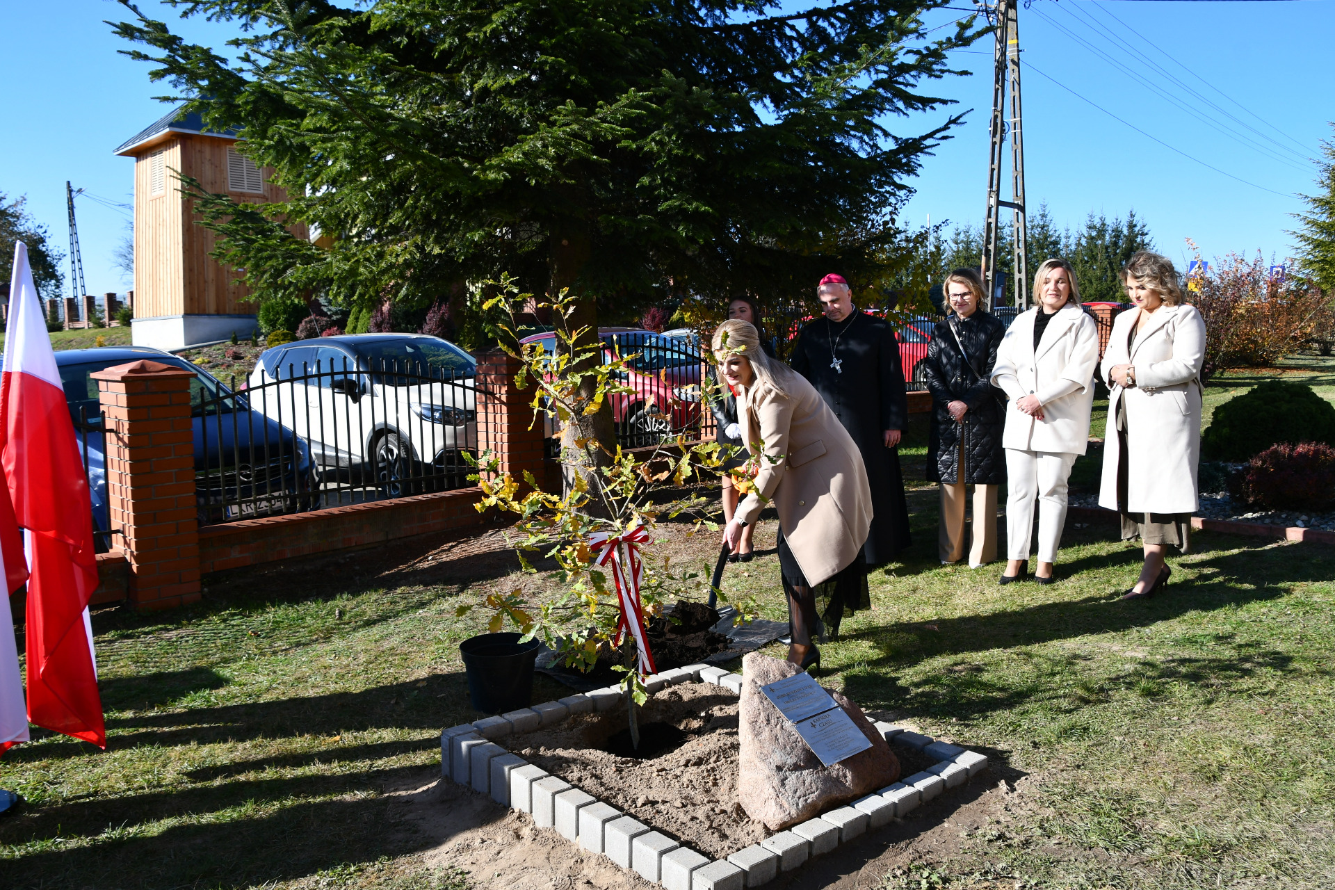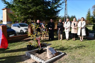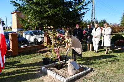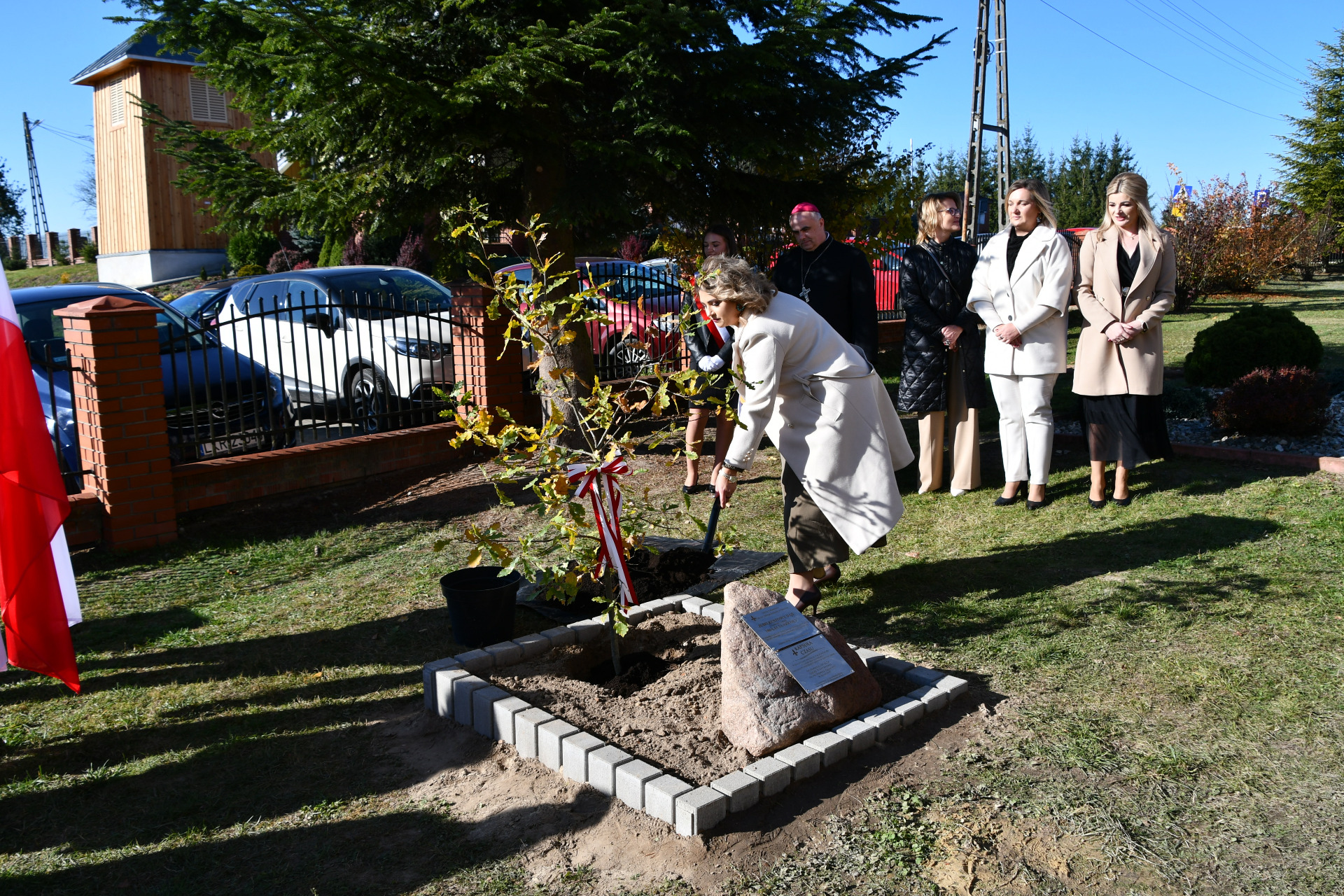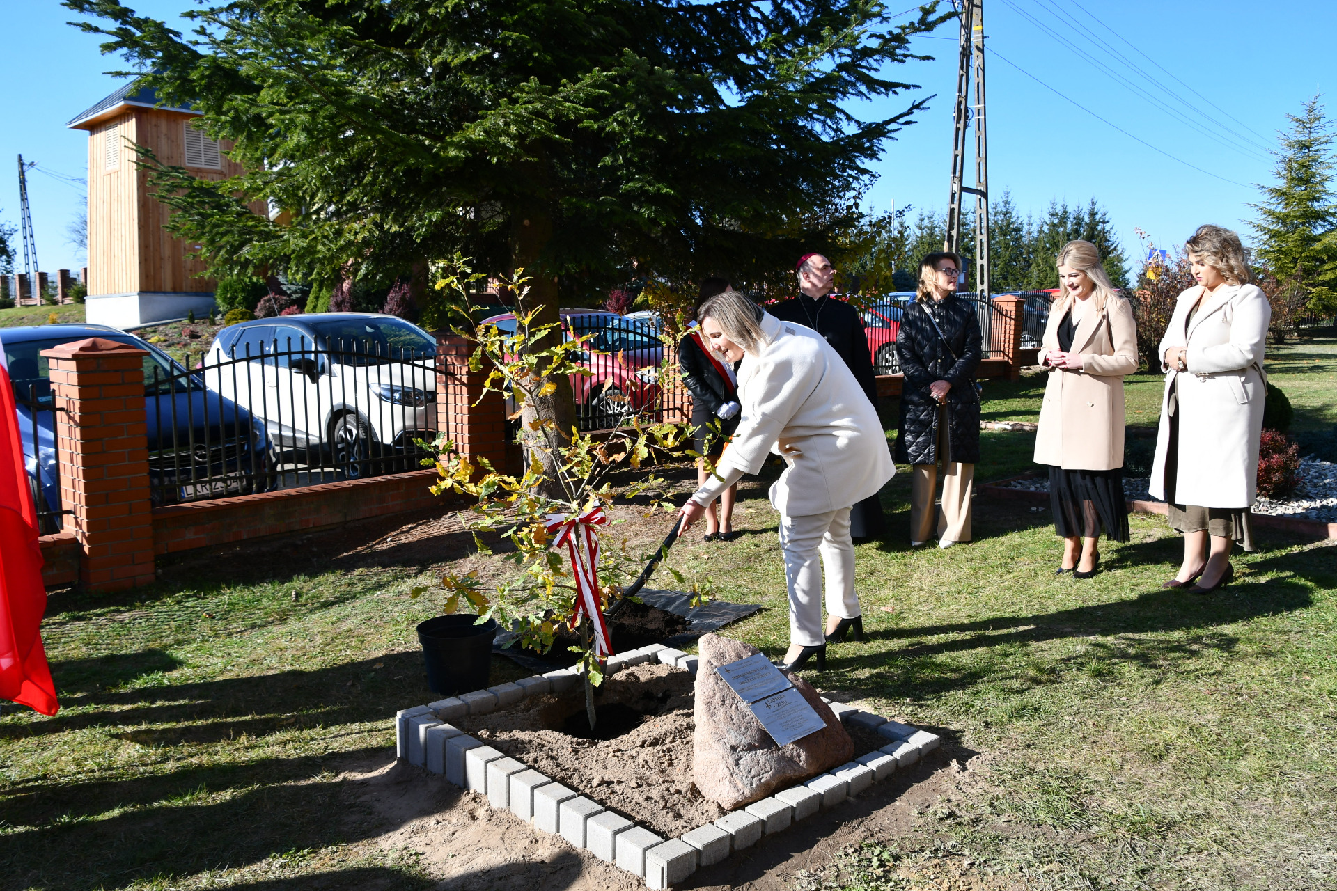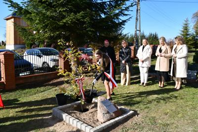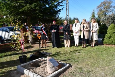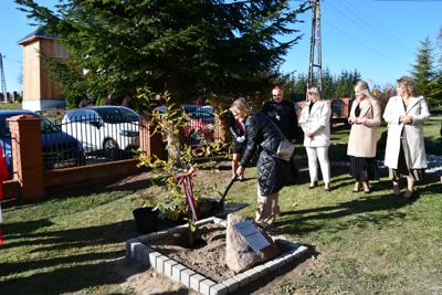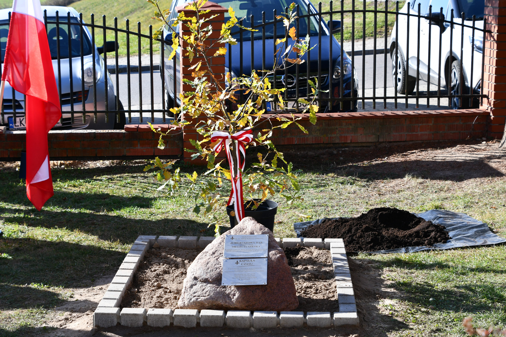 Następnie wszyscy udali się do szkoły, by tam, już w luźniejszej atmosferze, realizować kolejne punkty bogatego programu uroczystości. Najpierw dokonano posadzenia symbolicznego dębu - znaku trwałości, siły, długowieczności, a więc elementów charakteryzujących szkołę w Blinowie i jej wartości. Sadzonkę dębu posadzili wcześniej wymienieni honorowi goście oraz Dyrektor Szkoły - p. Ilona Stolarz, Przewodnicząca Rady Rodziców Szkoły -p. Ola Adamska i Przewodnicząca Samorządu Uczniowskiego - Aleksandra Pawłasek. Poświęcono także pamiątkową tablicę. Ciekawym wydarzeniem jubileuszu było umieszczenie obok posadzonego dębu kapsuły czasu, którą ulokowano pod wielkim kamieniem. Stanowi ona przesłanie przyszłym pokoleniom śladów teraźniejszości, sposobów funkcjonowania i realizowania się w określonej rzeczywistości politycznej, gospodarczej, kulturalnej i oświatowej. Otwarcie kapsuły planuje się za 50 lat.