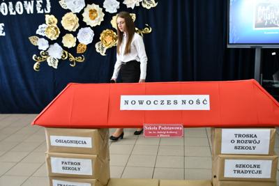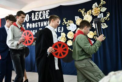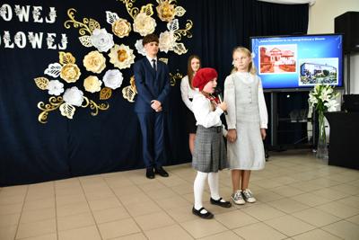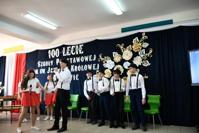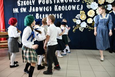 Dodatkowe zainteresowanie wzbudził dźwięk dzwonka, tego ręcznego, z dawnych lat - rozpoczęła się część artystyczna, za którą odpowiedzialna była p. M. Kwiatkowska, a w trakcie występów pomagała jej p. M. Biżek. Utwór Ireny Santor „ Powrócisz tu” dał jasny przekaz , jak ważne jest rodzinne gniazdko, miejsce skąd wyruszamy w świat . Nie mogło zabraknąć „wycieczek” w przeszłość - o historii 100-letniej edukacji w Blinowie sprawnie opowiadał kronikarz. W tej roli sprawdził się uczeń klasy VIII-Igor Wereski. O narrację i płynne łączenie scenek z życia szkoły w różnych okresach jej funkcjonowania zadbała uczennica klasy VIII Ola Pawłasek. Umiejętne dobranie piosenek i układów tanecznych sprawiło, że wszyscy zebrani do końca z zainteresowaniem obserwowali występy uczniów. A było ich 45. z klas I i IV-VIII. Gromkie brawa na koniec dowiodły, że był to super występ.