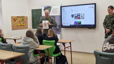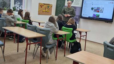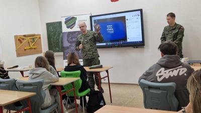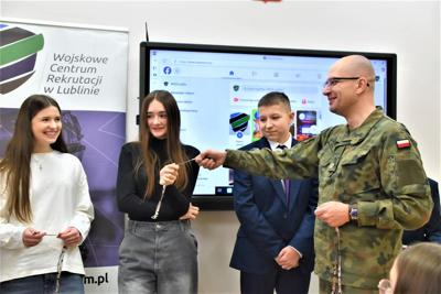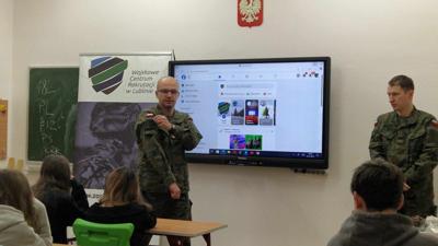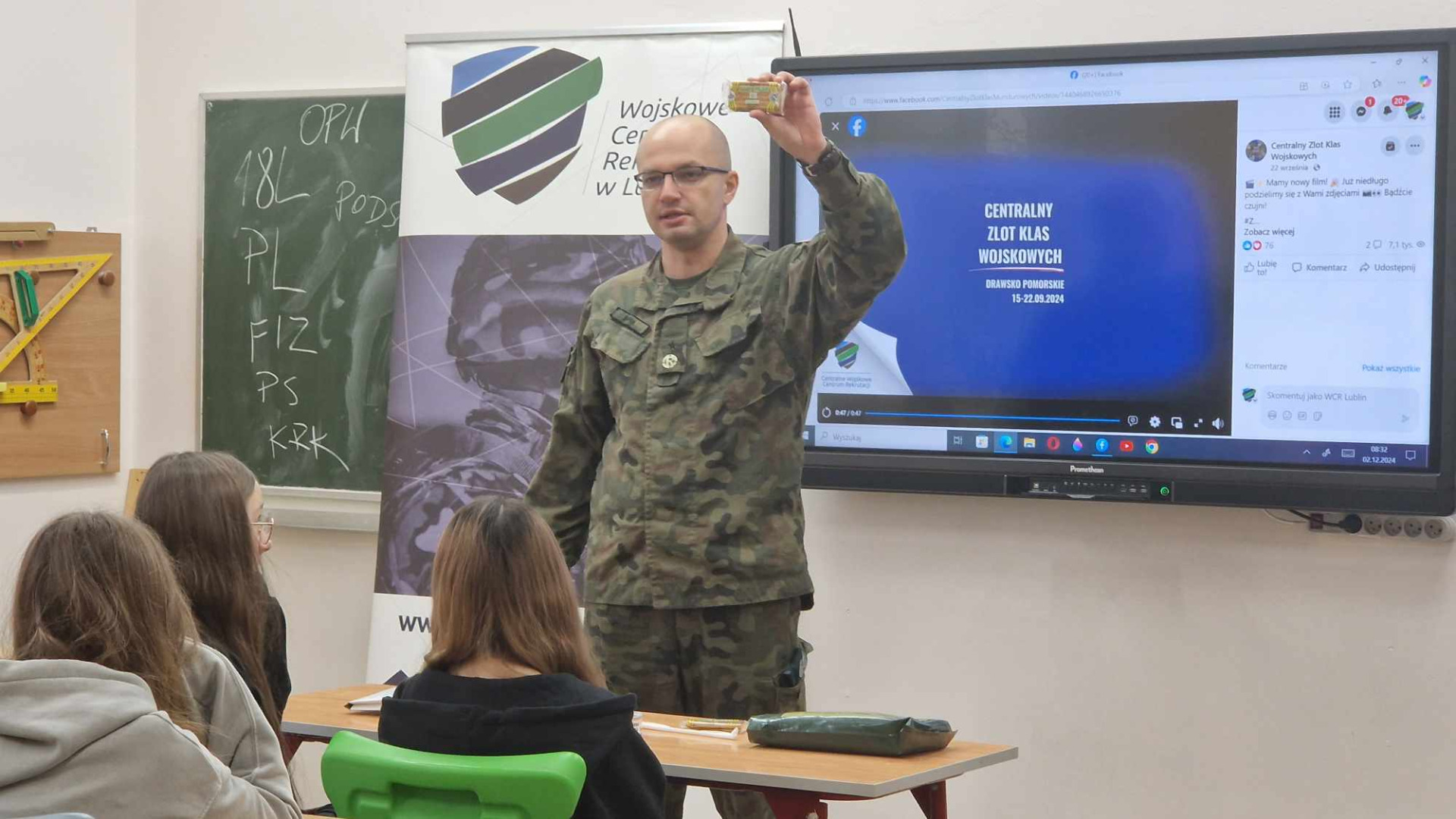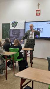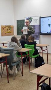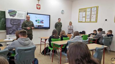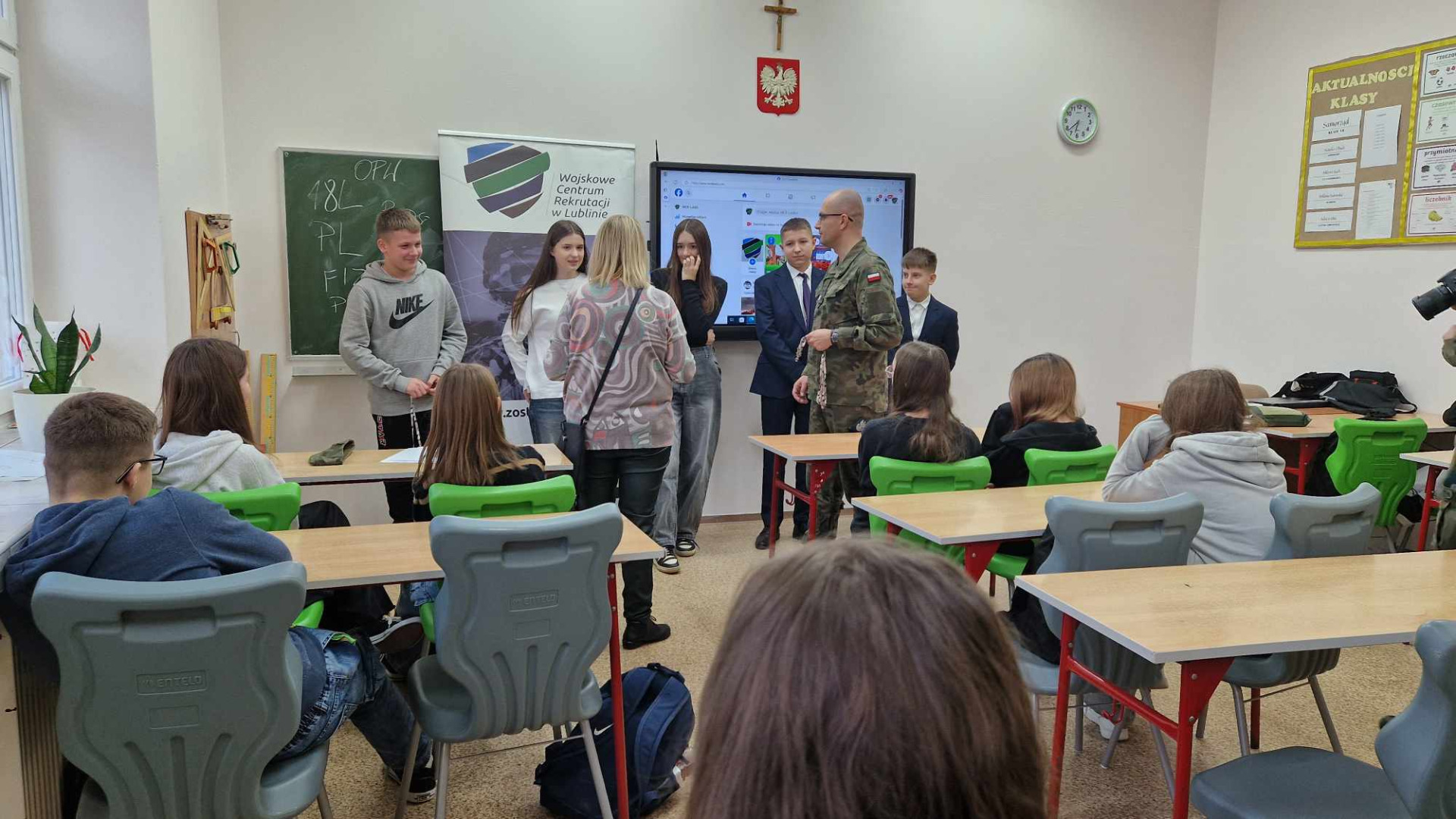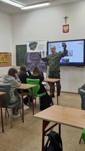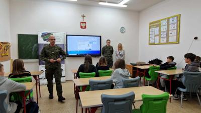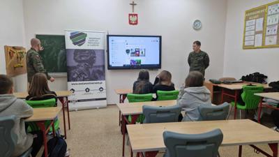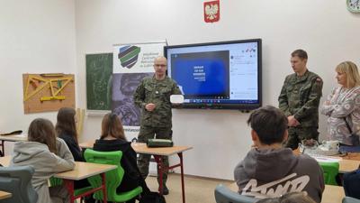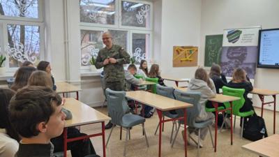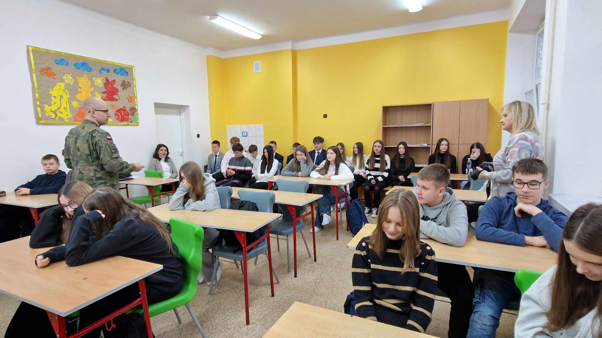 W dniu 2 grudnia 2024 r. w naszej szkole odbyło się spotkanie z uczniami klas VII i VIII w ramach II. edycji programu MEN „Edukacja z wojskiem” projekt „Zawód- Żołnierz”. Młodzież zapoznała się z możliwymi ścieżkami edukacyjno – zawodowymi oraz poznała zasady rekrutacji do Ochotniczej Służby Wojskowej. Podczas rozmów z żołnierzami, uczniowie dowiedzieli się jak w praktyce wygląda służba wojskowa, zostały obalone mity związane z tym zawodem, jak również zapoznali się z wymaganiami, które musi spełnić kandydat na żołnierza. Było to niezwykle inspirujące spotkanie, a młodzież z zaciekawieniem poznała bliżej tak ważny zawód dla naszego państwa.
