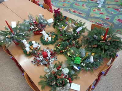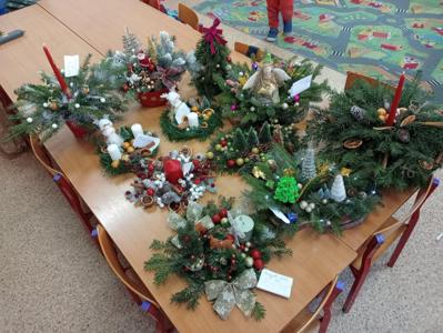 Wykonane stroiki, były nie tylko piękne, ale również pełne świątecznej magii. Wszystkie wykonane prace, wezmą udział w kiermaszu, z którego dochód zostanie przekazany na potrzeby naszej szkoły.