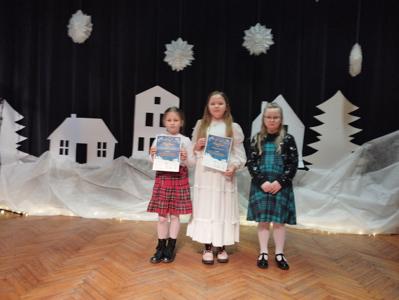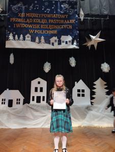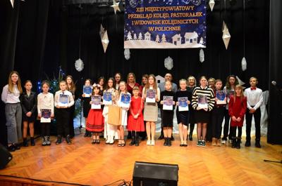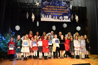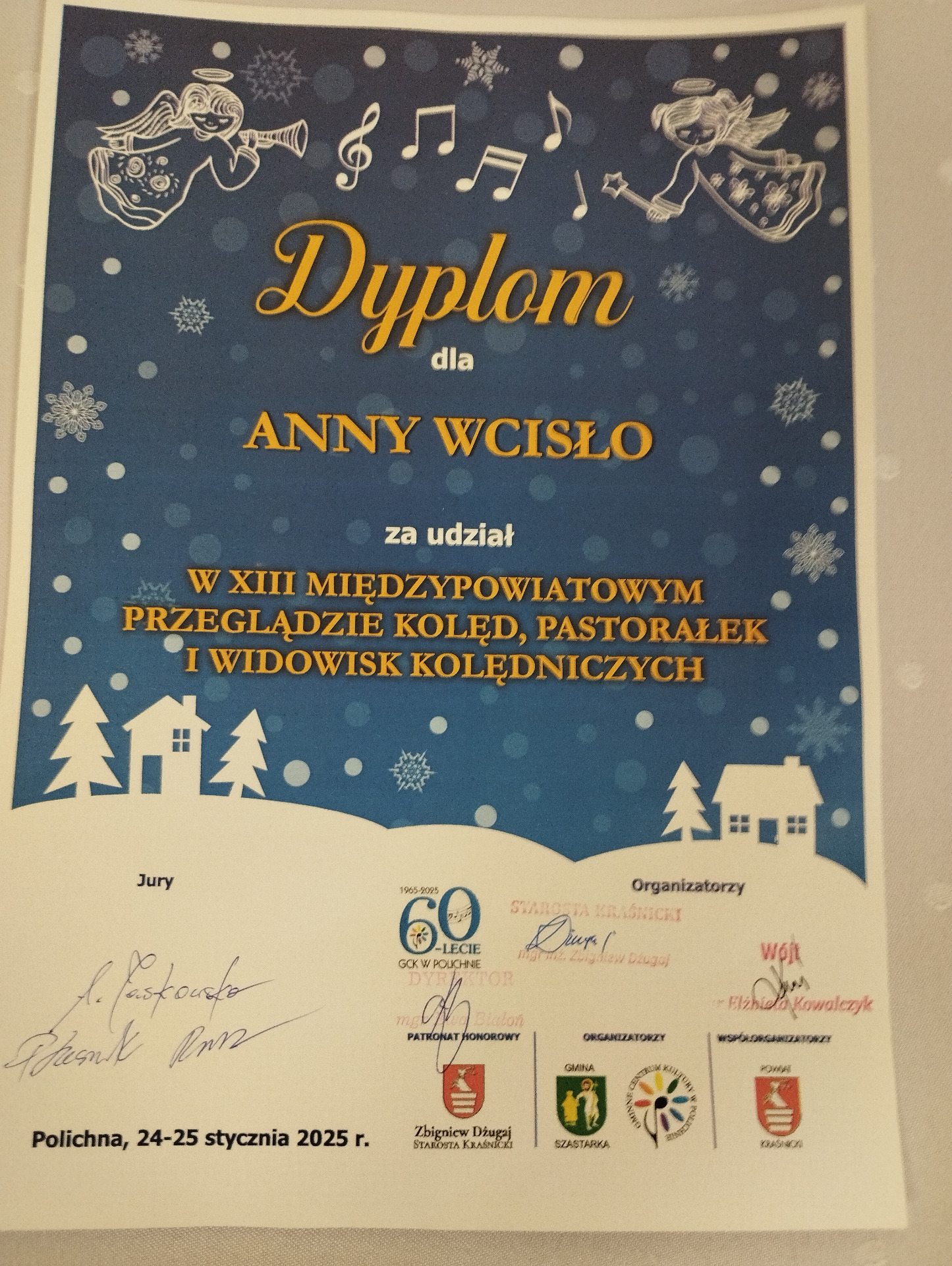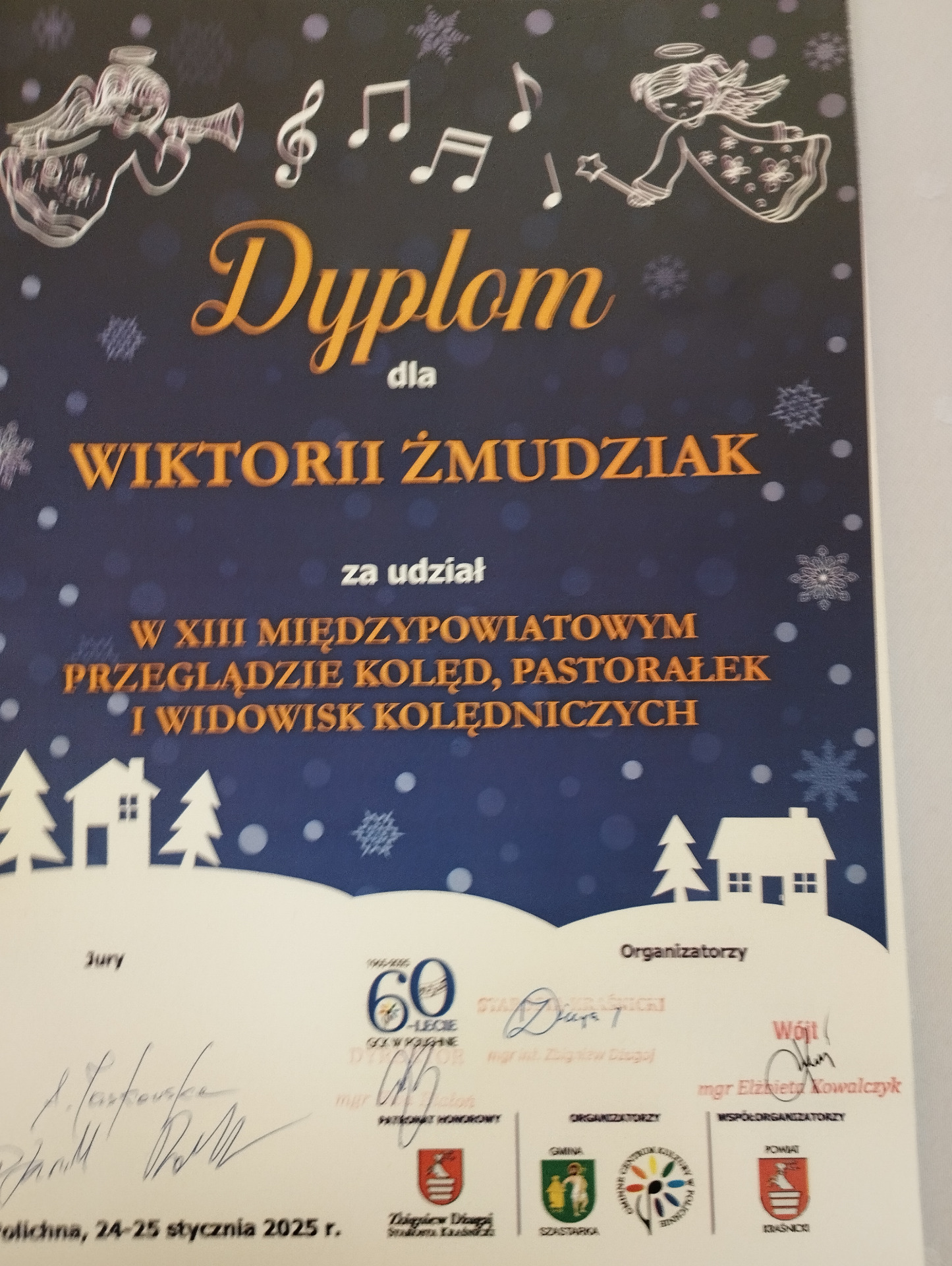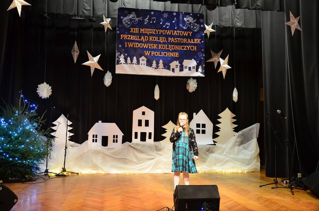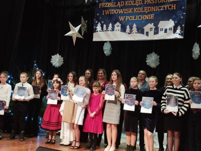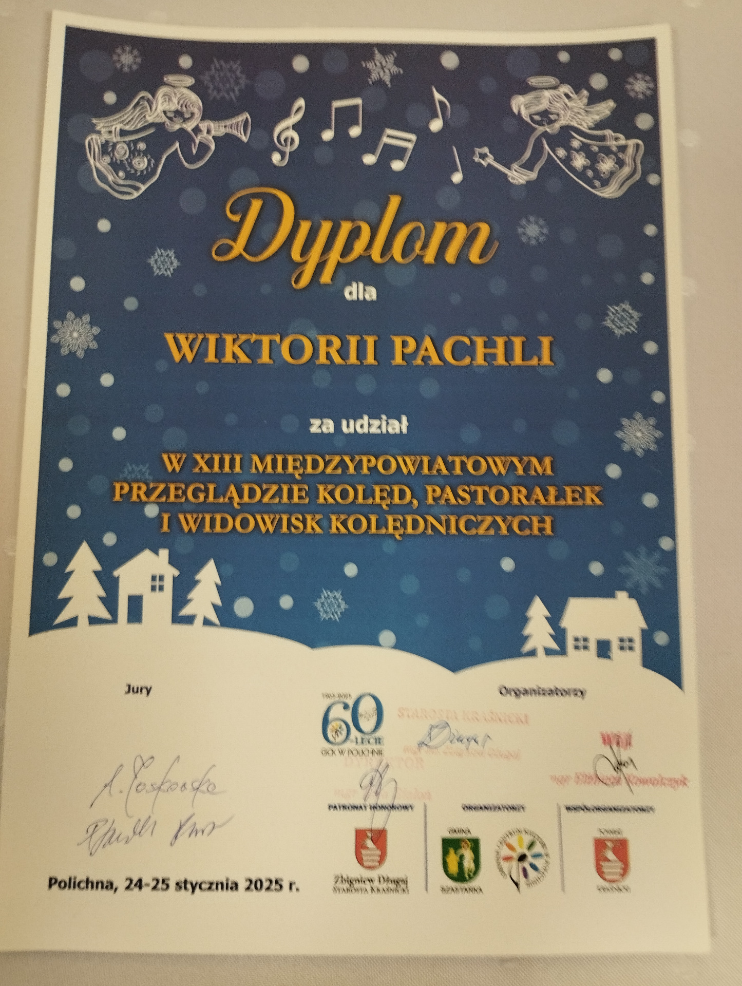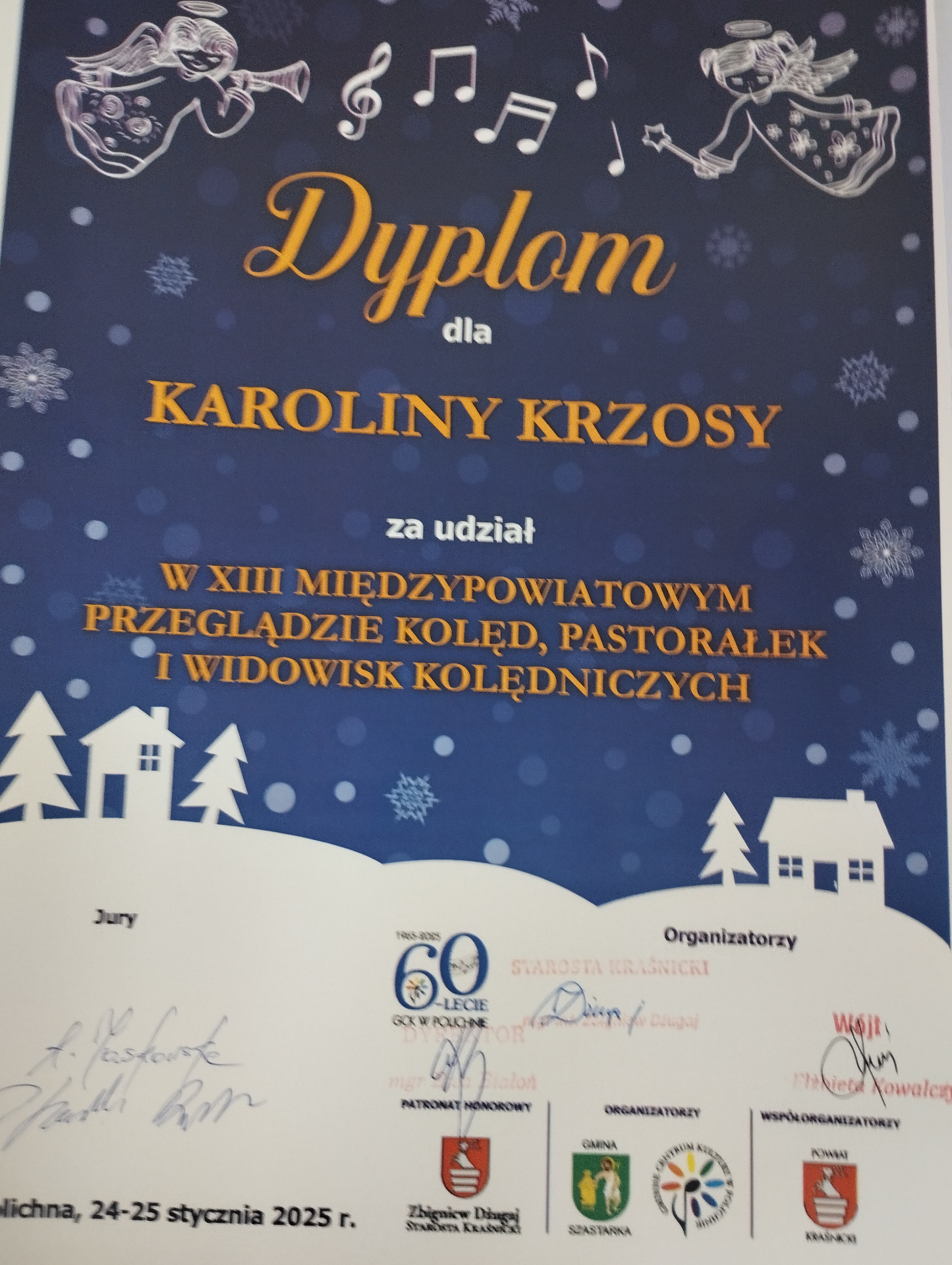 W dniu 24.01.2025 r. odbył się XIII Międzypowiatowy Przegląd Kolęd, Pastorałek i Widowisk Kolędniczych w Gminnym Centrum Kultury w Polichnie. Naszą szkołę reprezentowały uczennice: Wiktoria Zmudziak- kl.5, Oliwia Ptaszek – kl.4, Karolina Krzosa - kl.3, Anna Wcisło – kl.2, Wiktoria Pachla – kl.1 .Dziewczynki pięknie zaśpiewały kolędy, otrzymały dyplomy za udział i słodkie upominki.