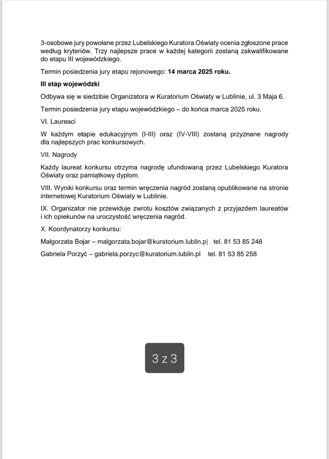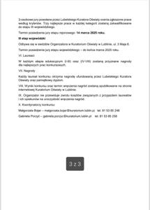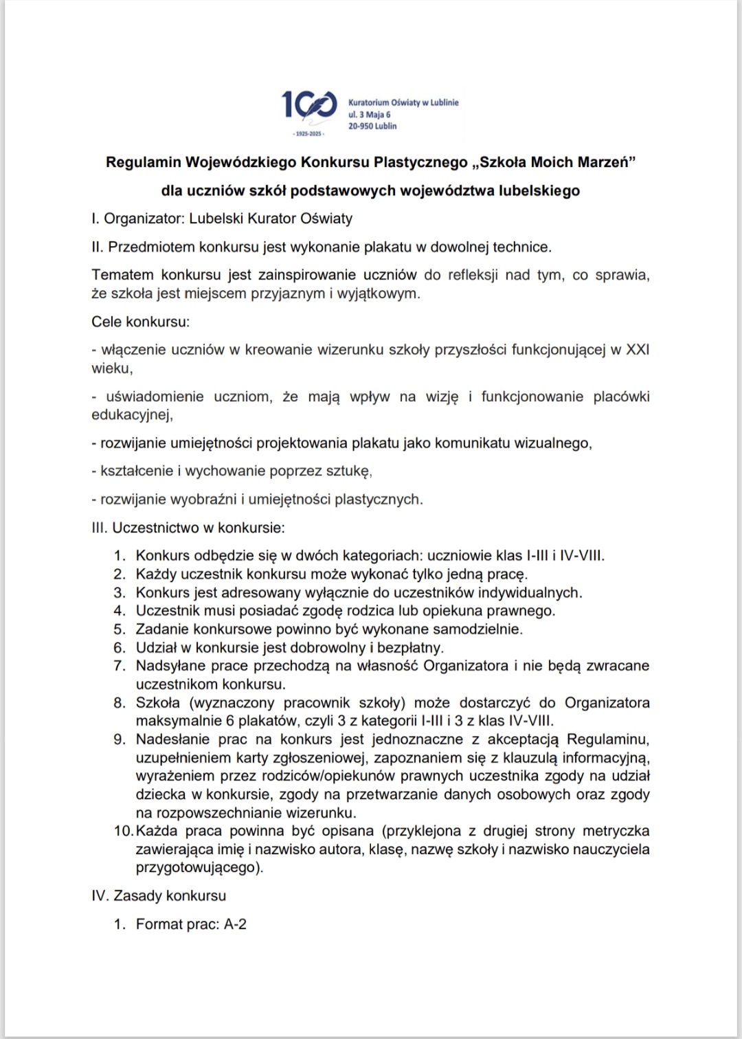 UWAGA! Zachęcamy do udziału w Wojewódzkim Konkursie Plastycznym "Szkoła Moich Marzeń" organizowanym przez Lubelskiego Kuratora Oświaty w Lublinie. Prace należy składać w sekretariacie szkoły do 07.03.2025 r.