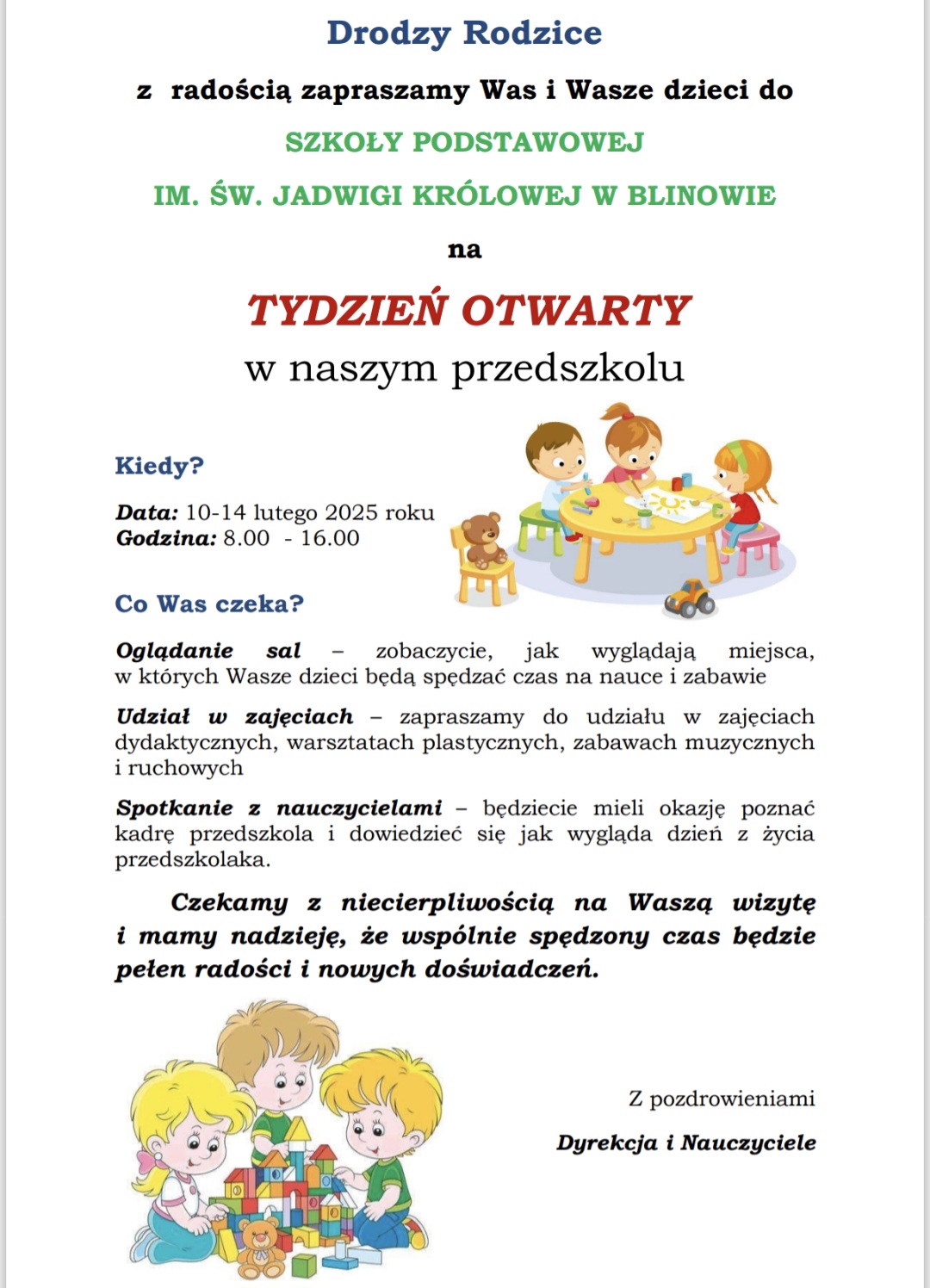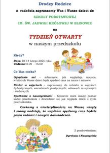 Serdecznie zapraszamy Was i Wasze dzieci na Tydzień Otwarty w naszym przedszkolu!