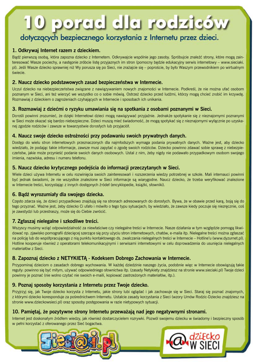 - chroń dzieci przed niebezpieczeństwem w sieci, rozmawiaj z nimi na temat zasad bezpieczeństwa, korzyści i zagrożeń płynących z Internetu,